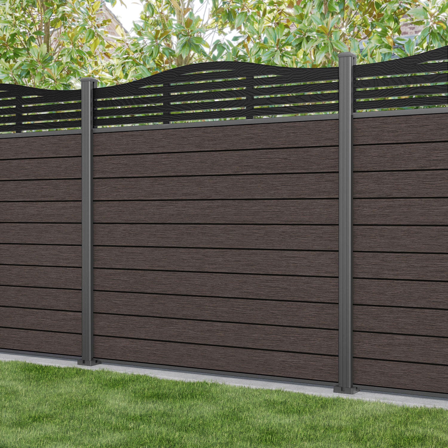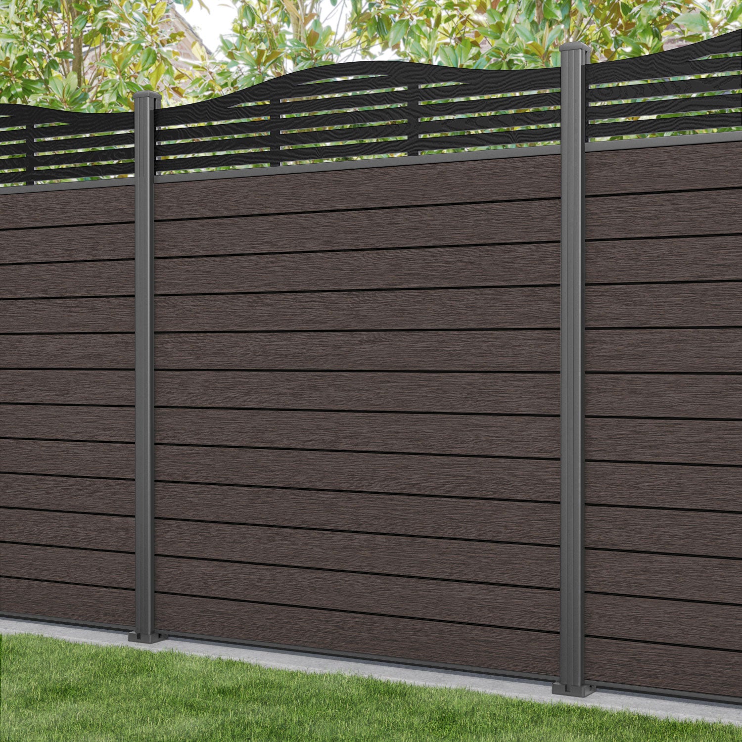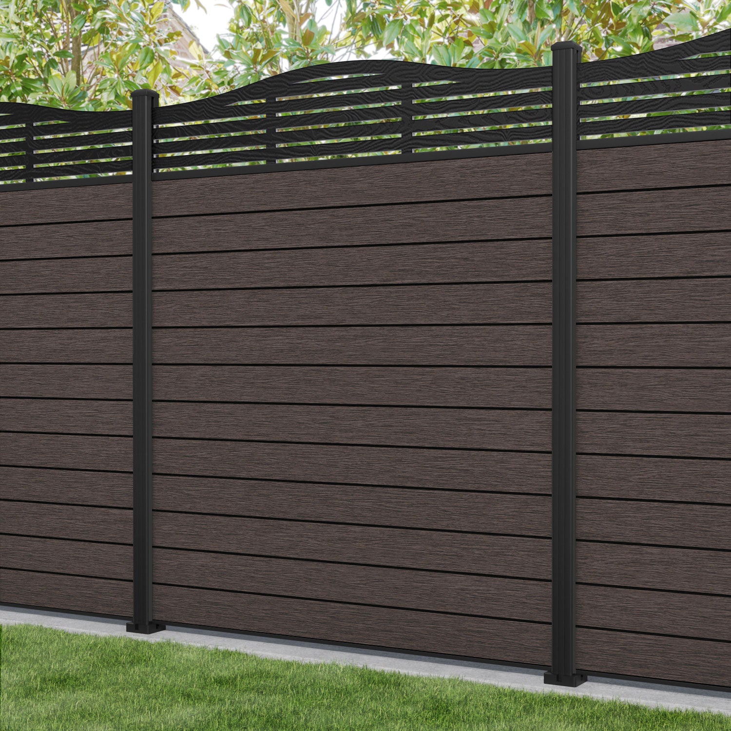 Fusion Aspen Curved Top Fence Panel Mid Brown - with our aluminium posts