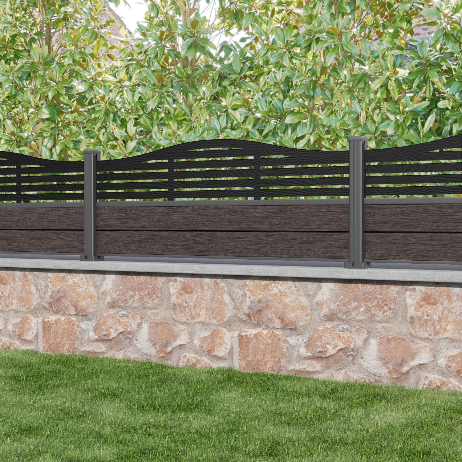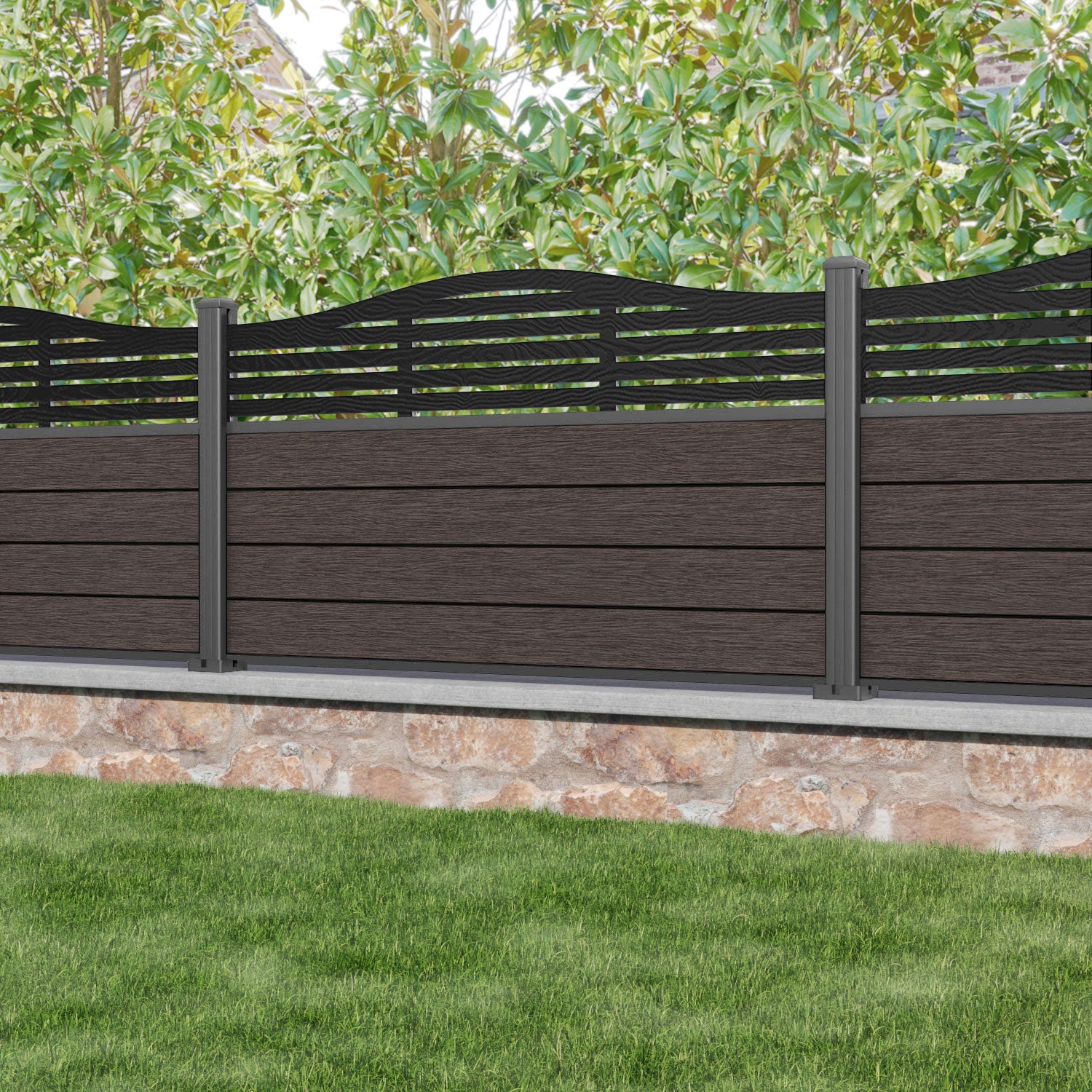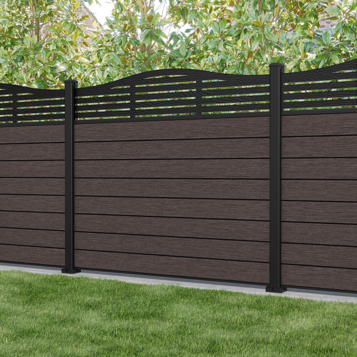 Fusion Aspen Curved Top Fence Panel Mid Brown - with our aluminium posts
