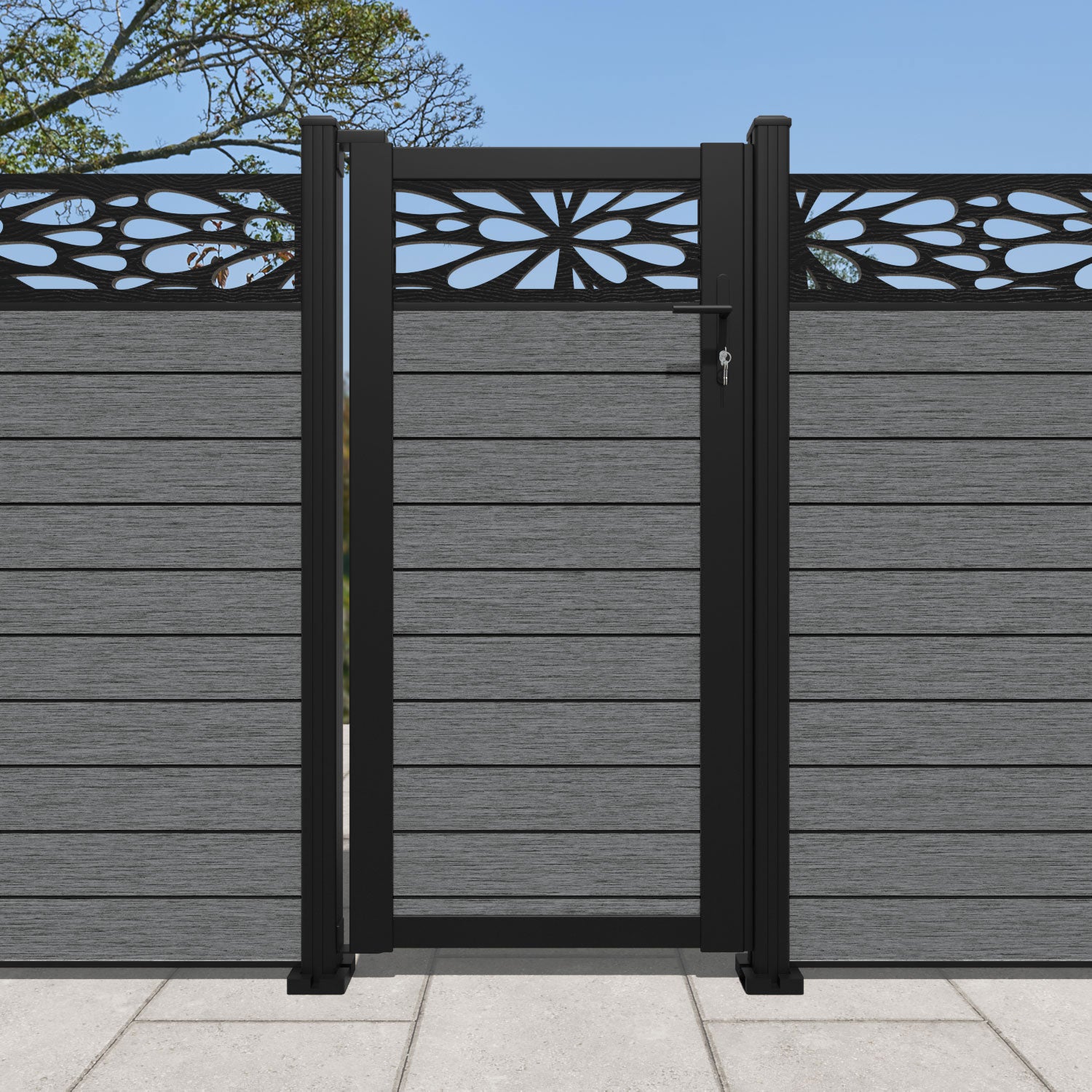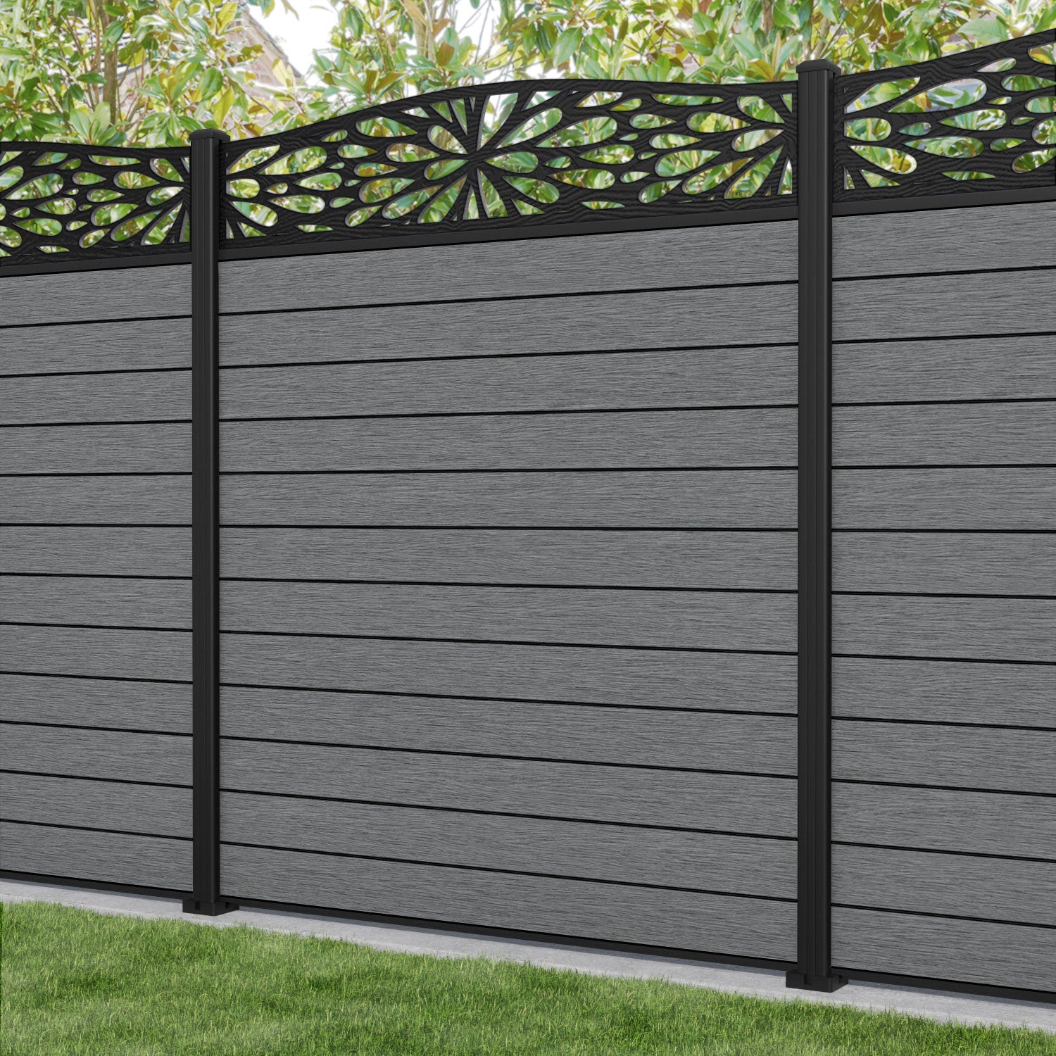 Fusion Blossom Curved Top Fence Panel Mid Grey - with our aluminium posts