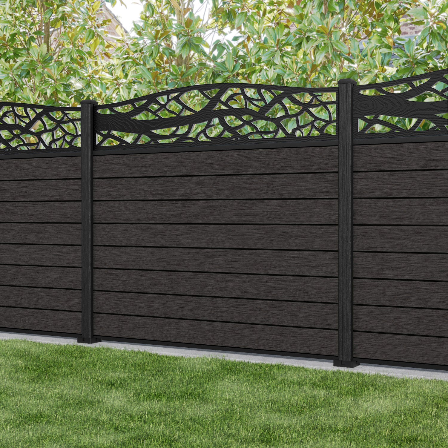 Reference: Fusion Twilight Curved Top Fence Panel - Dark Oak - with our composite posts