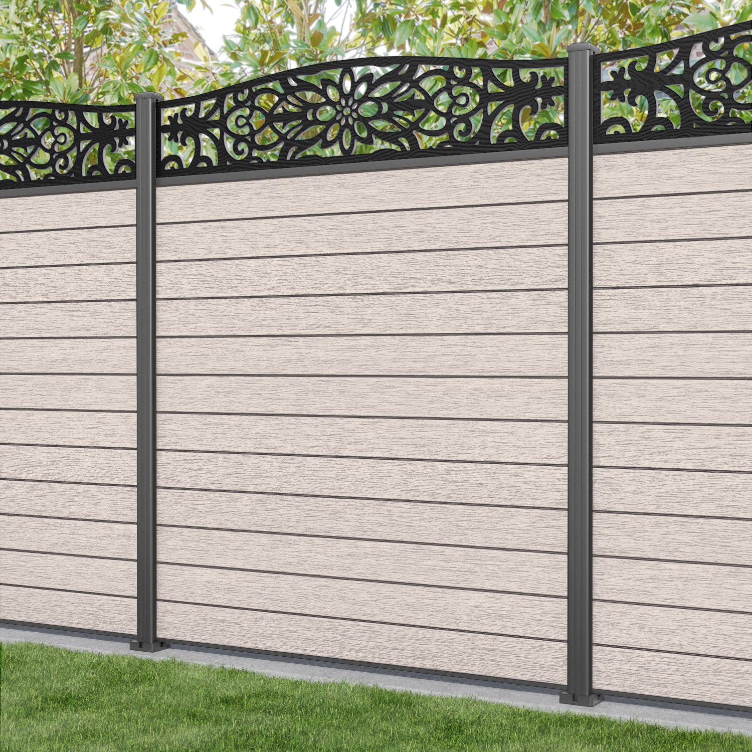 Fusion Windsor Curved Top Fence Panel Mid Stone - with our aluminium posts
