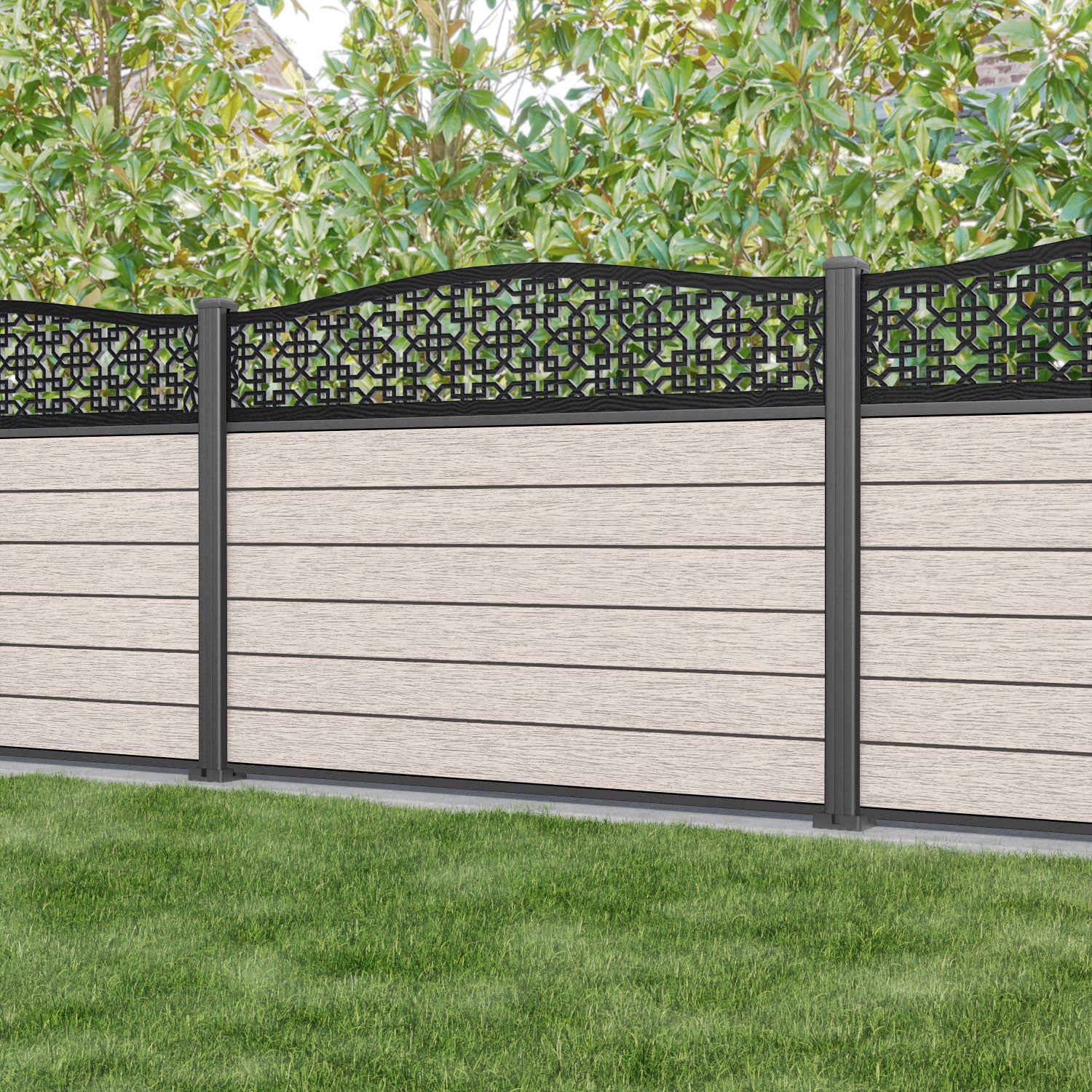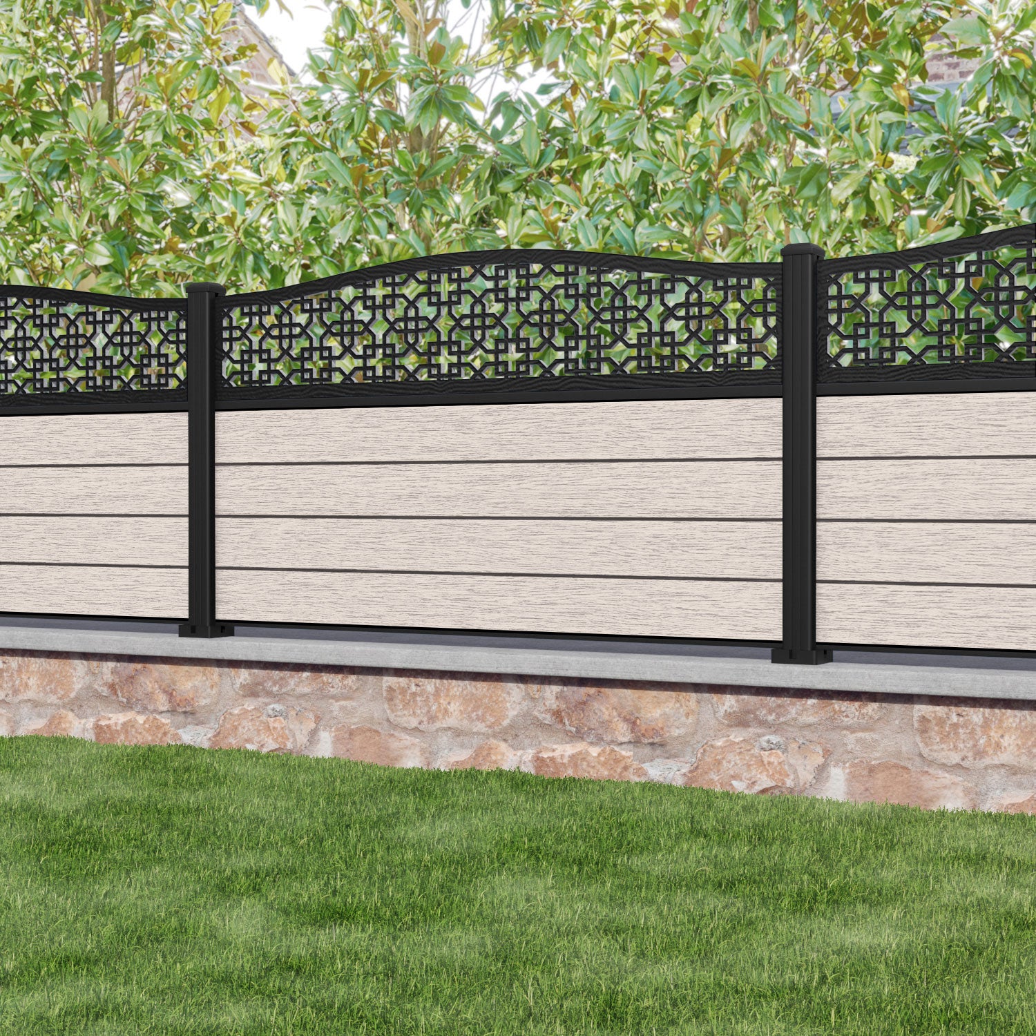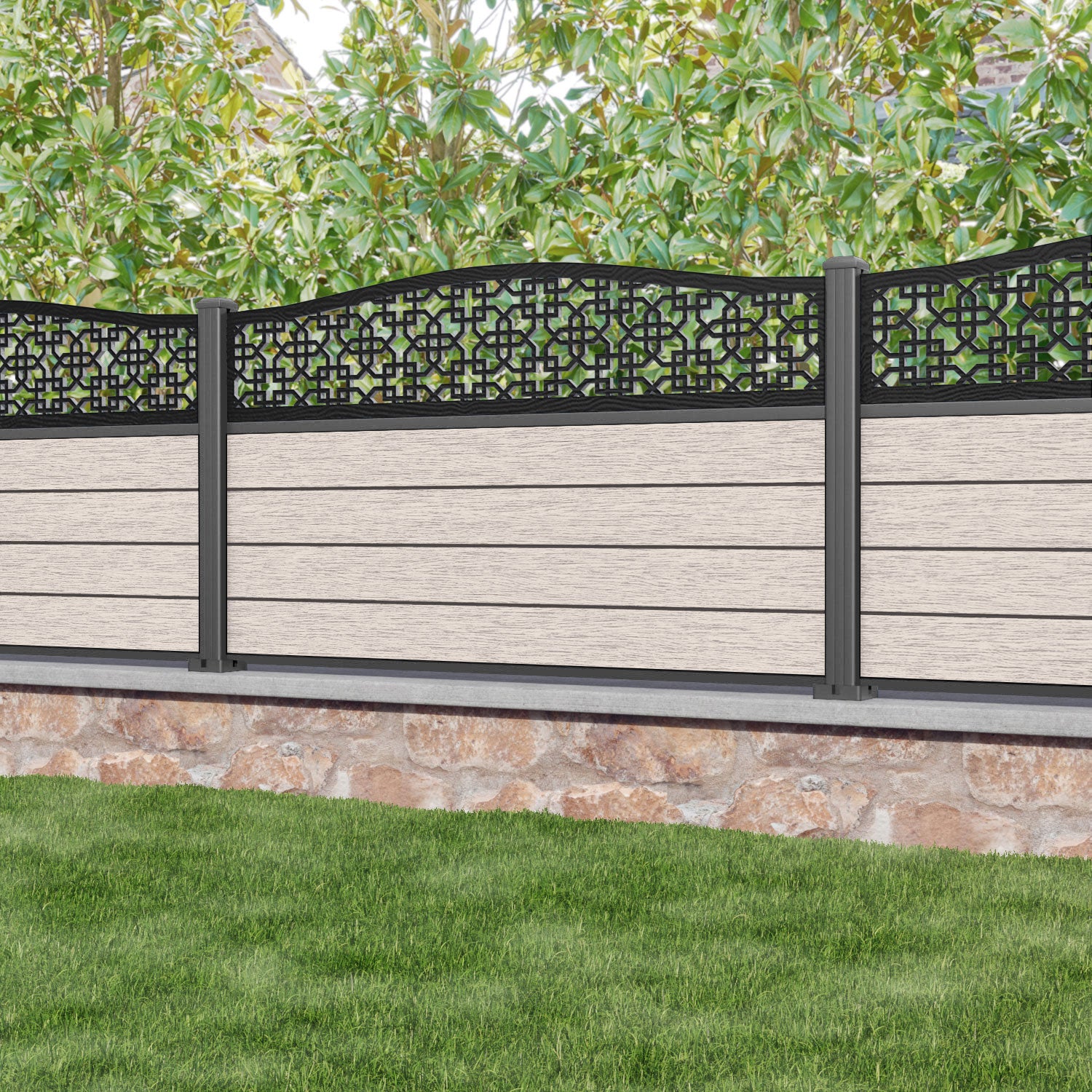 Fusion Zaria Curved Top Fence Panel Mid Stone - with our aluminium posts