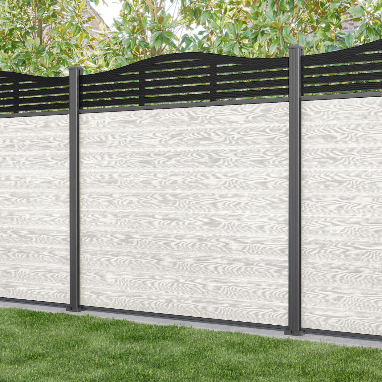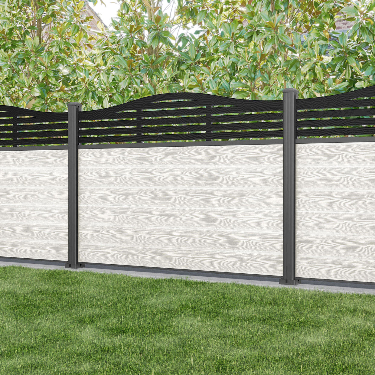 Classic Aspen Curved Top Fence Panel Light Stone - with our aluminium posts