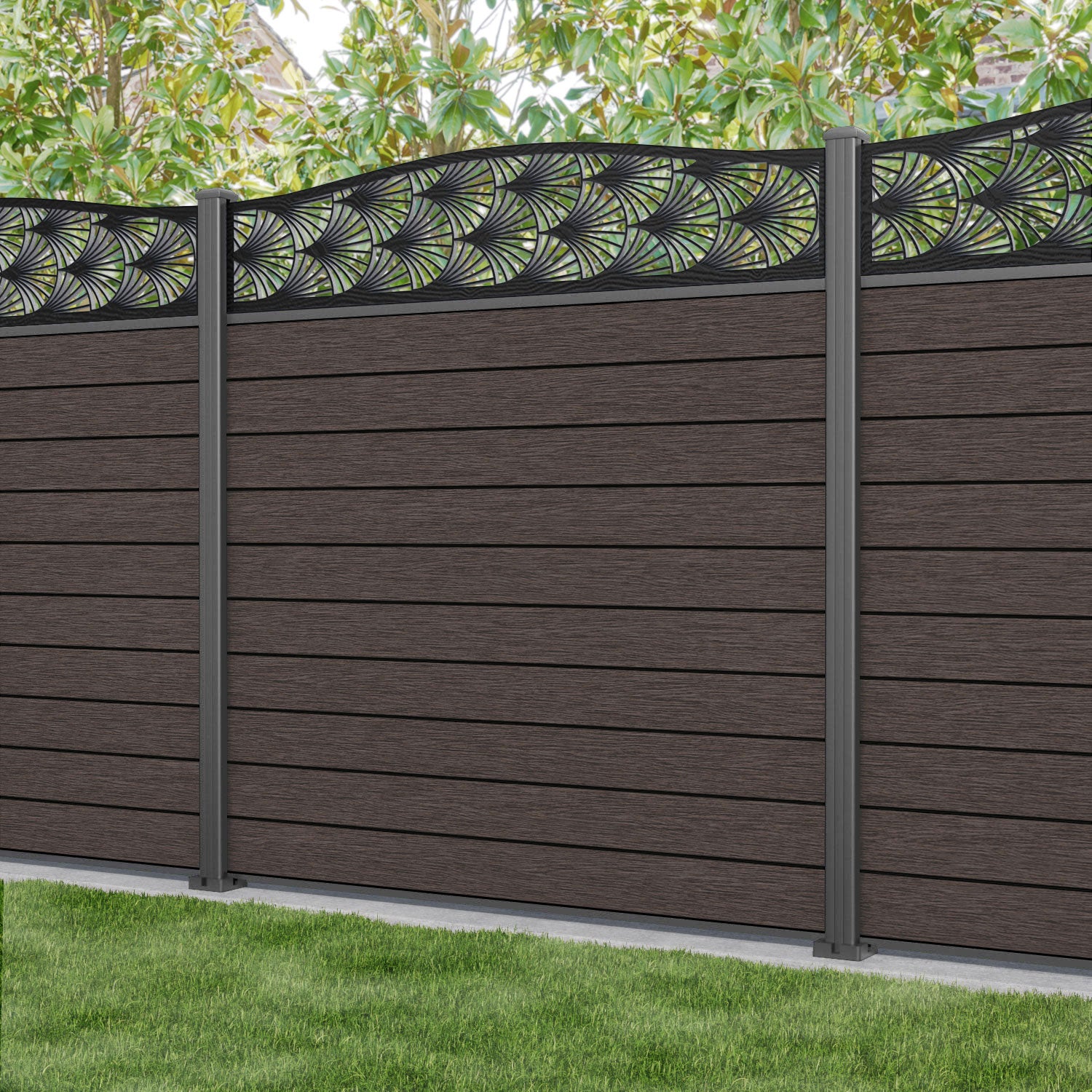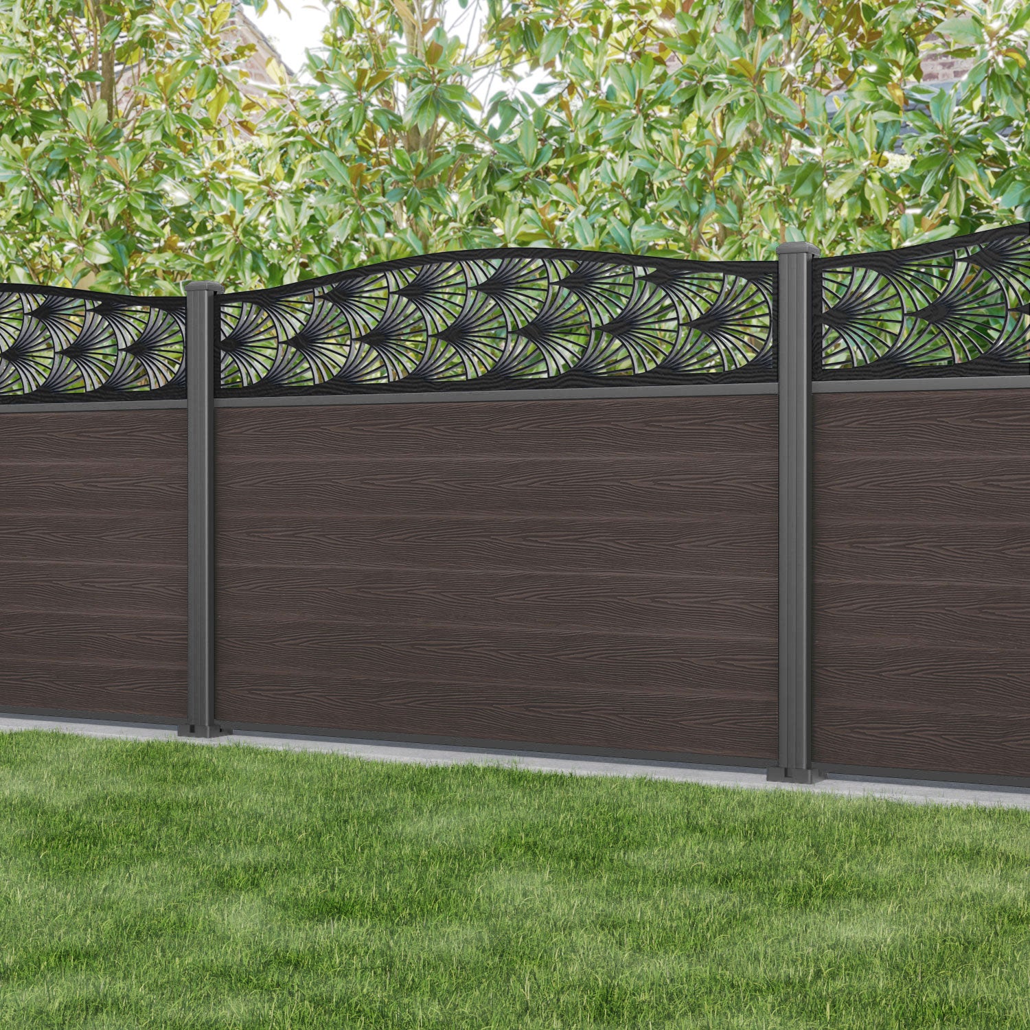 Fusion Laurel Curved Top Fence Panel Mid Brown - with our aluminium posts