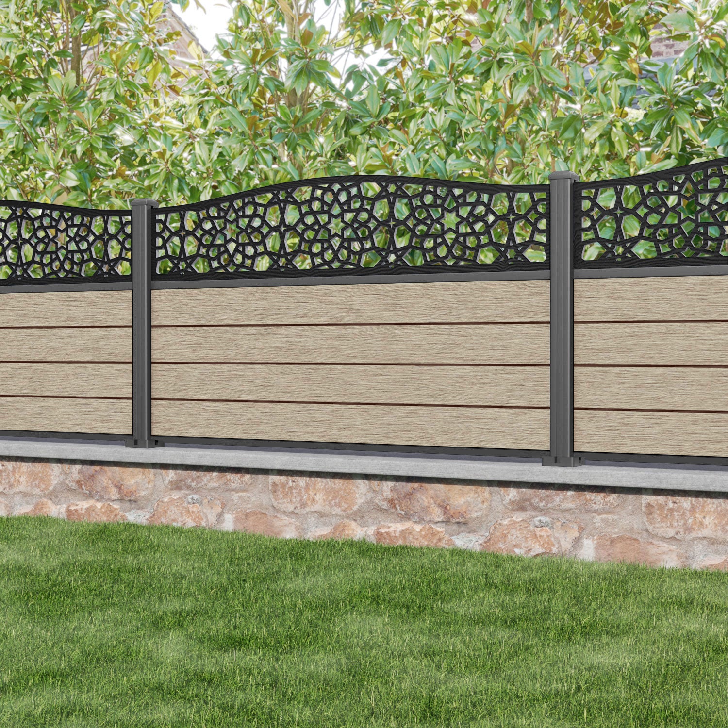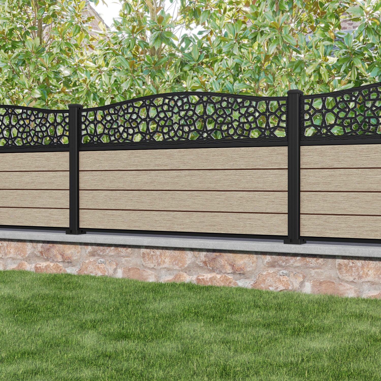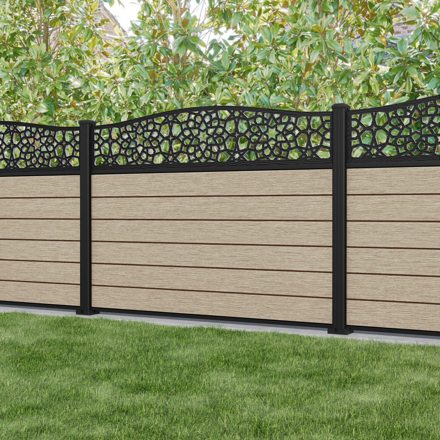 Fusion Nazira Curved Top Fence Panel Light Oak - with our aluminium posts