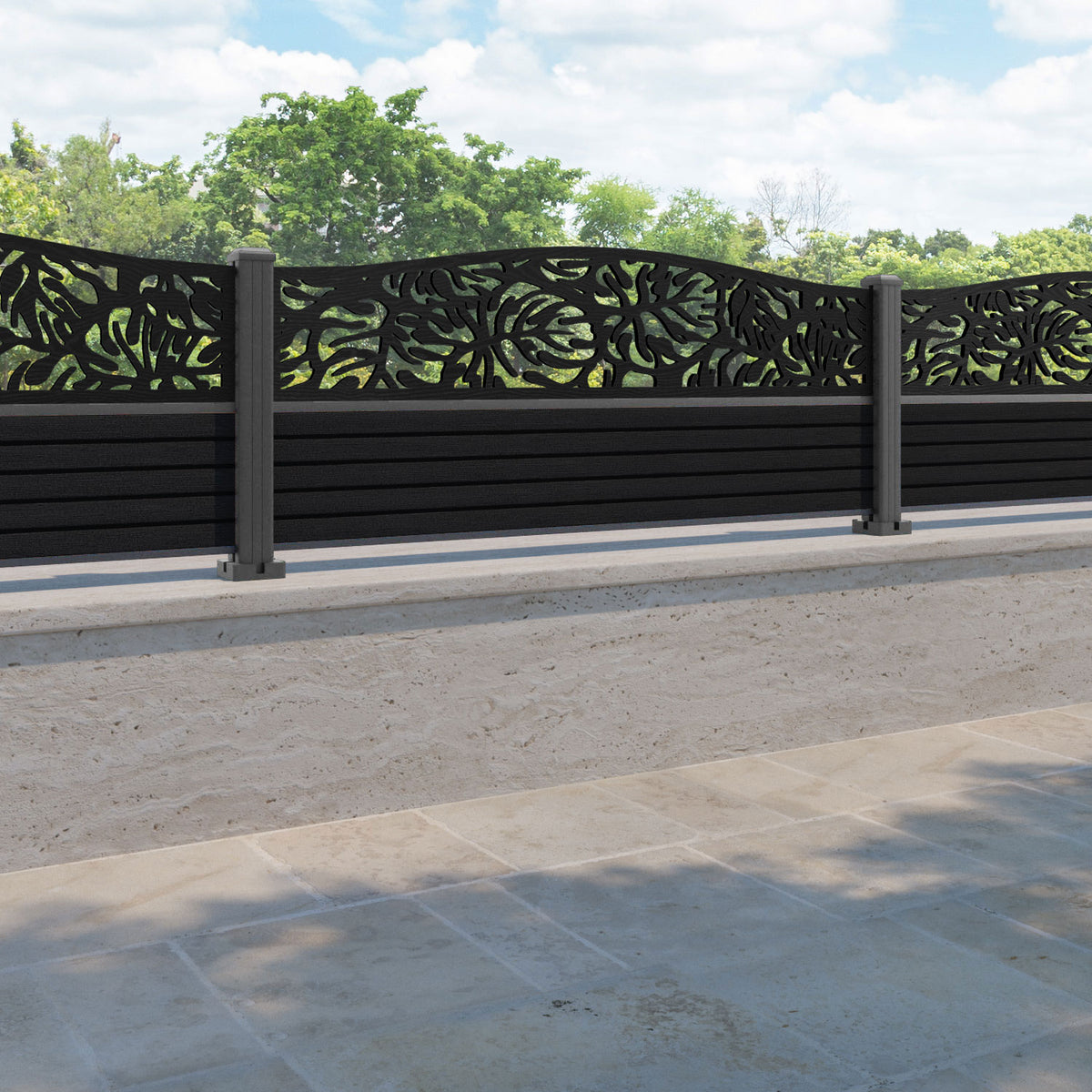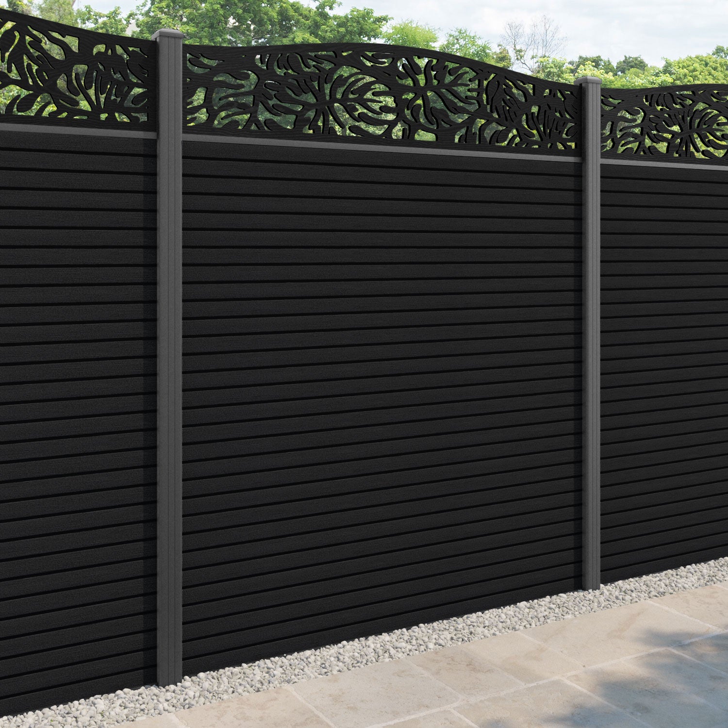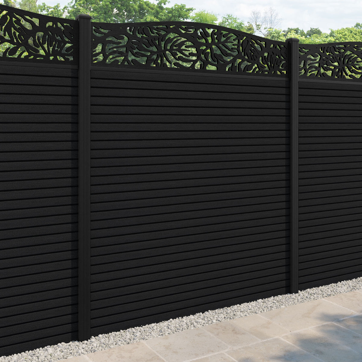 Hudson Botanic Curved Top Fence Panel Black - with our aluminium posts