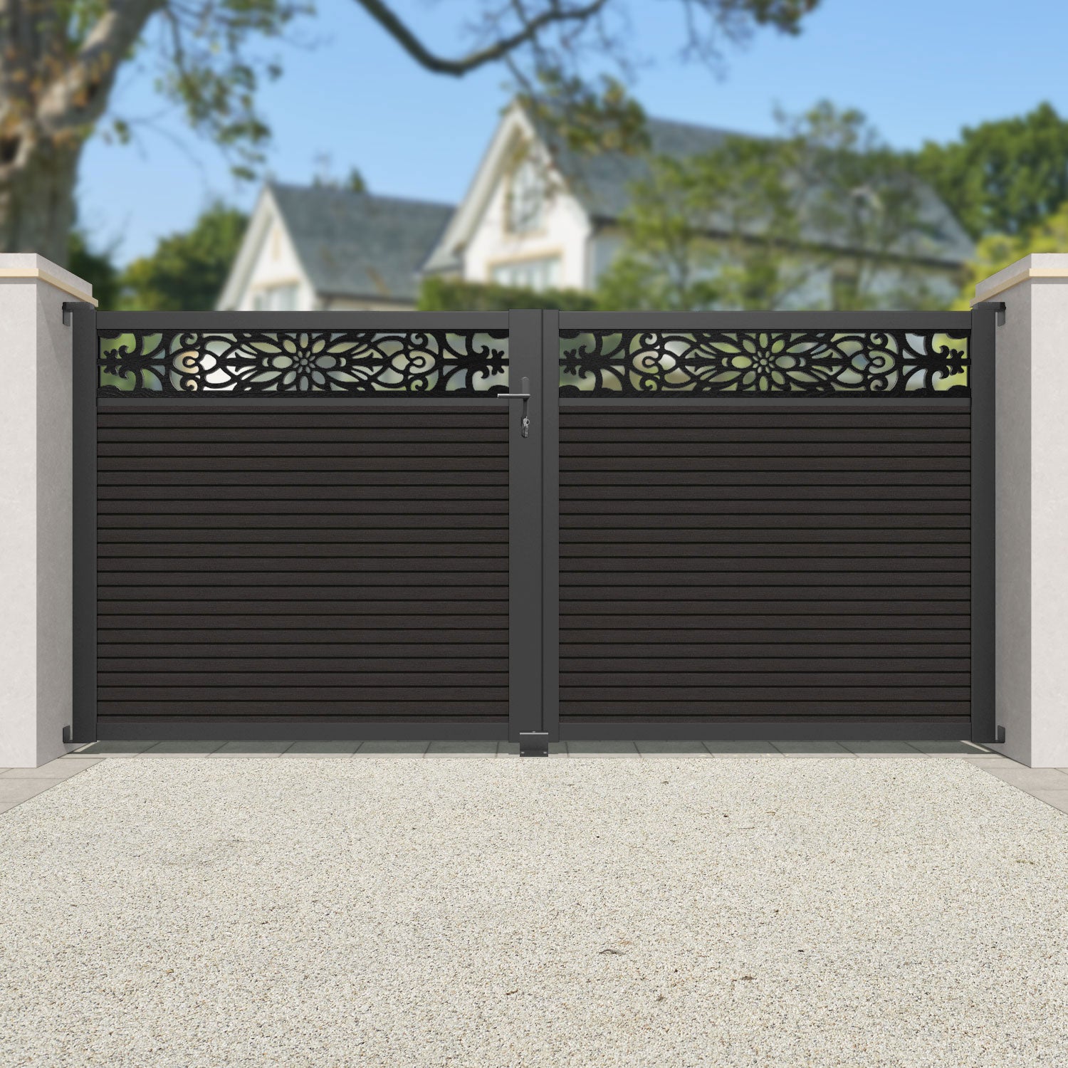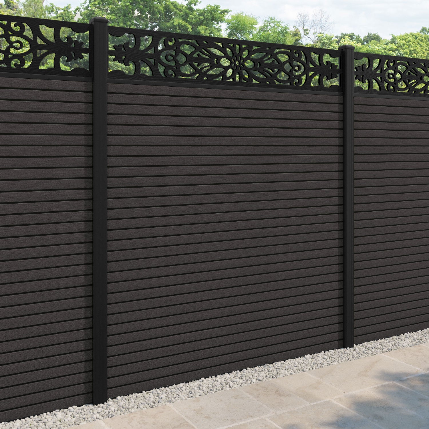 Our 18mm thick dark oak premium composite fence slats paired with our high-grade aluminium fence posts and Windsor screen create an elegant, versatile, and eco-friendly fencing solution. Not only is this fencing responsibly sourced, it is also durable, long-lasting and requires no maintenance or painting.