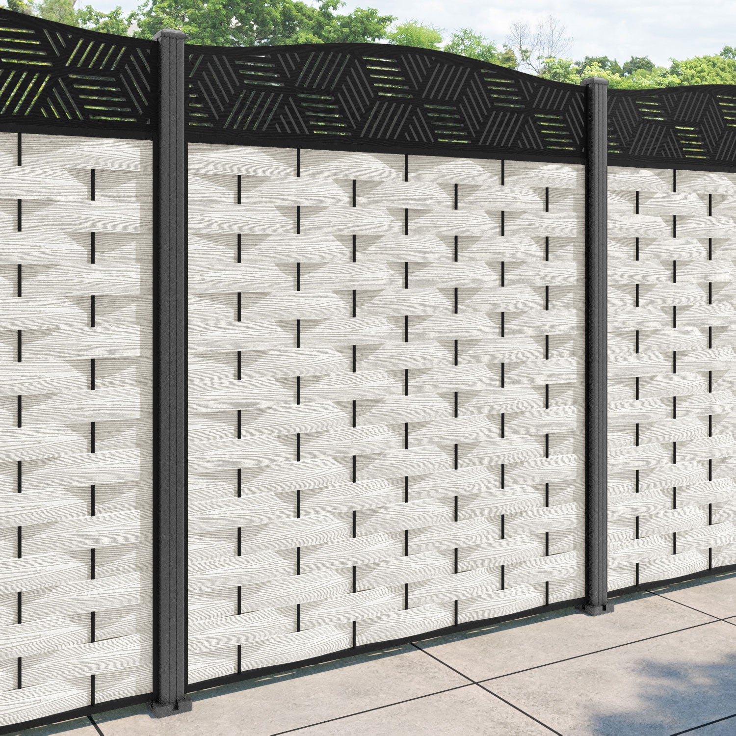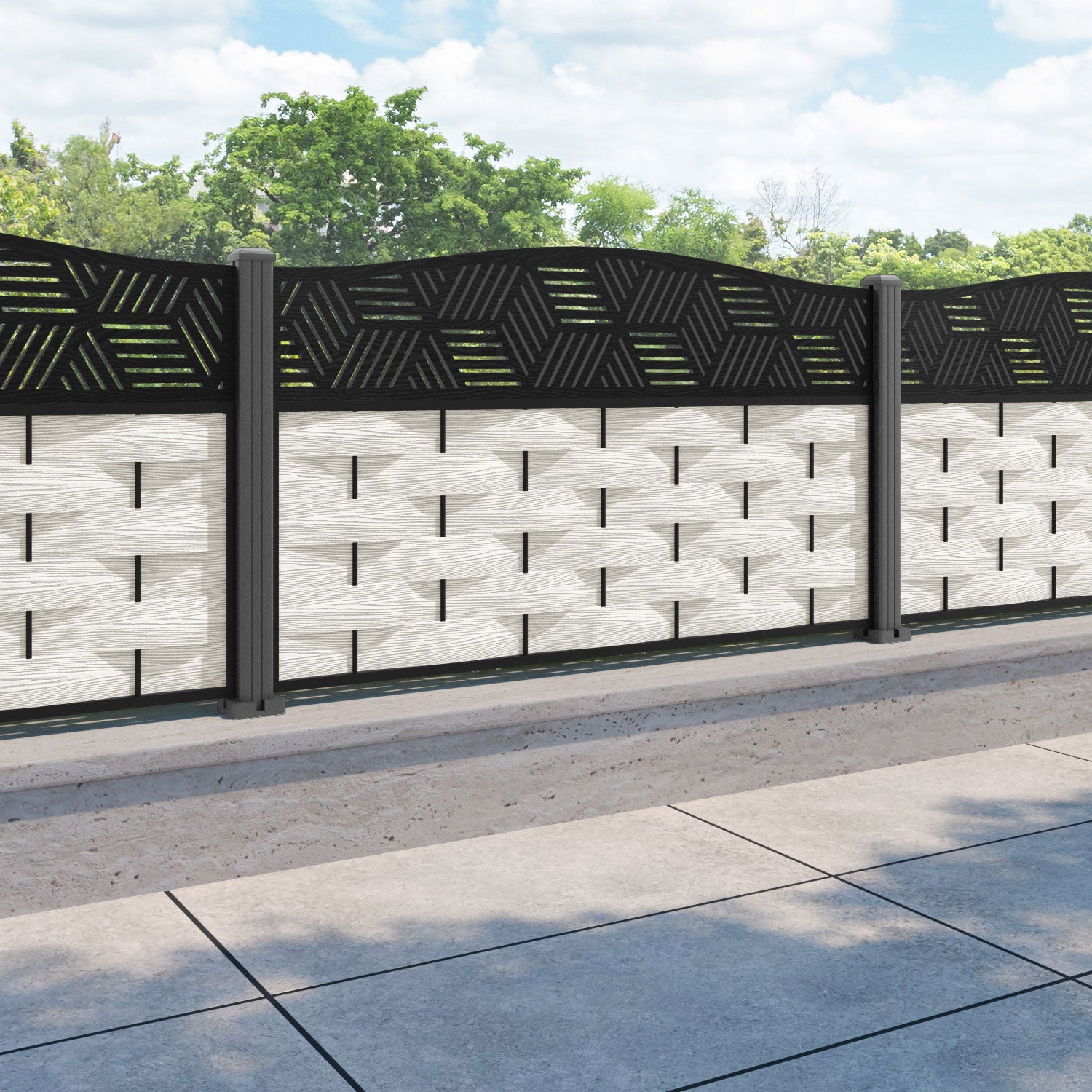Ripple Cubed Curved Top Fence Panel - Light Stone - with our aluminium posts