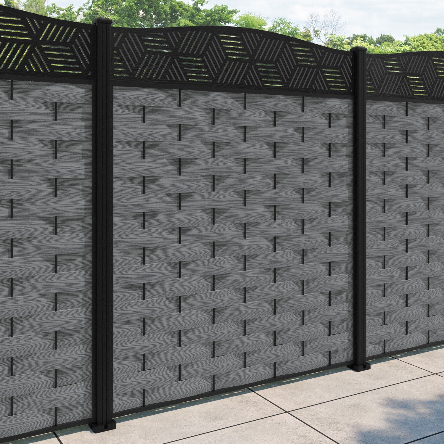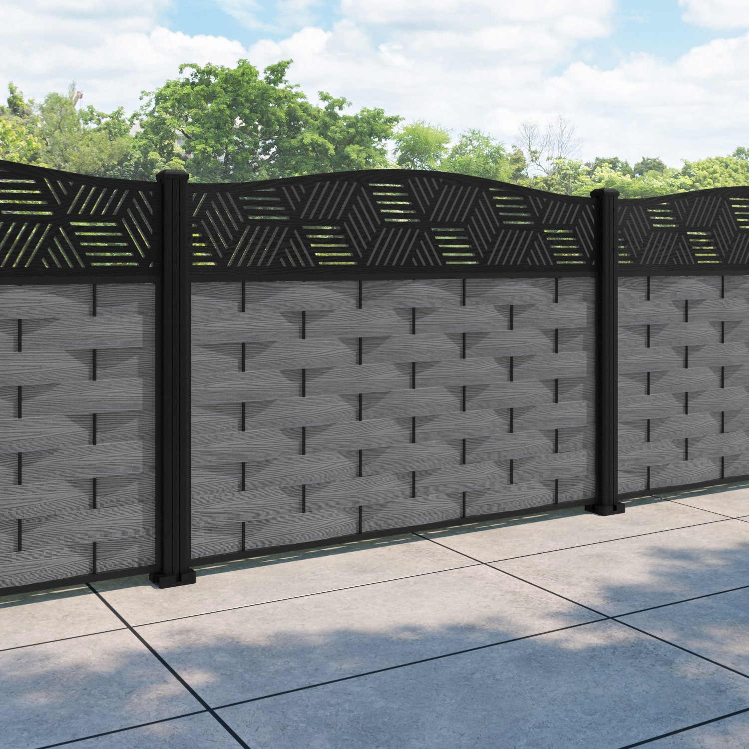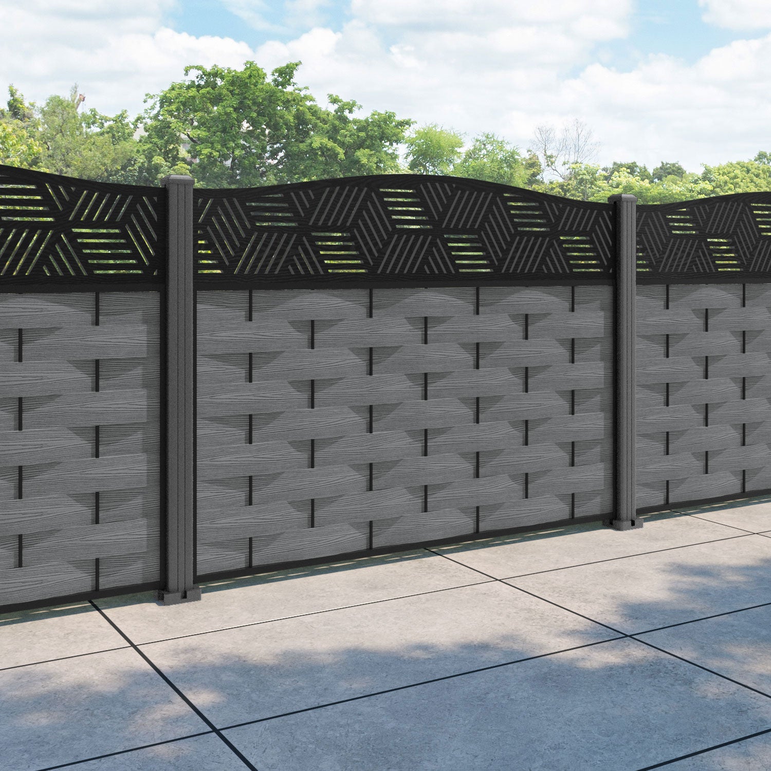 Reference: Ripple Cubed Curved Top Fence Panel - Mid Grey - with our aluminium posts