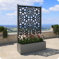 The planters are available in 6 different sizes and can be paired with any of our decorative screens that are available in 5 different colour options. The screens can be fixed at the back or in the centre of the planter. The centre option enables you to plant on both sides of the screen. They can also be ordered with a wheeled base for convenience, with lockable wheels for stability.