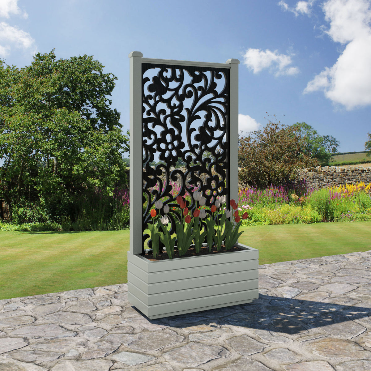 The planters are available in 6 different sizes and can be paired with any of our decorative screens that are available in 5 different colour options. The screens can be fixed at the back or in the centre of the planter. The centre option enables you to plant on both sides of the screen. They can also be ordered with a wheeled base for convenience, with lockable wheels for stability.