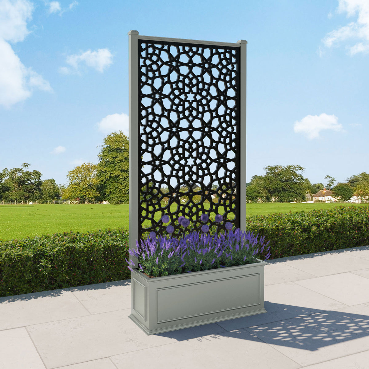 The planters are available in 6 different sizes and can be paired with any of our decorative screens that are available in 5 different colour options. The screens can be fixed at the back or in the centre of the planter. The centre option enables you to plant on both sides of the screen. They can also be ordered with a wheeled base for convenience, with lockable wheels for stability.