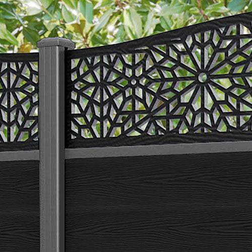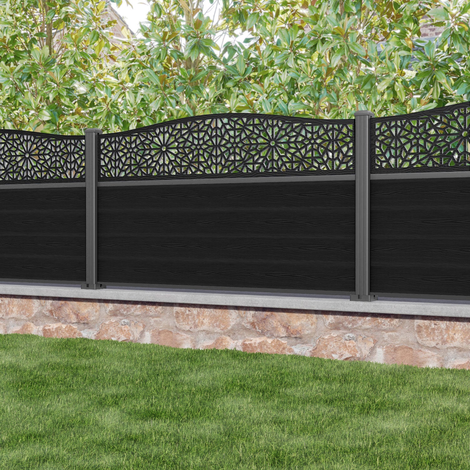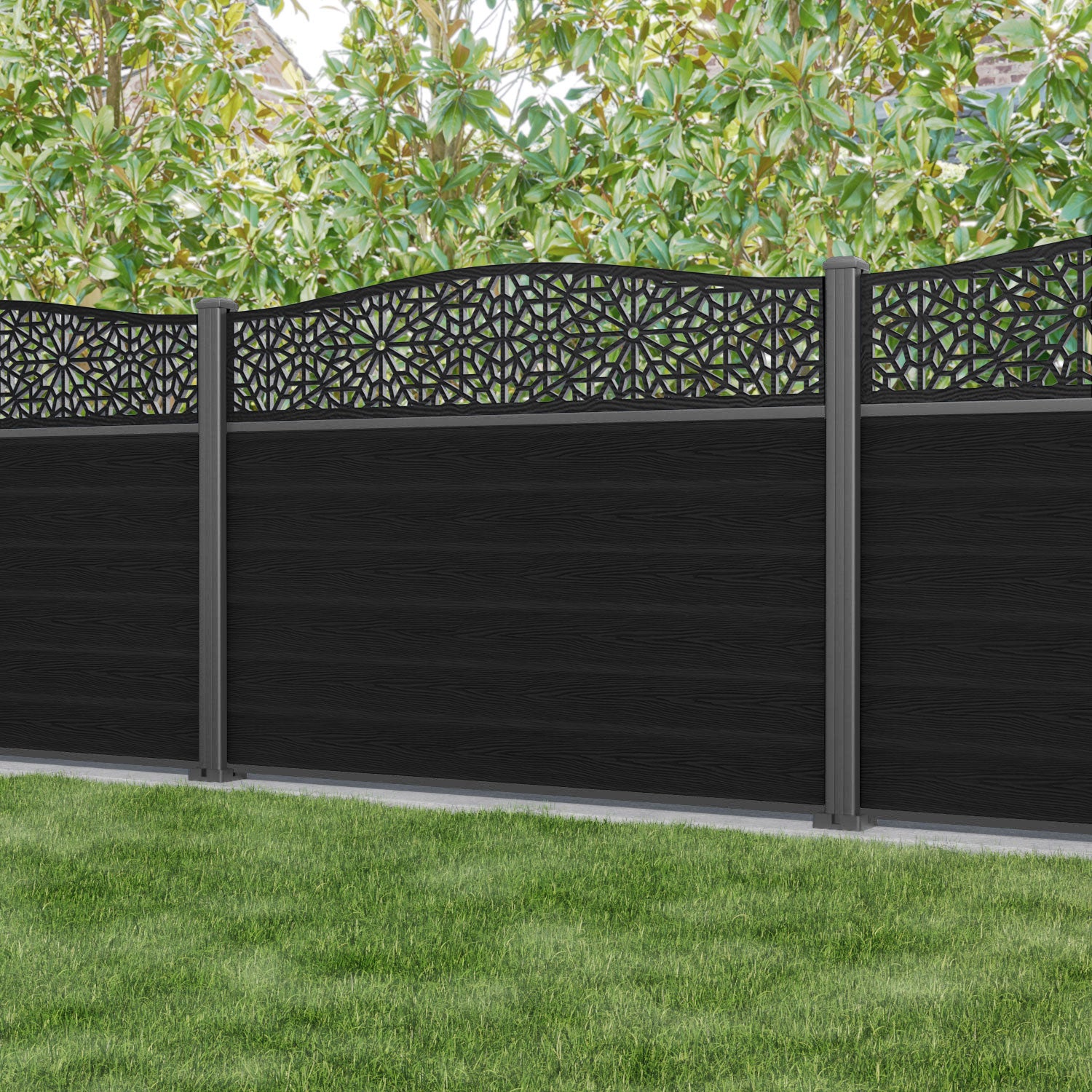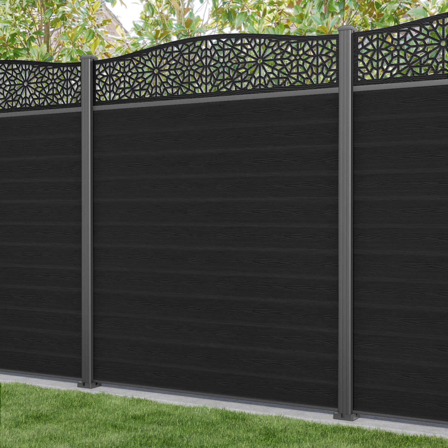 Classic Alnara Curved Top Fence Panel Black - with our aluminium posts