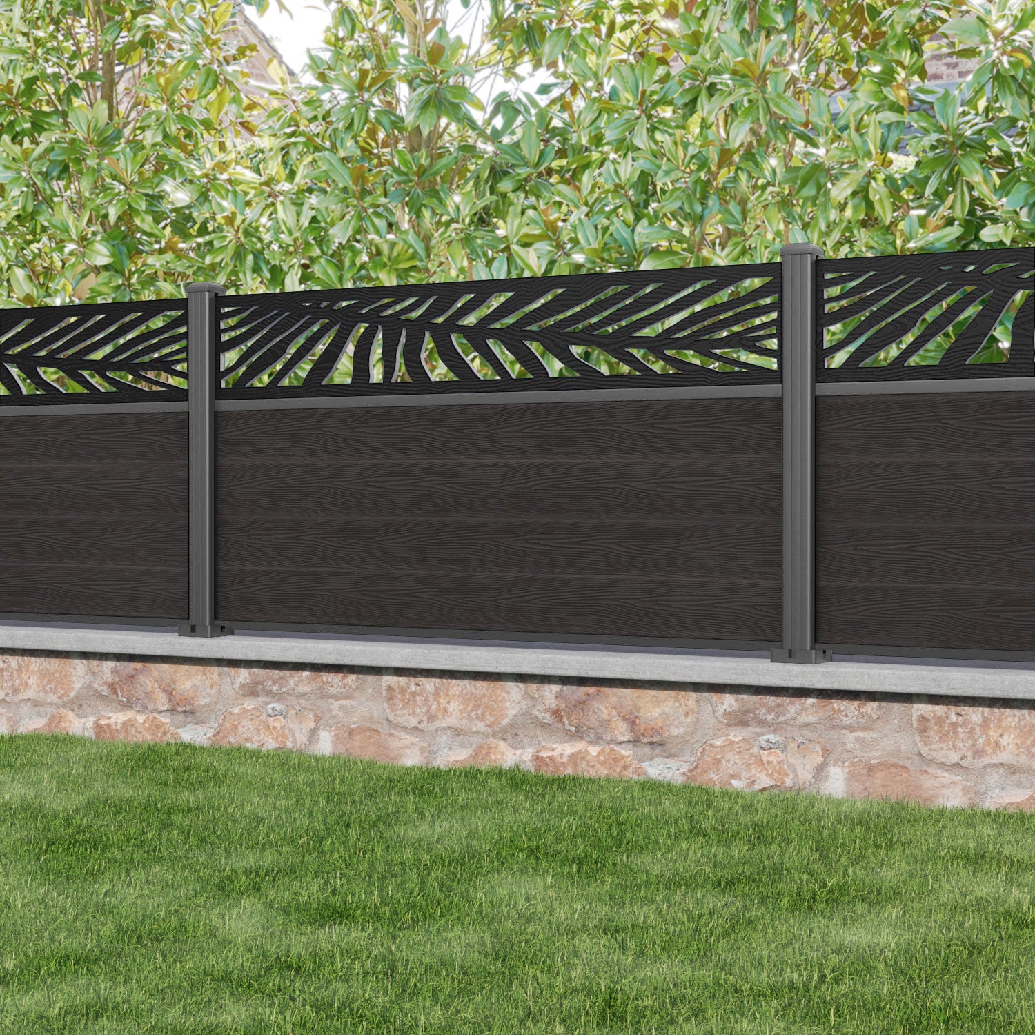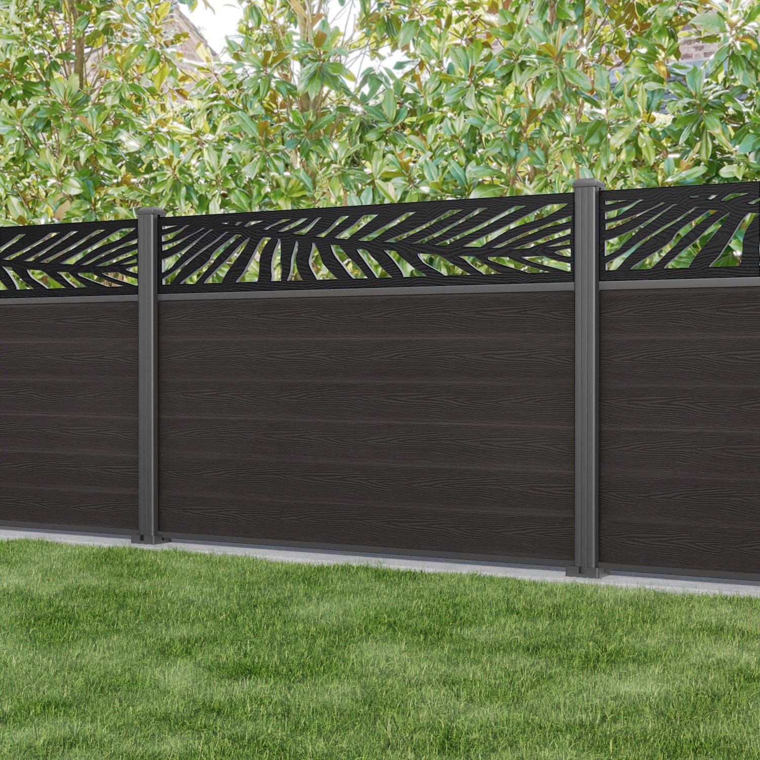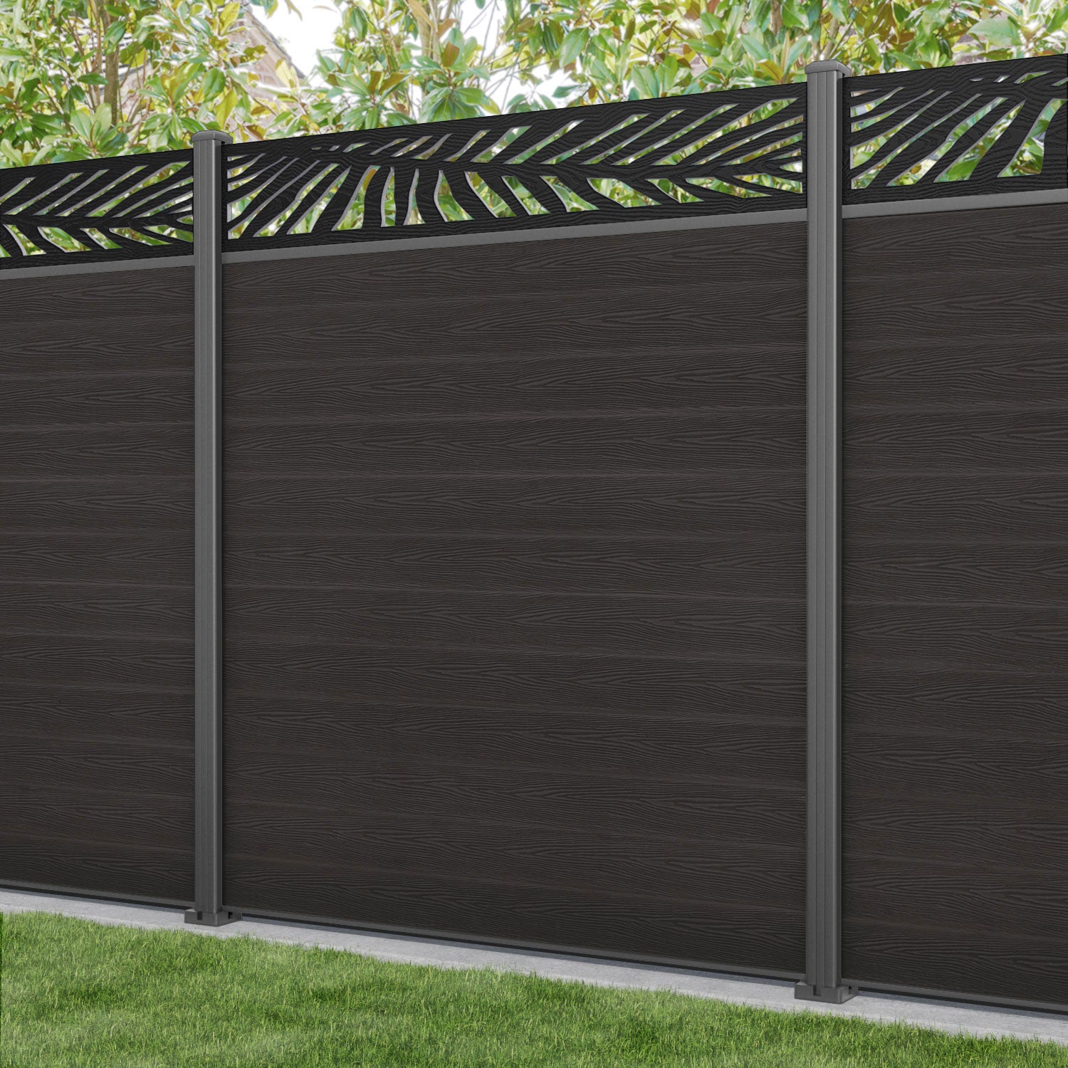 Classic Palm Fence Panel Dark Oak - with our aluminium posts
