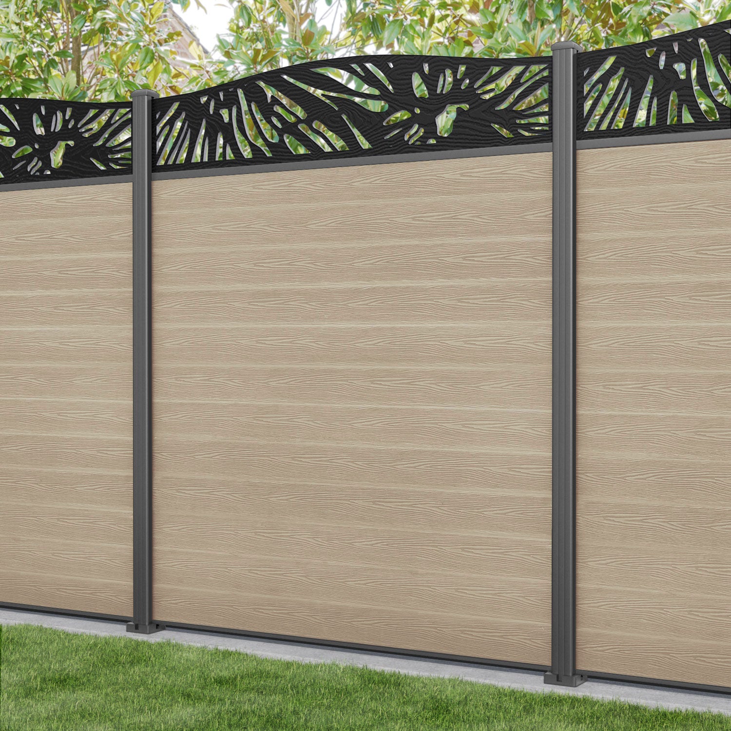 Classic Poppy Curved Top Fence Panel Light Oak - with our aluminium posts