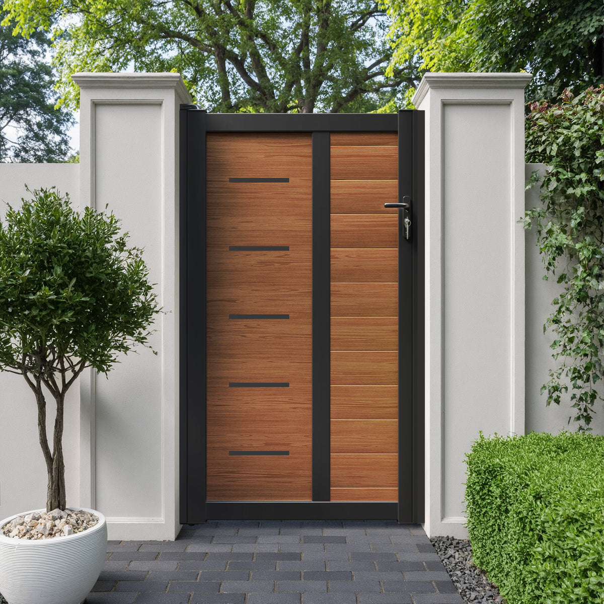 Pair your gate with our eco-friendly composite or aluminium slats for a seamless match to our fencing collections, ensuring a stylish and cohesive look.