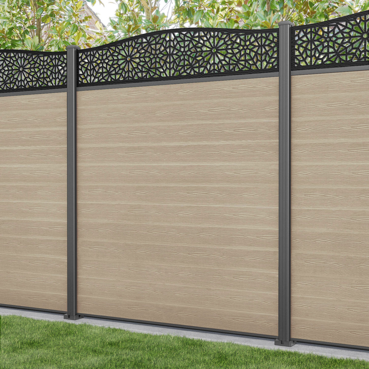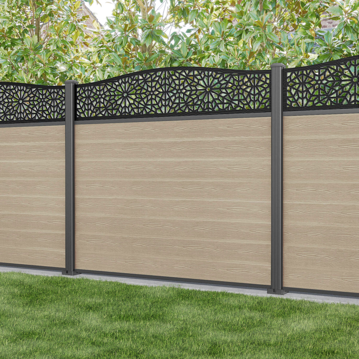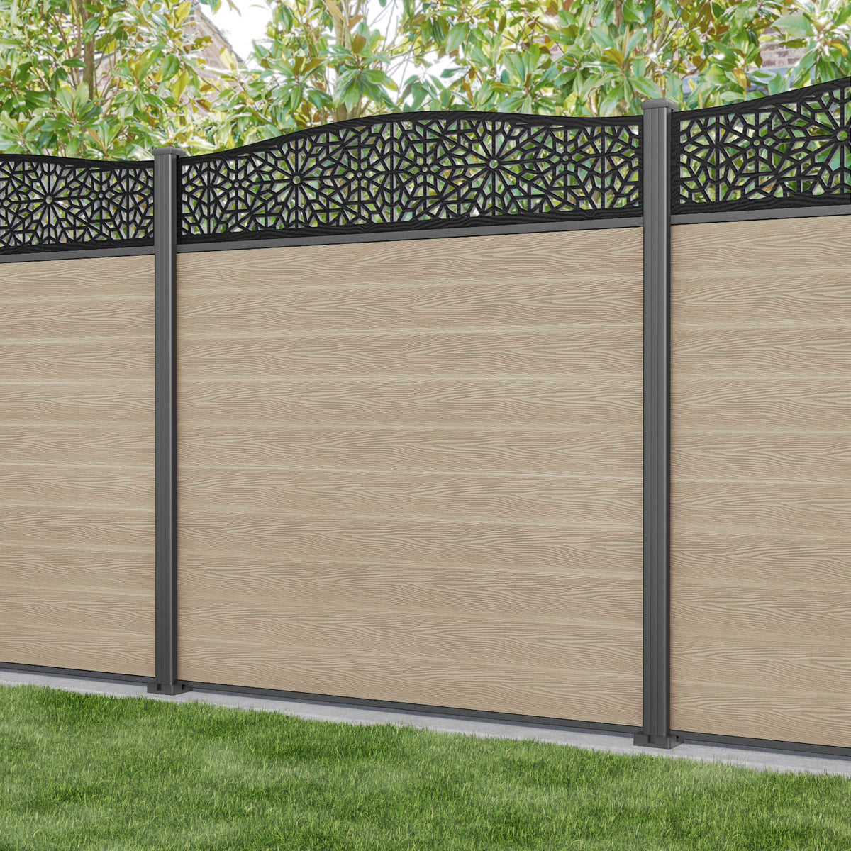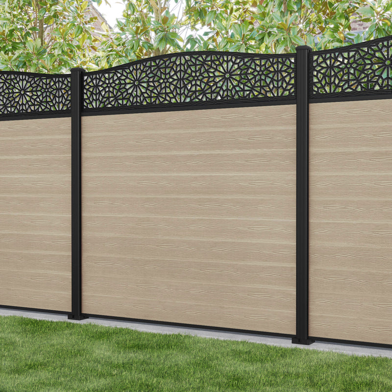 Classic Alnara Curved Top Fence Panel Light Oak - with our aluminium posts