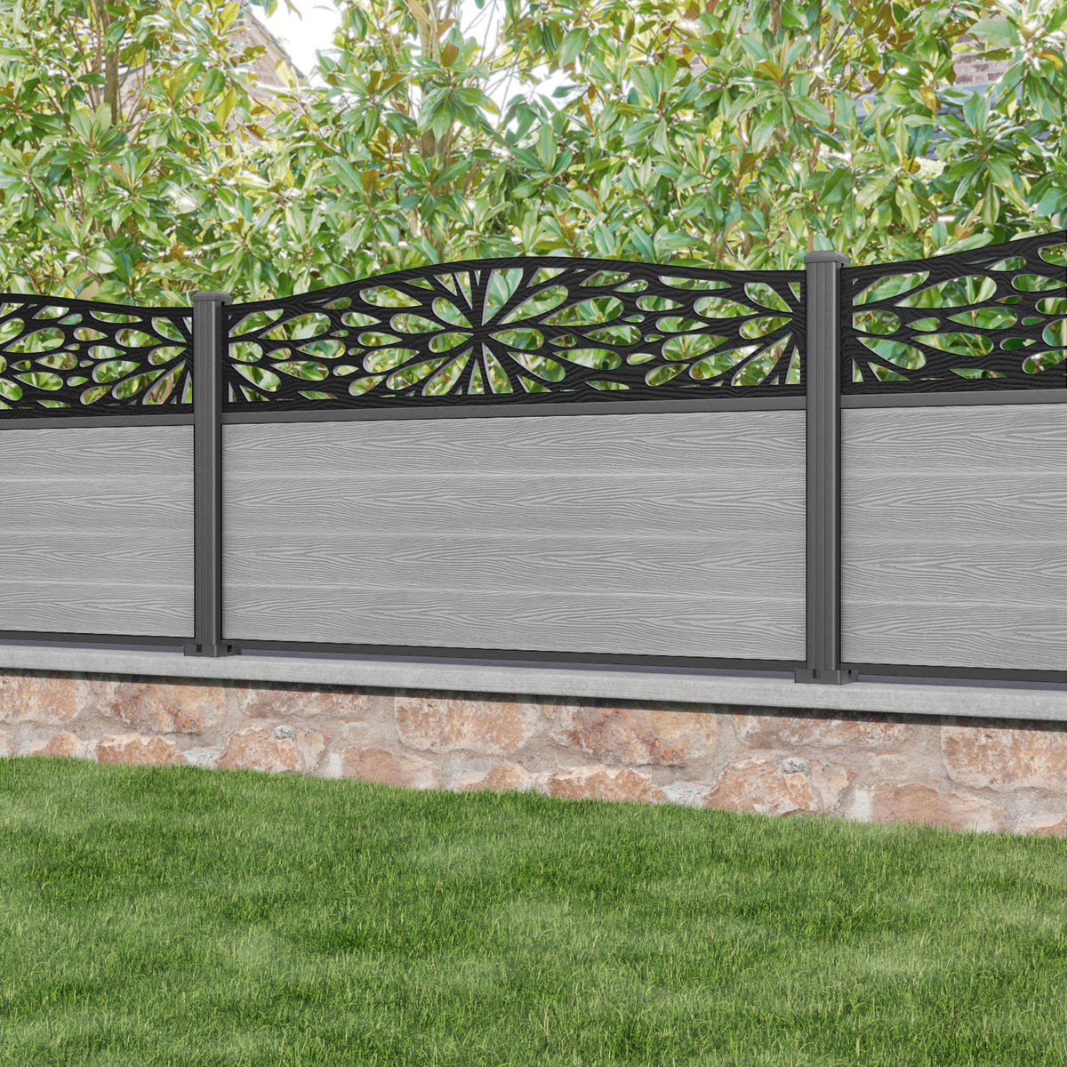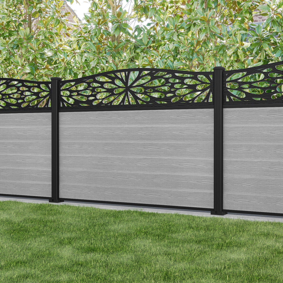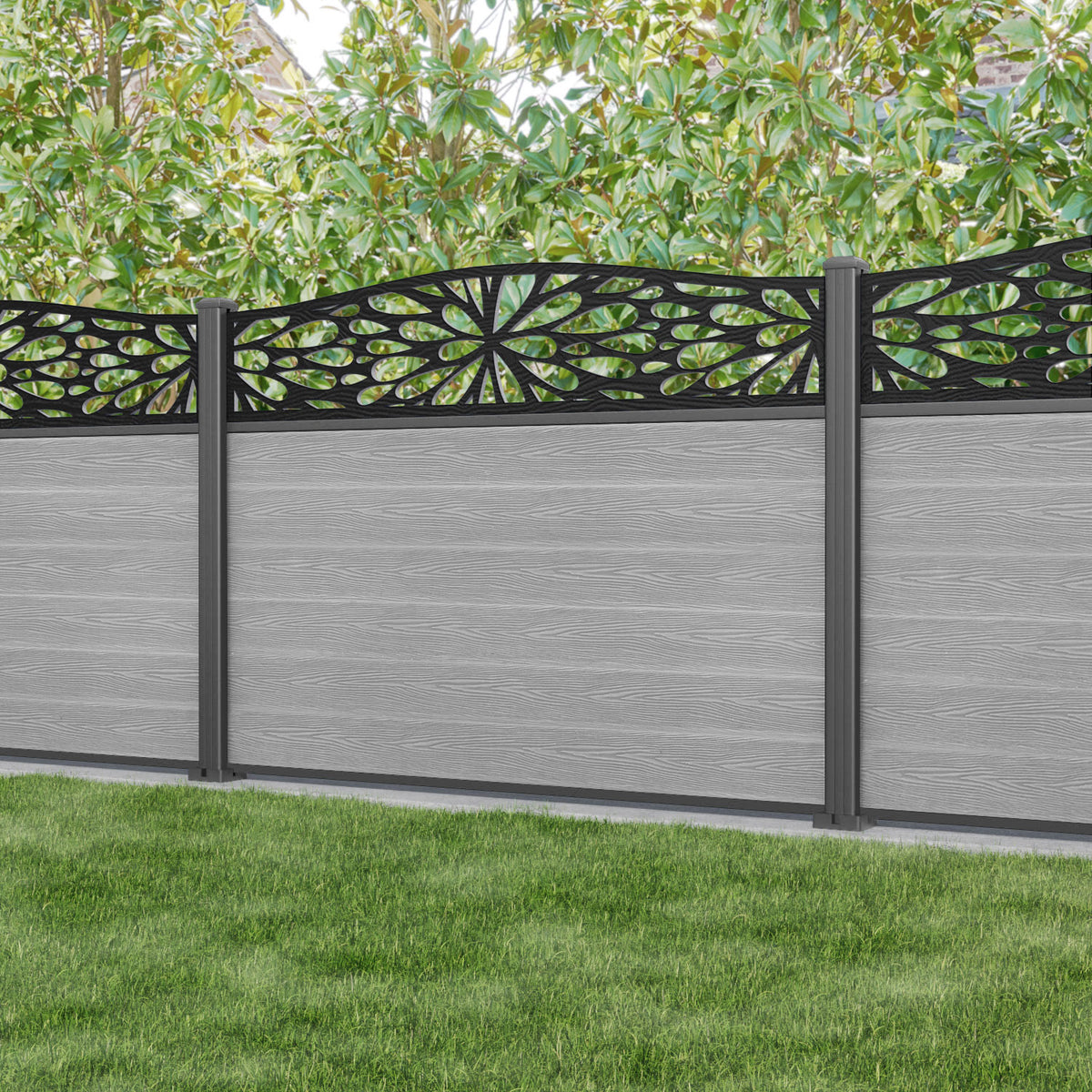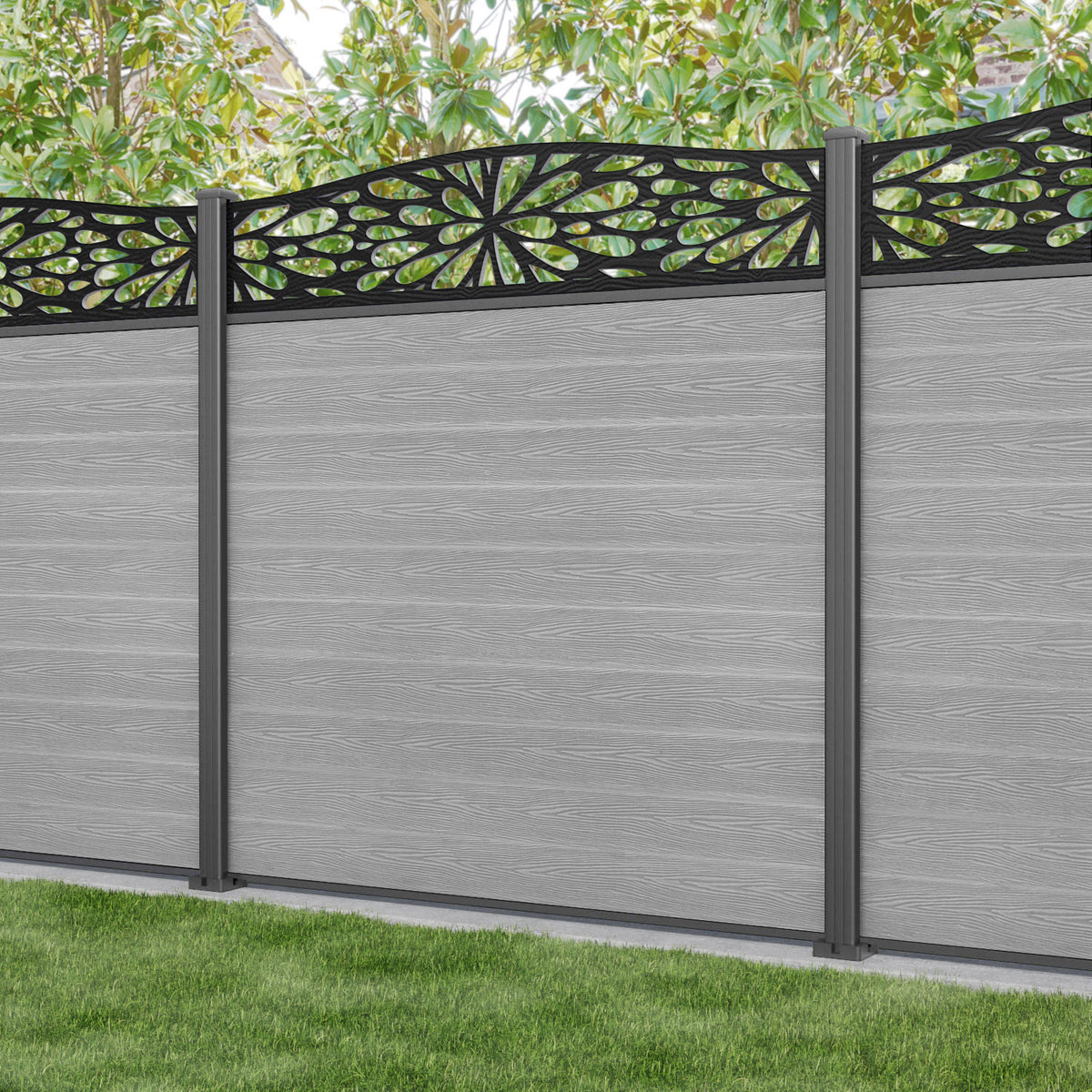 Classic Blossom Curved Top Fence Panel Light Grey - with our aluminium posts