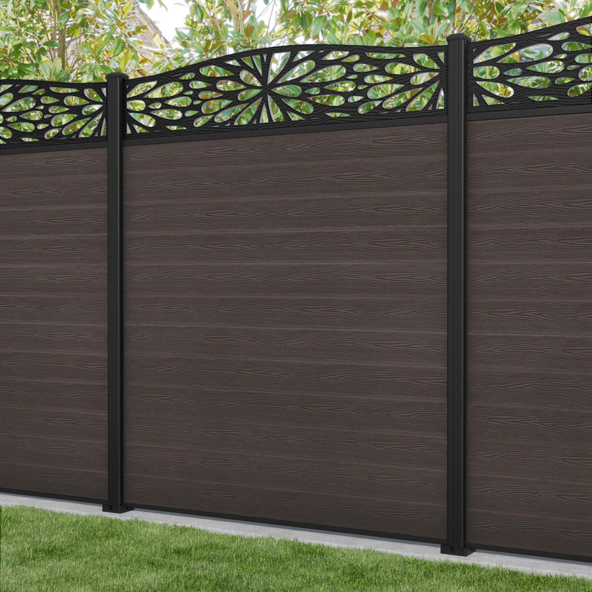 Classic Blossom Curved Top Fence Panel Mid Brown - with our aluminium posts