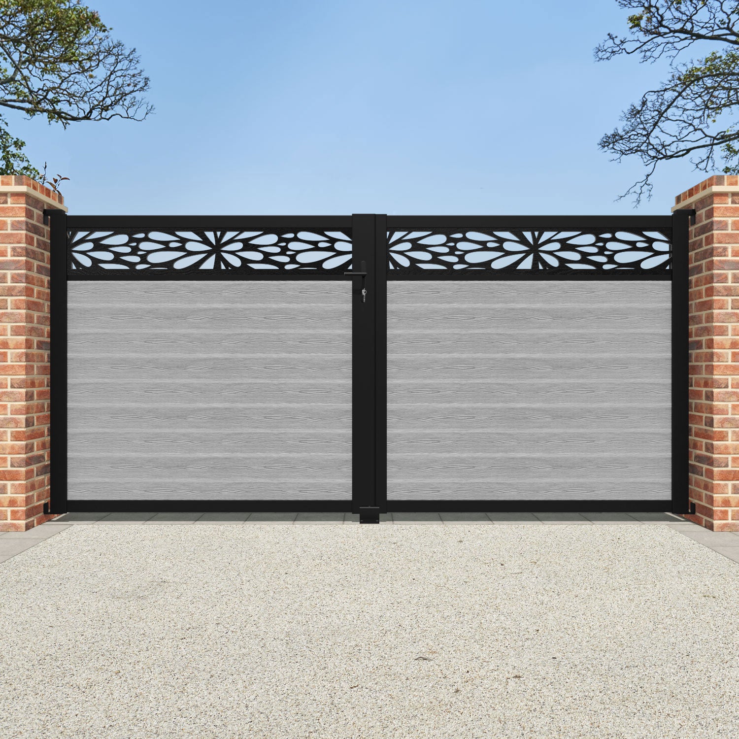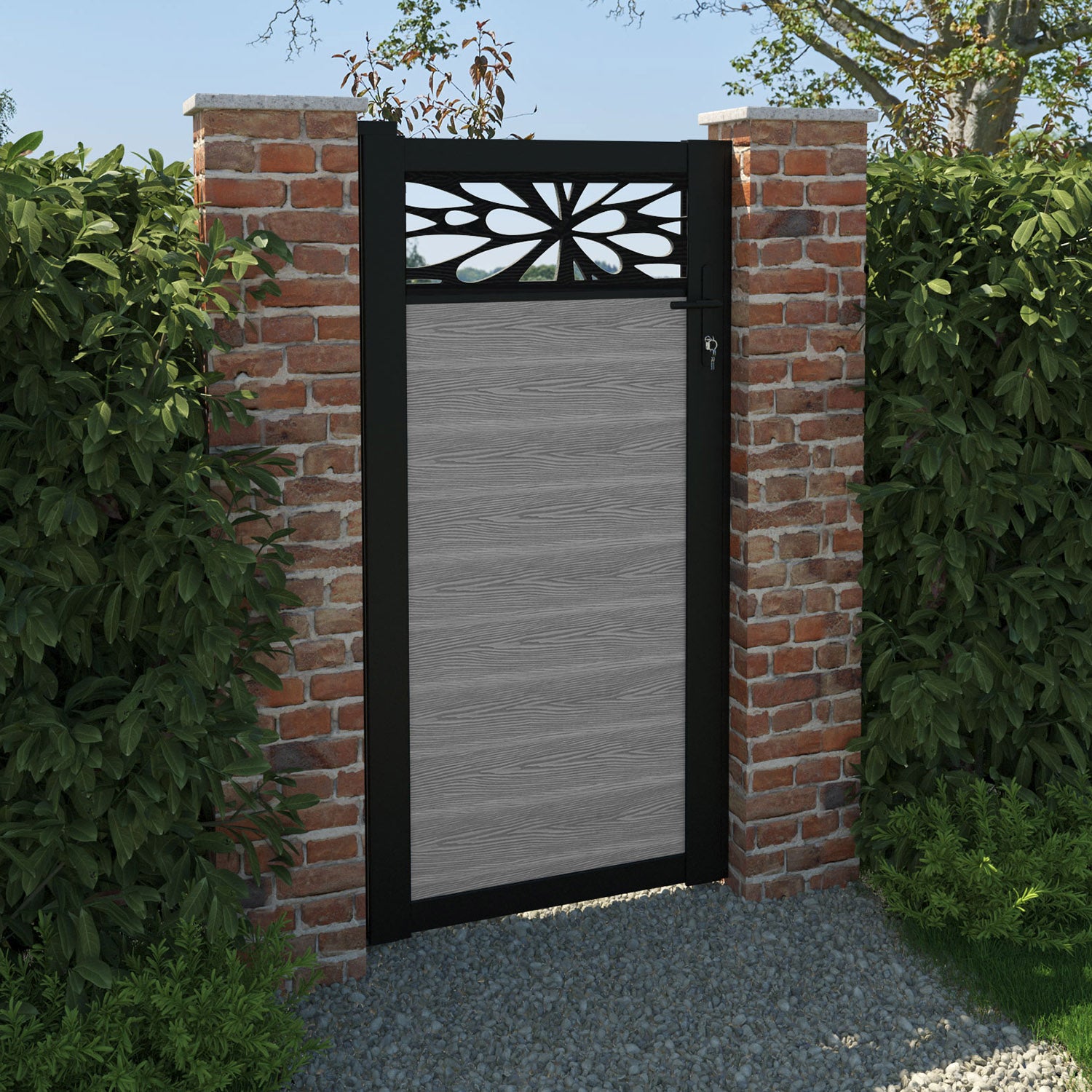 Our 18mm thick light grey premium composite fence slats paired with our composite fence posts and Blossom screen create an elegant, versatile, and eco-friendly fencing solution. Not only is this fencing responsibly sourced, it is also durable, long-lasting and requires no maintenance or painting.
