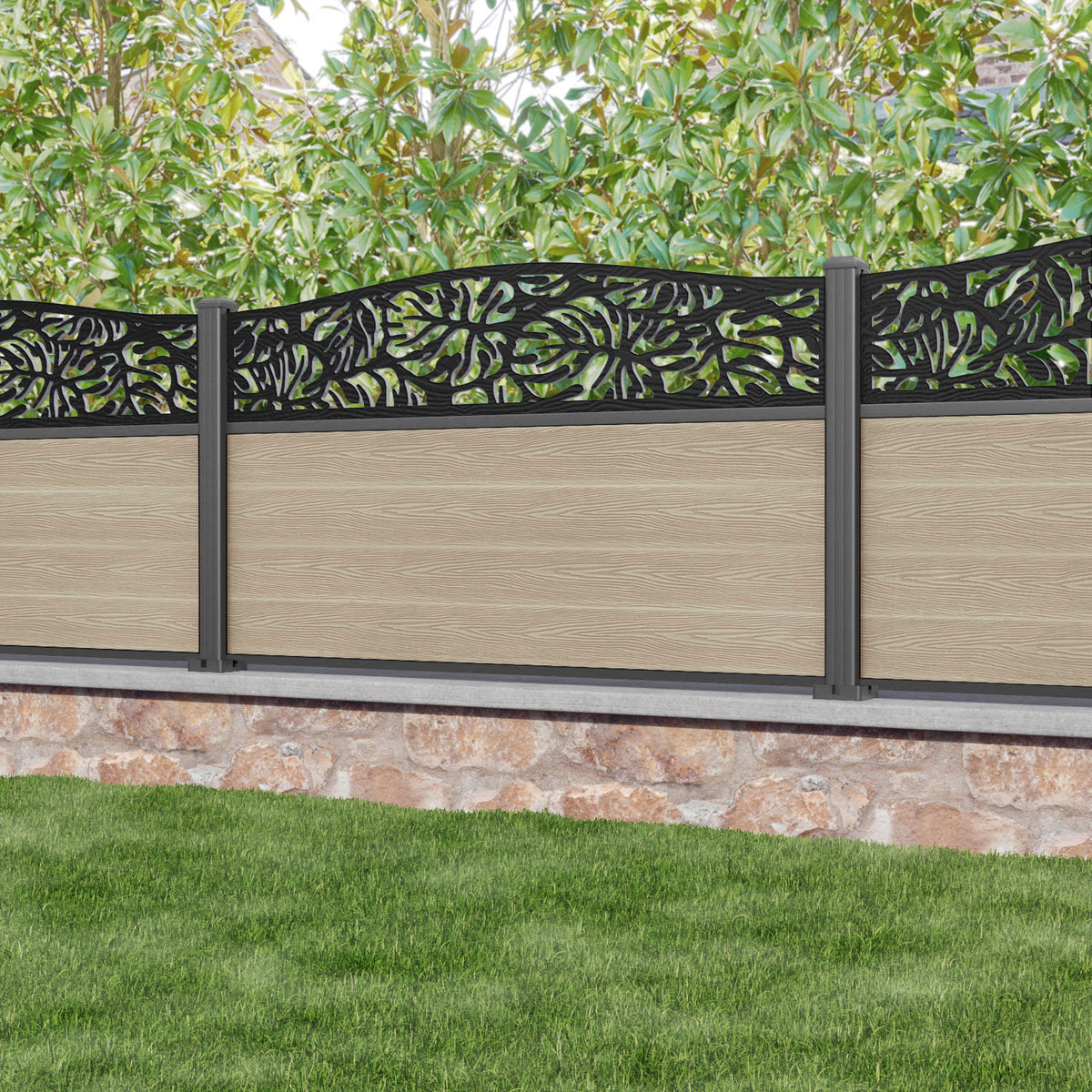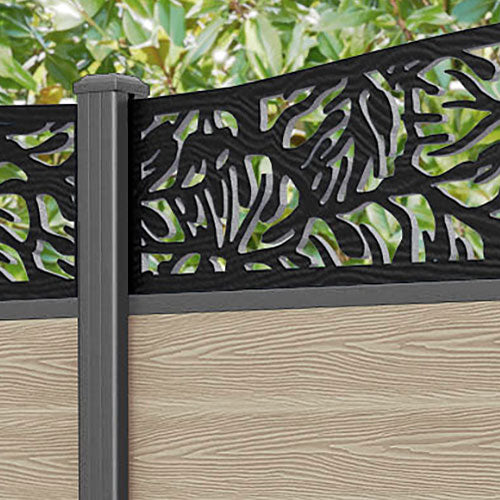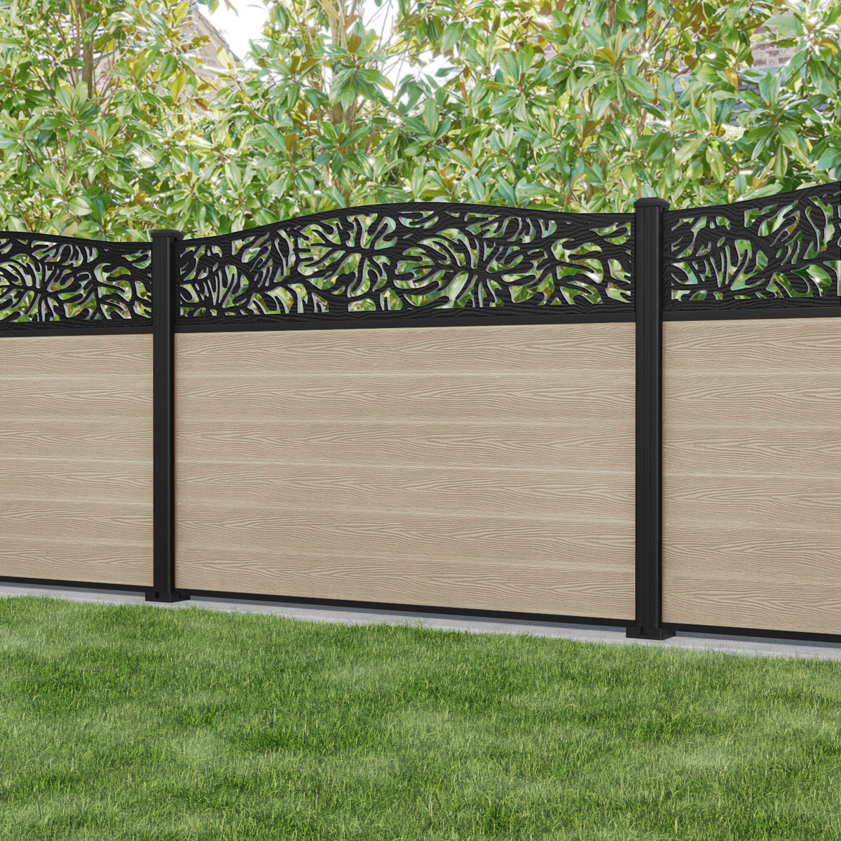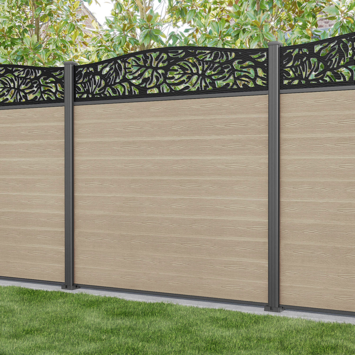 Classic Botanic Curved Top Fence Panel Light Oak - with our aluminium posts