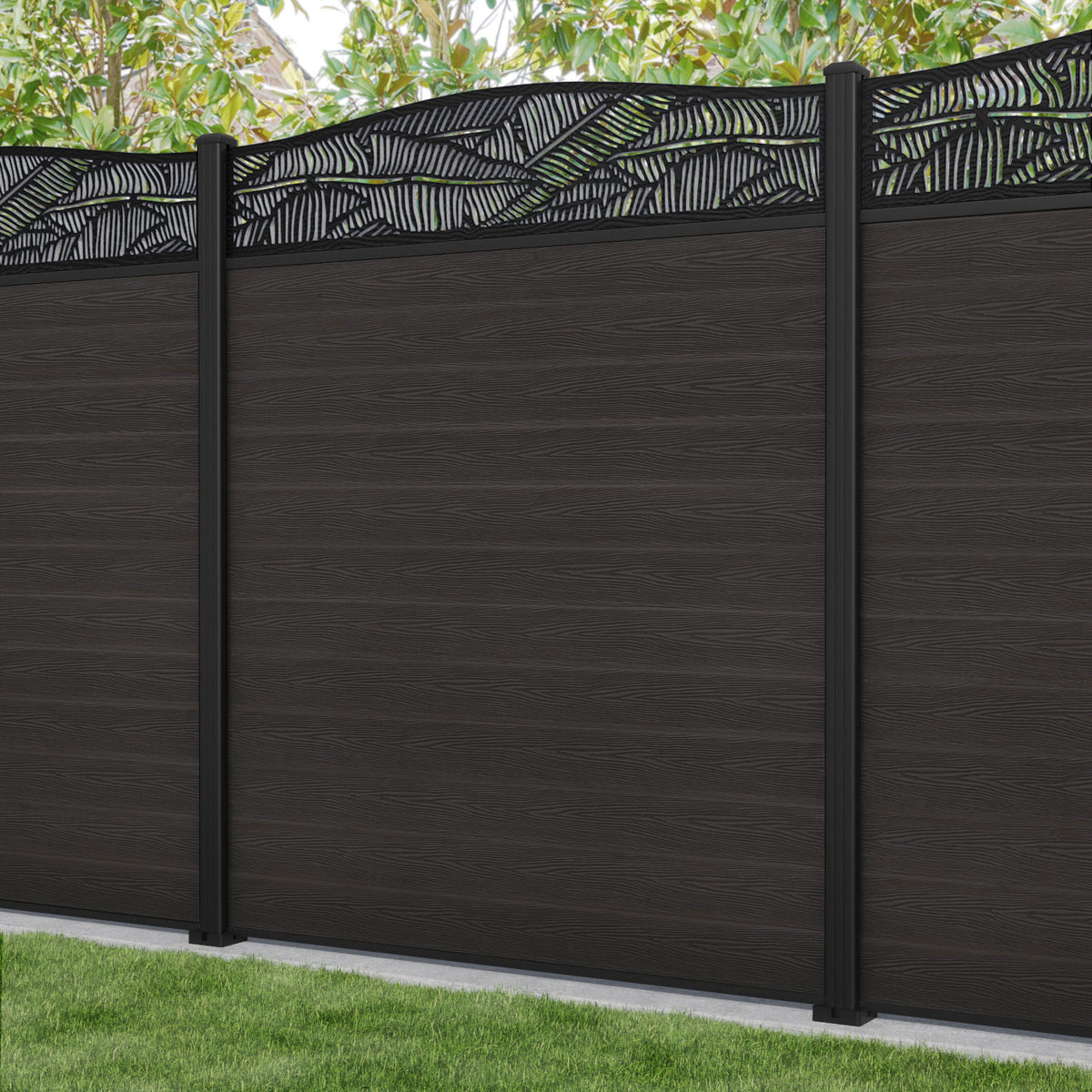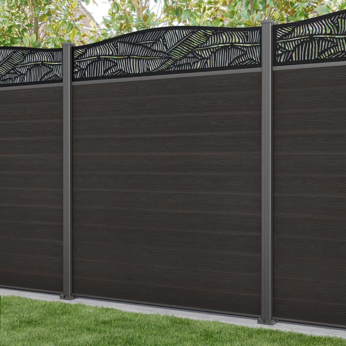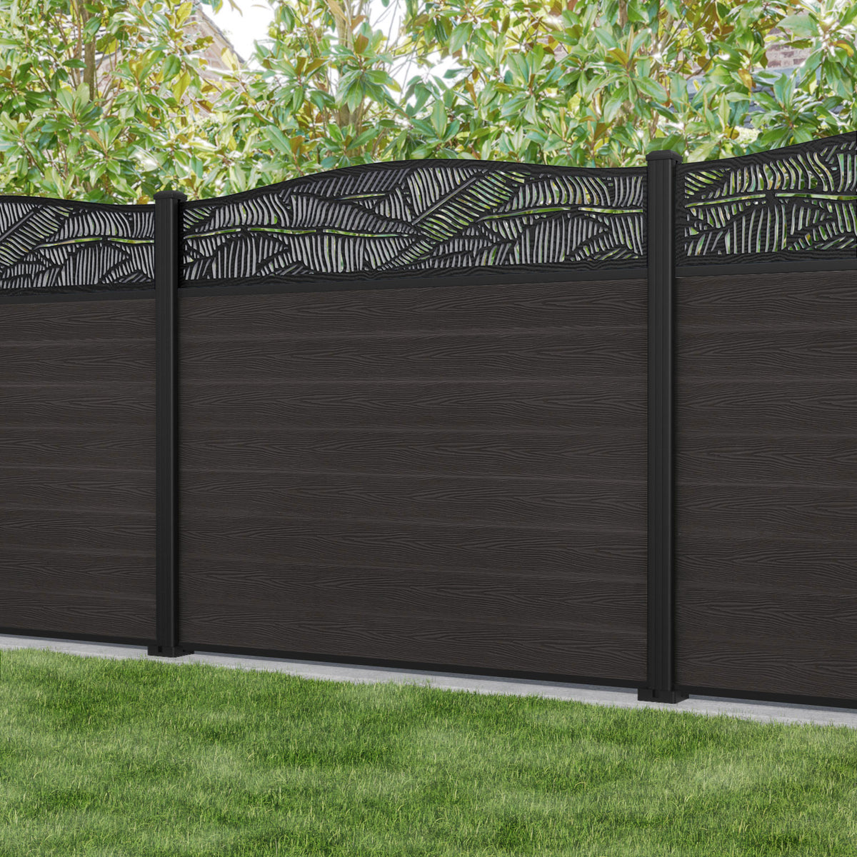 Our 18mm thick dark oak premium composite fence slats paired with our high-grade aluminium fence posts and Feather screen create an elegant, versatile, and eco-friendly fencing solution. Not only is this fencing responsibly sourced, it is also durable, long-lasting and requires no maintenance or painting.