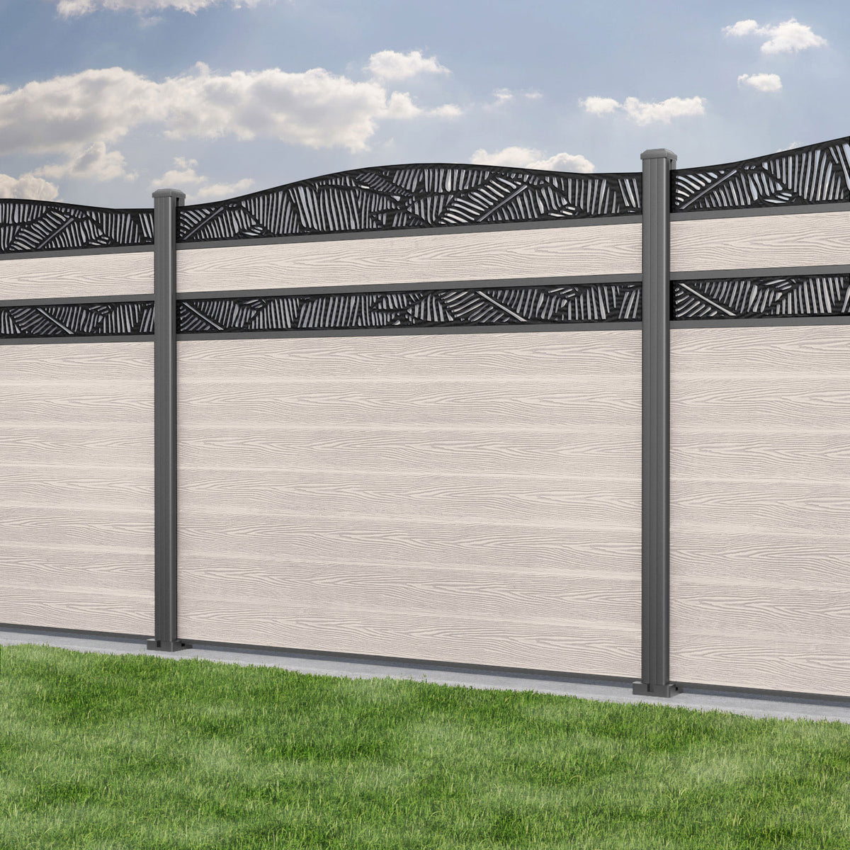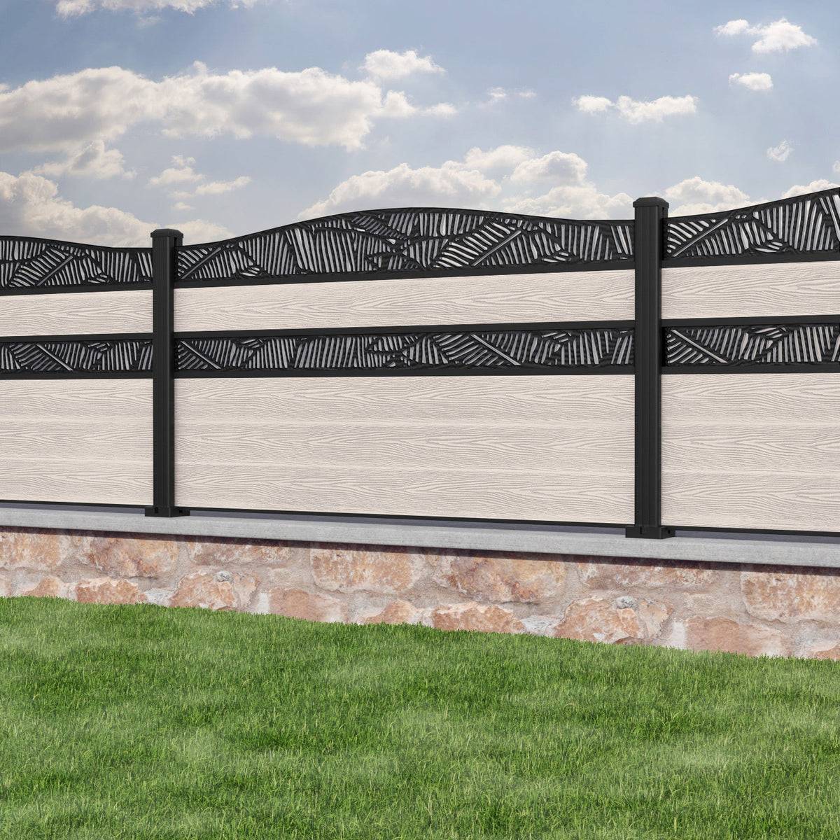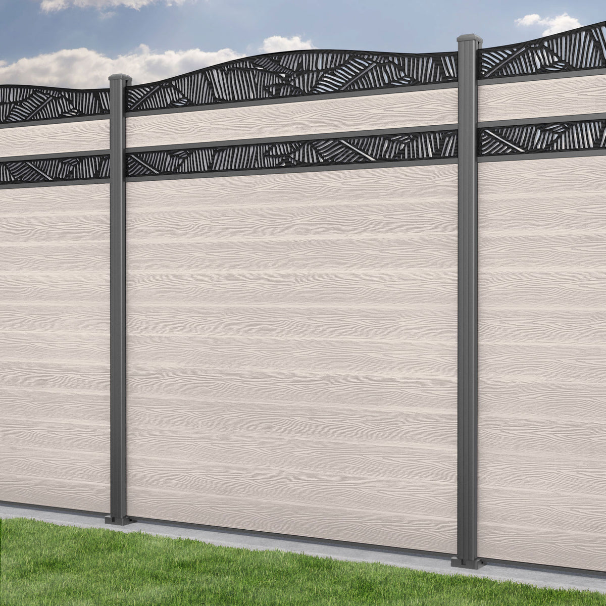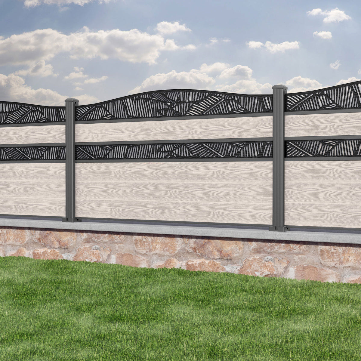 Classic Feather Curved Top Split Screen Fence Panel Mid Stone - with our aluminium posts
