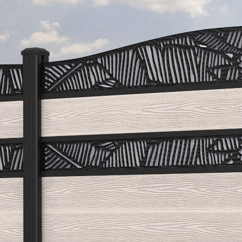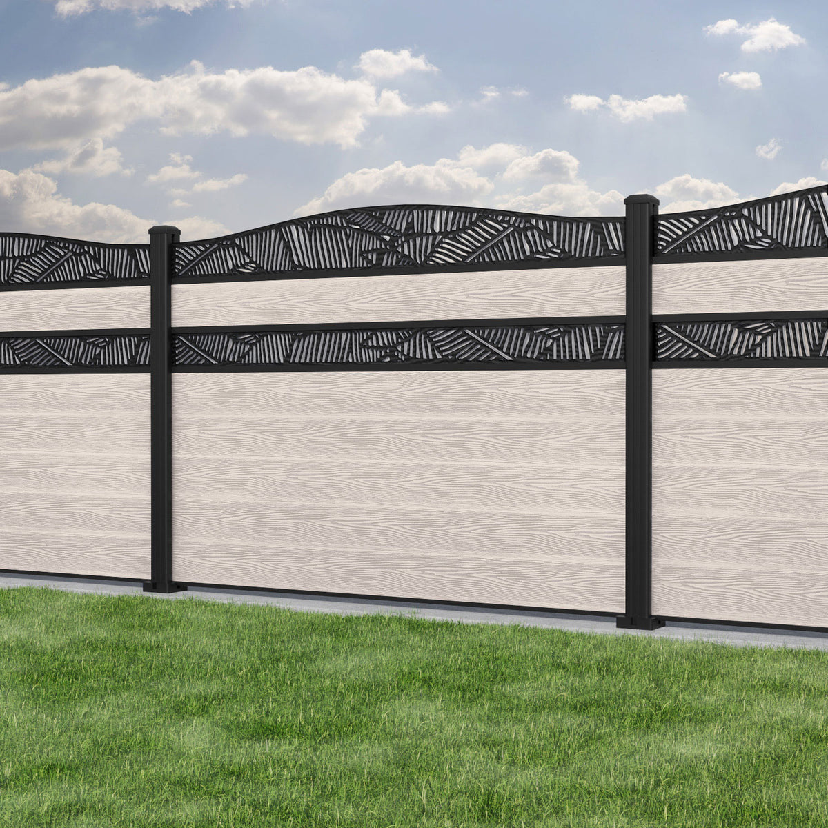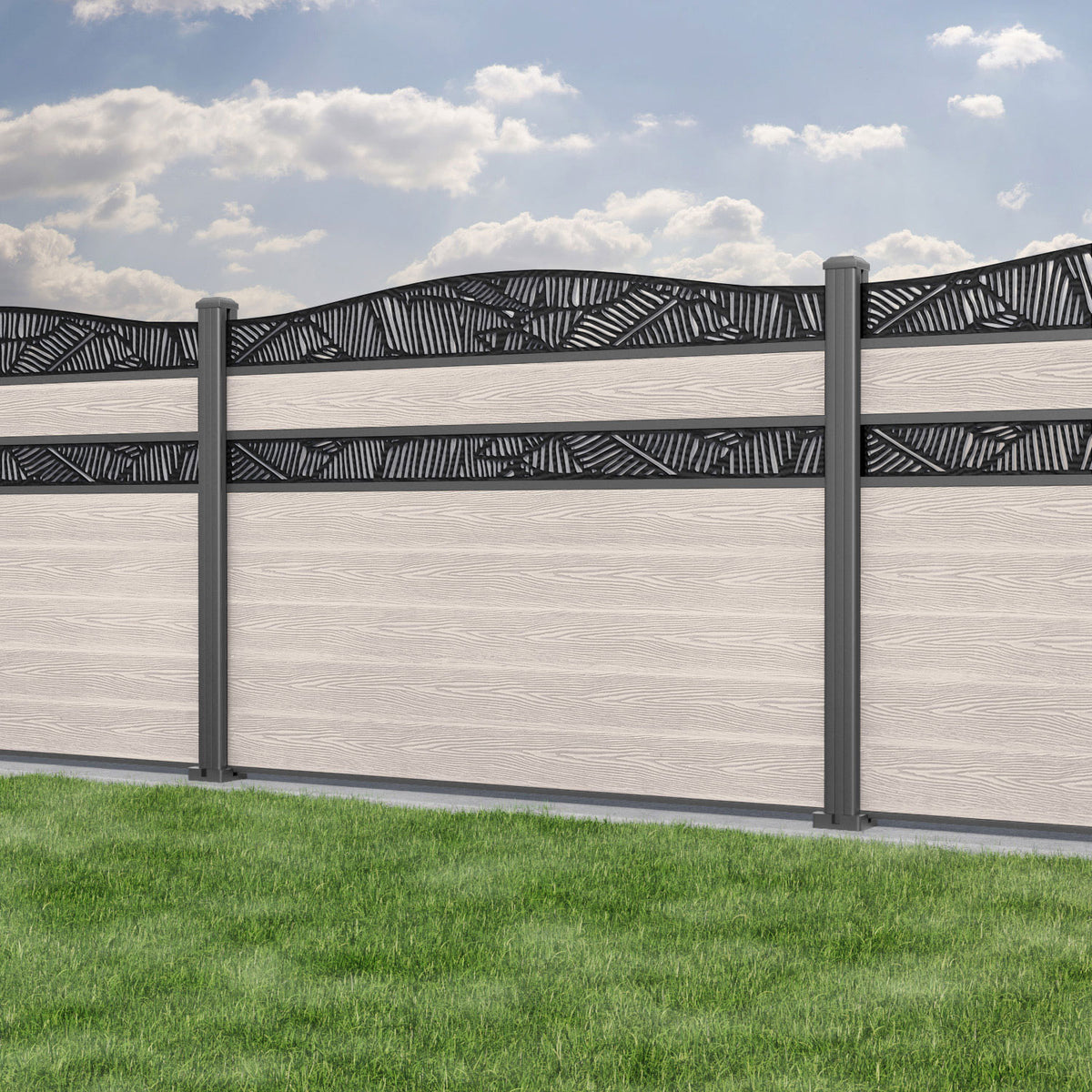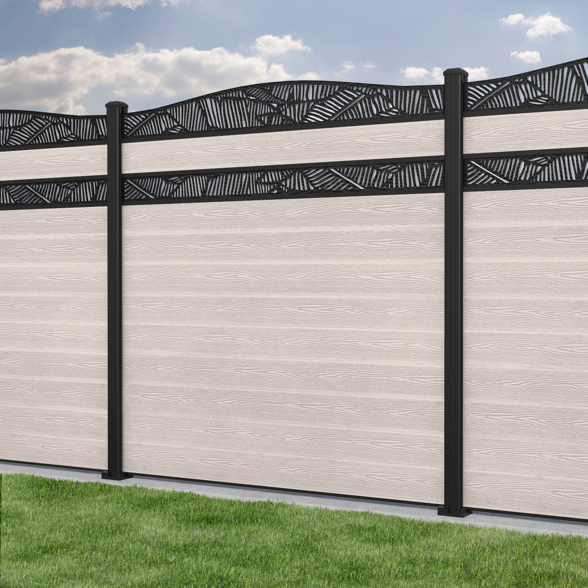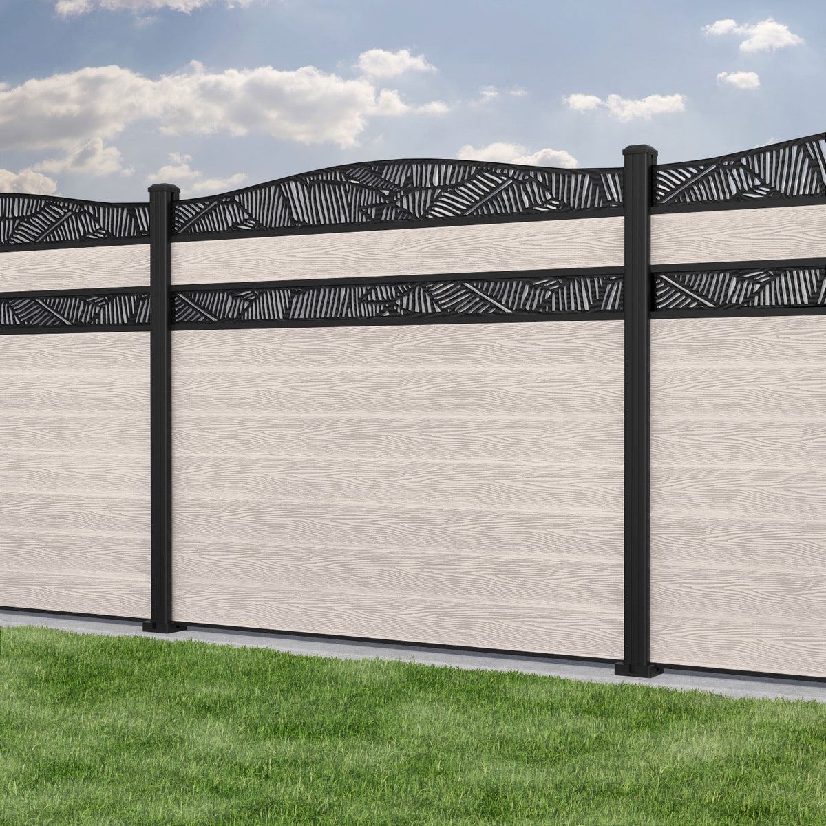 Classic Feather Curved Top Split Screen Fence Panel Mid Stone - with our aluminium posts