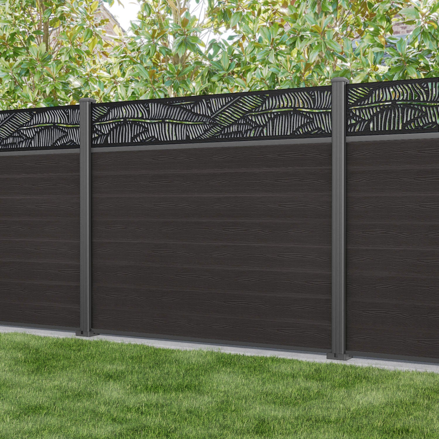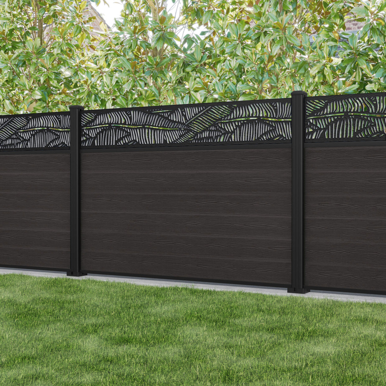Reference: Classic Feather Fence Panel - Dark Oak - with our aluminium posts