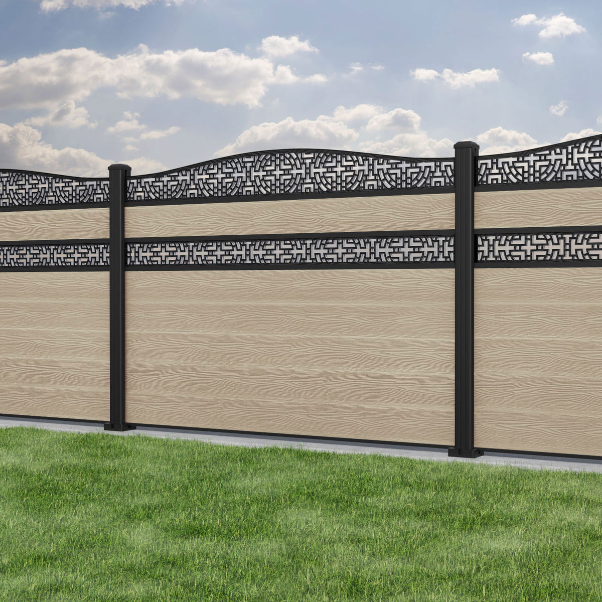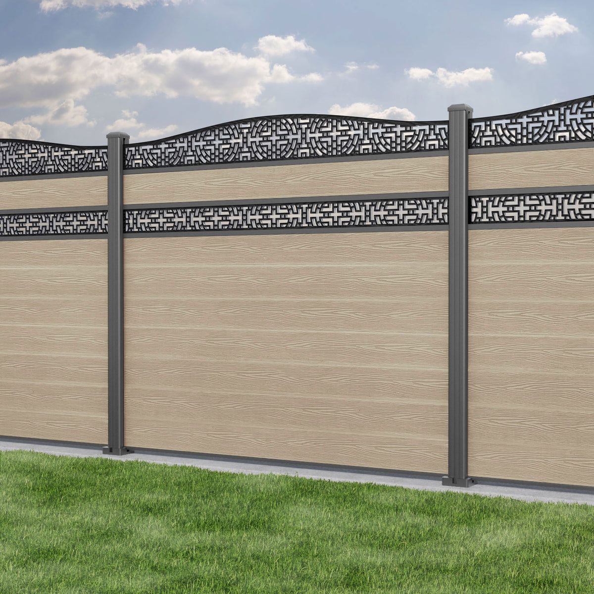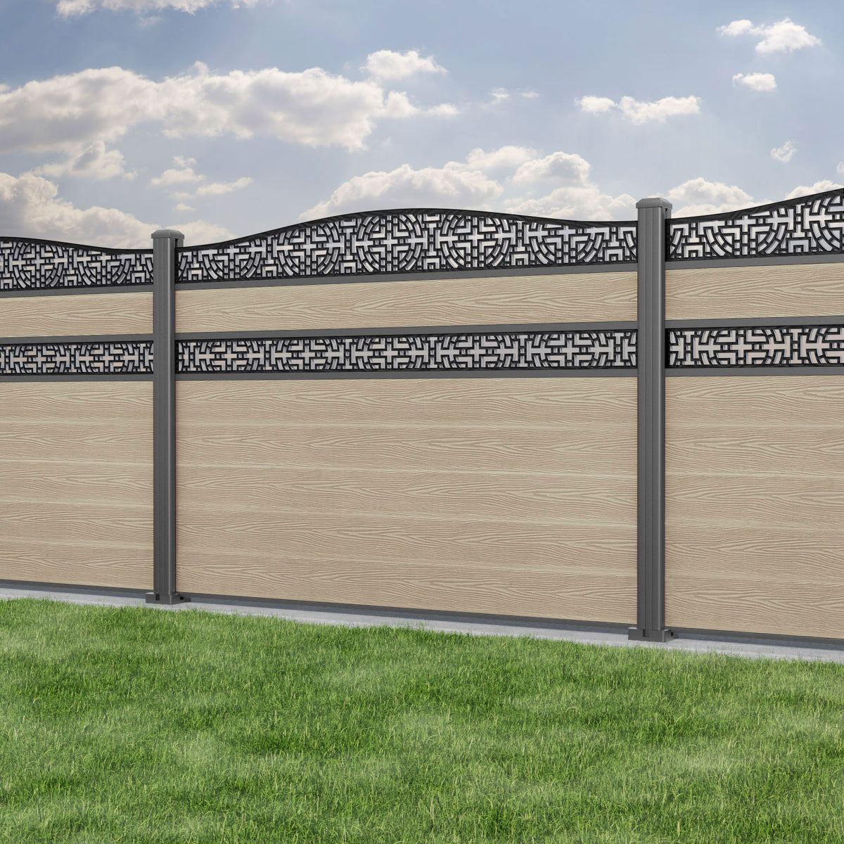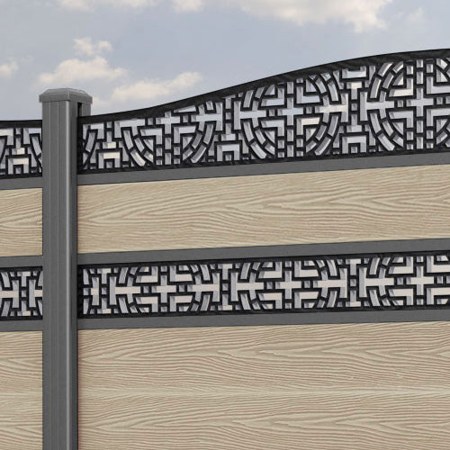 Classic Kumo Curved Top Split Screen Fence Panel Light Oak - with our aluminium posts