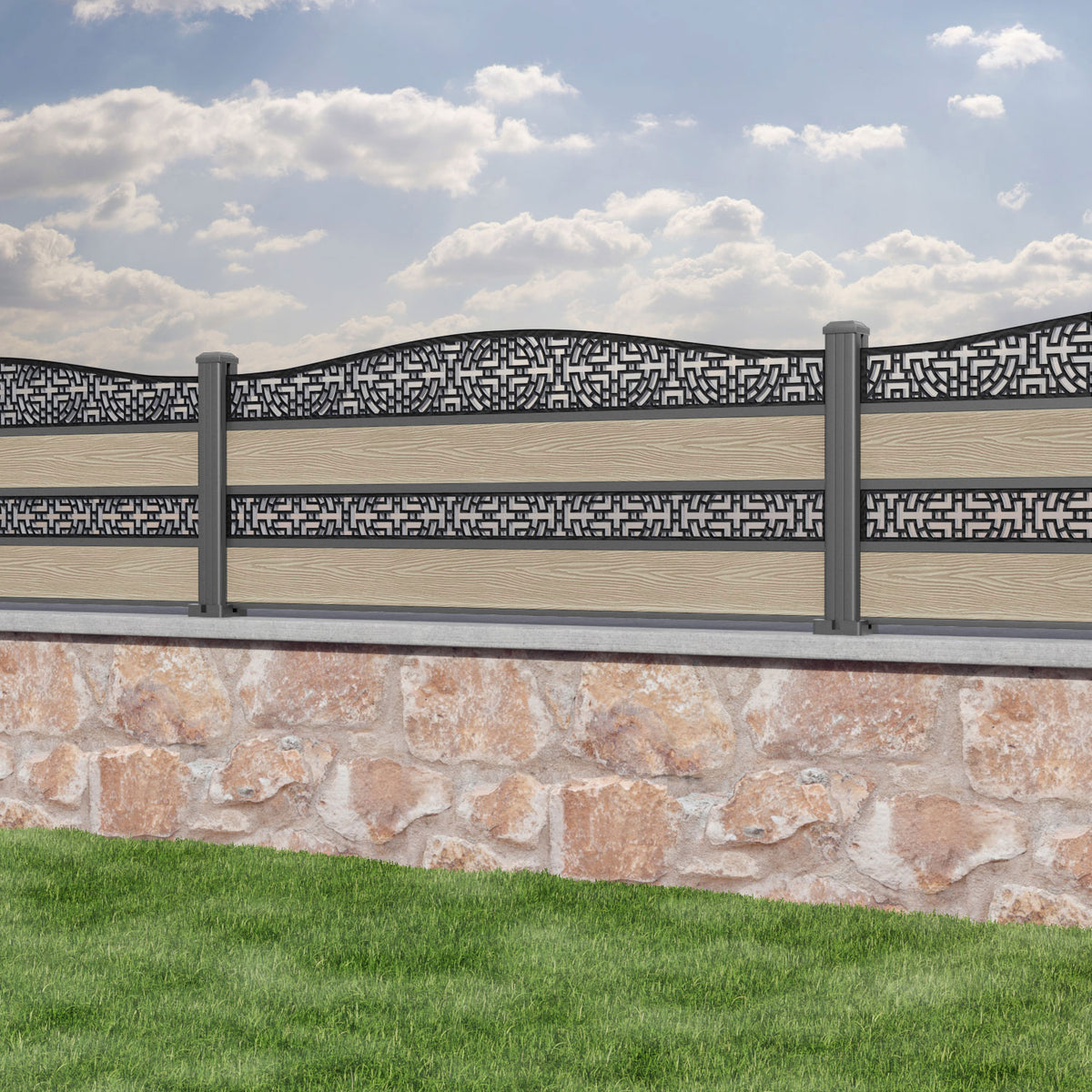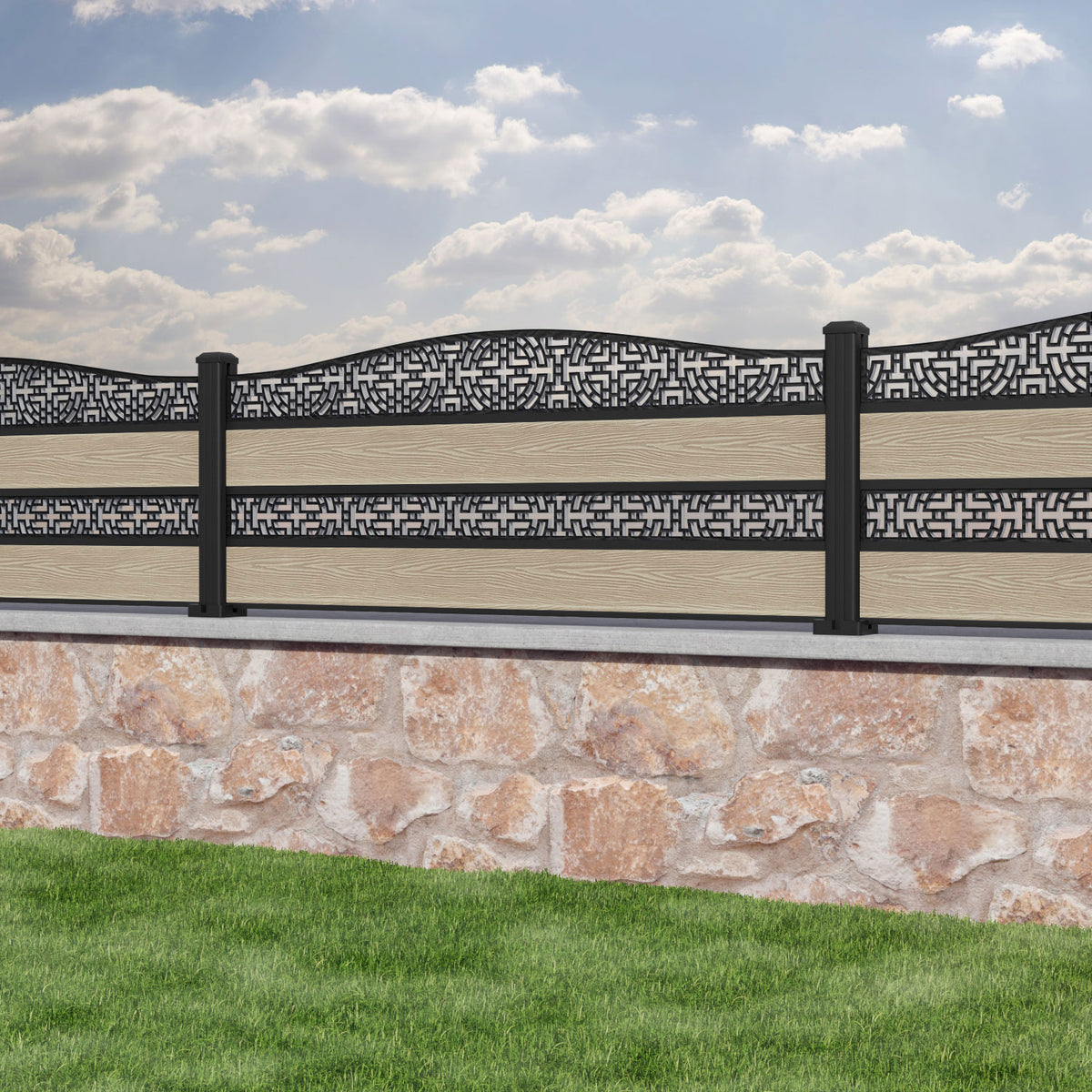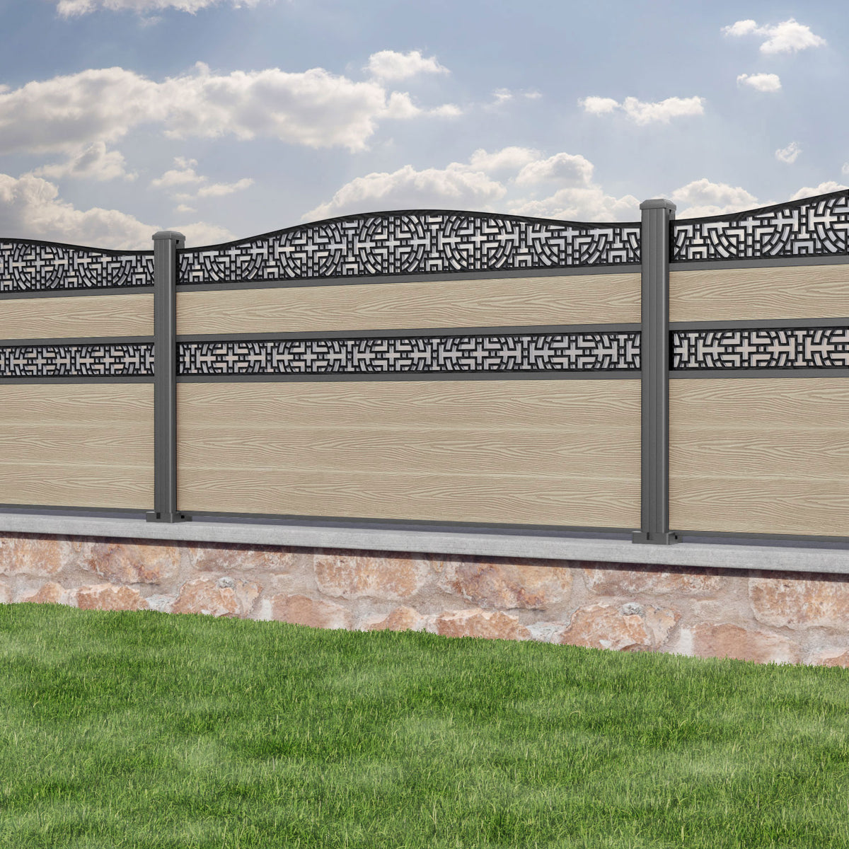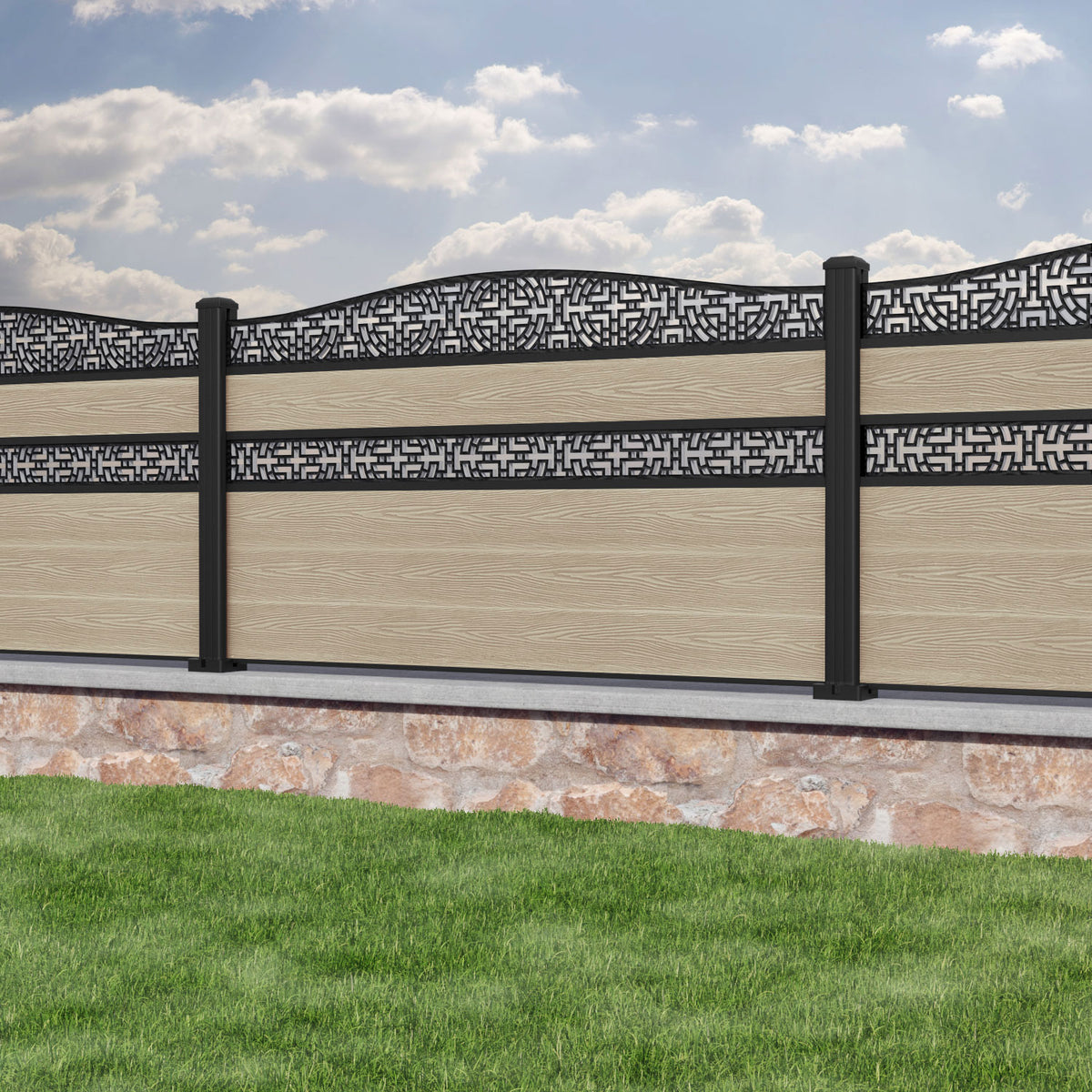 Classic Kumo Curved Top Split Screen Fence Panel Light Oak - with our aluminium posts