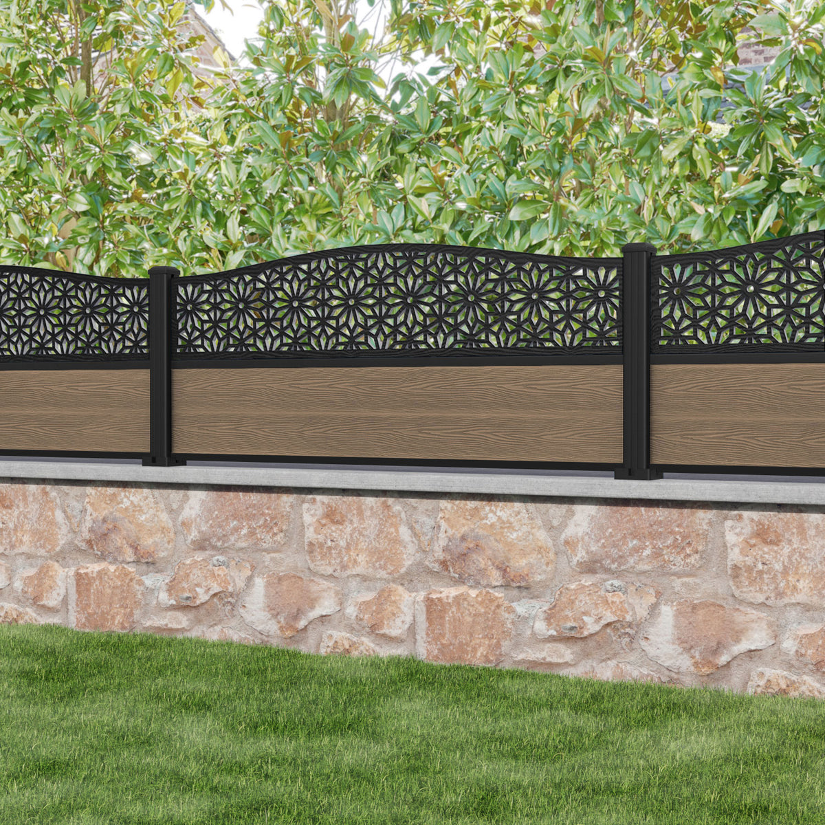 Classic Narwa Curved Top Fence Panel Teak - with our aluminium posts