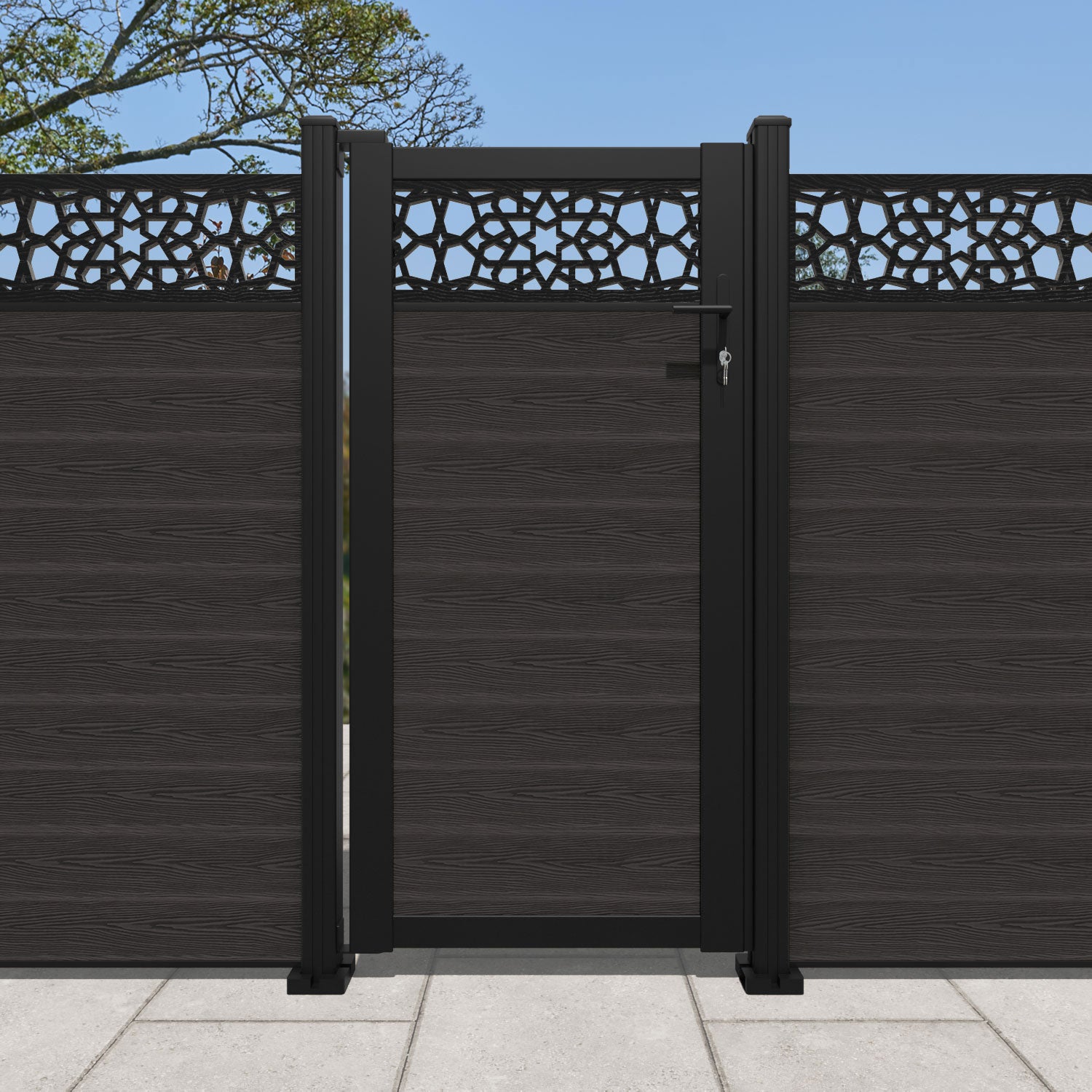 Our 18mm thick dark oak premium composite fence slats paired with our composite fence posts and Nazira screen create an elegant, versatile, and eco-friendly fencing solution. Not only is this fencing responsibly sourced, it is also durable, long-lasting and requires no maintenance or painting.