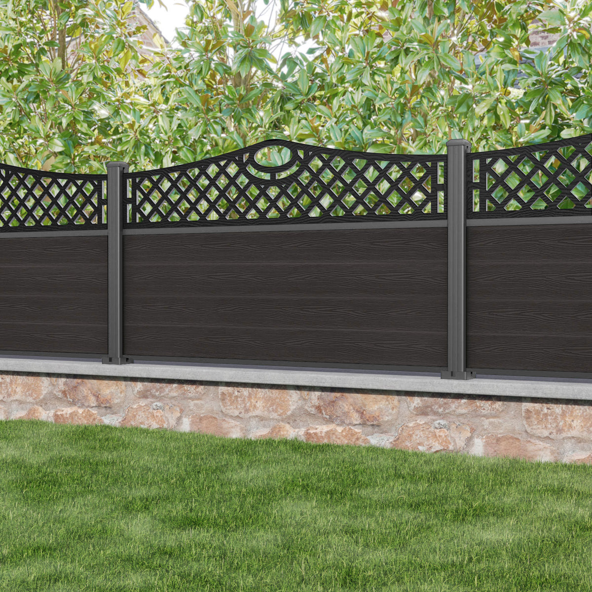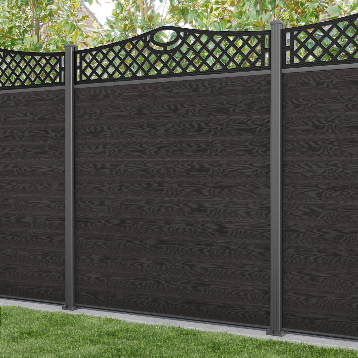 Classic Oxford Curved Top Fence Panel Dark Oak - with our aluminium posts