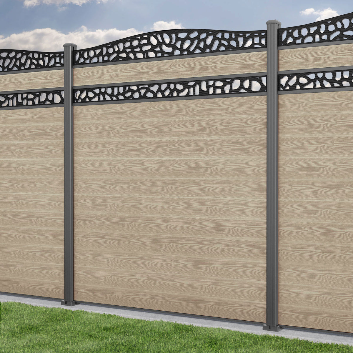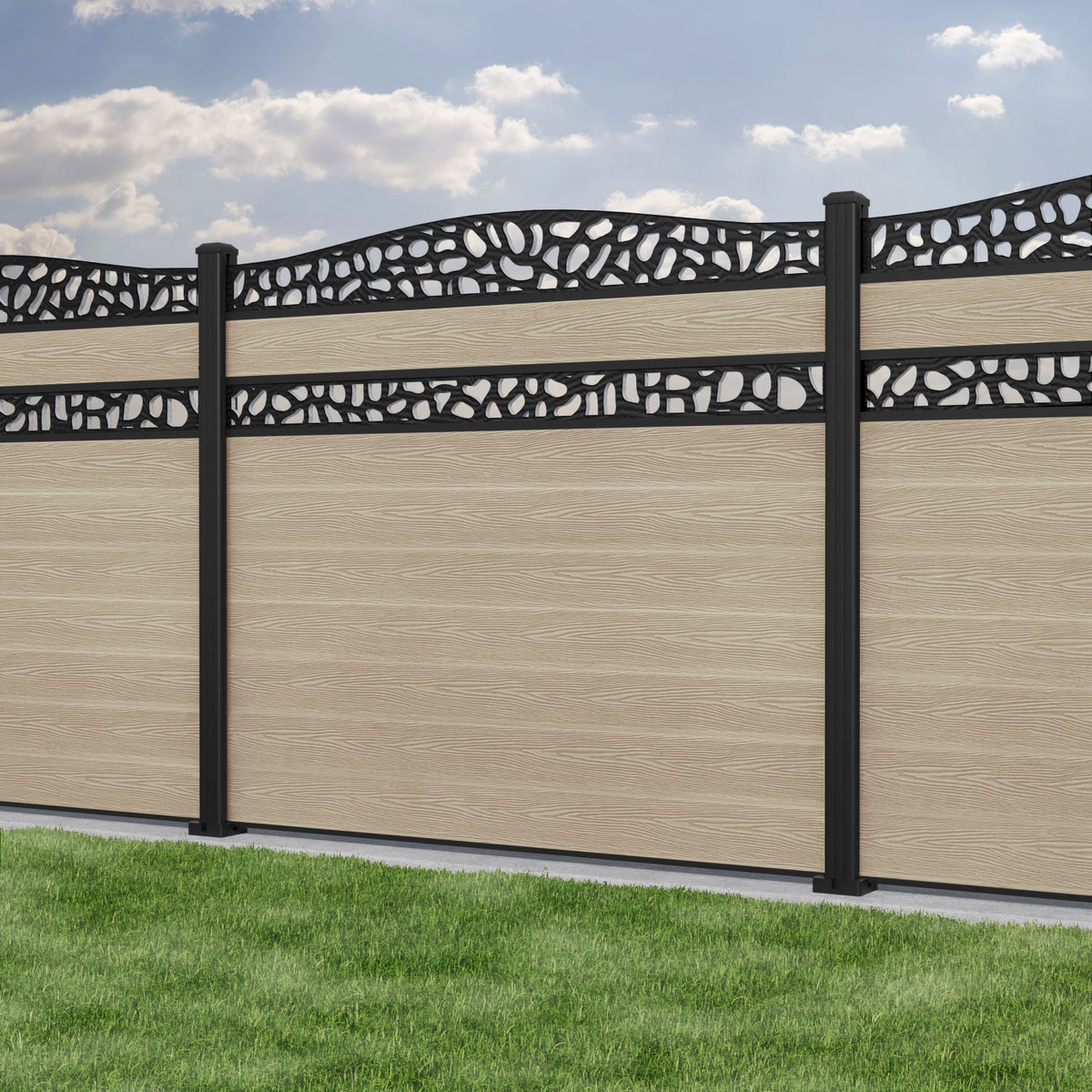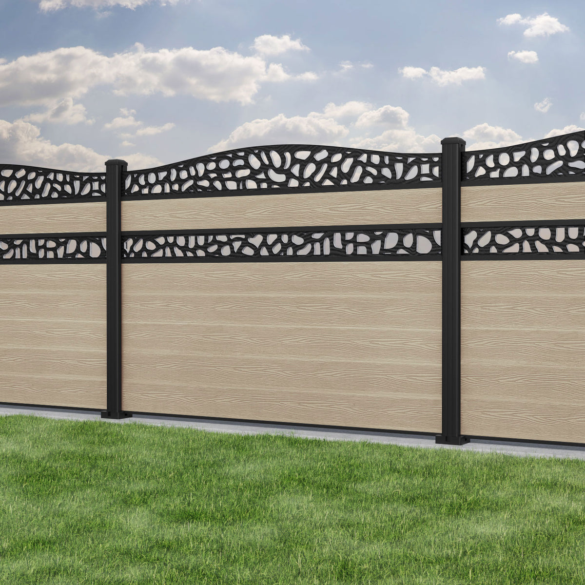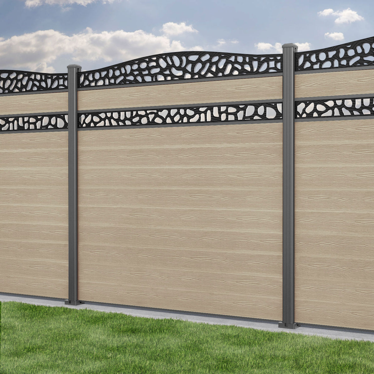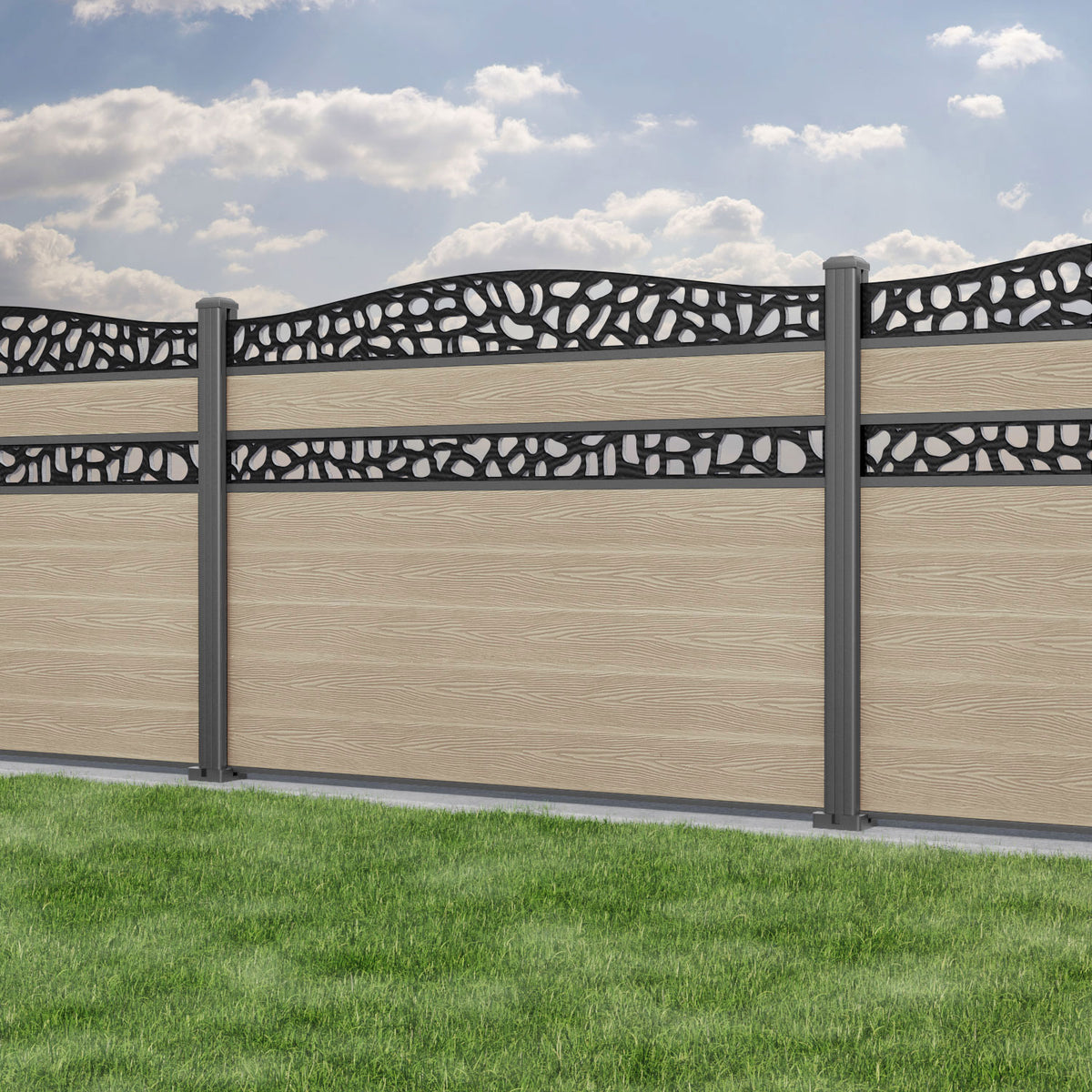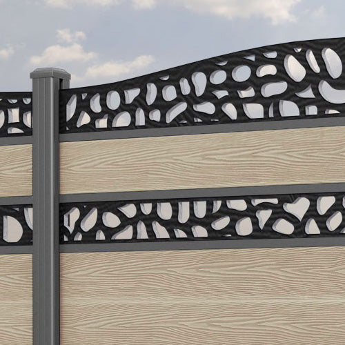 Classic Pebble Curved Top Split Screen Fence Panel Light Oak - with our aluminium posts