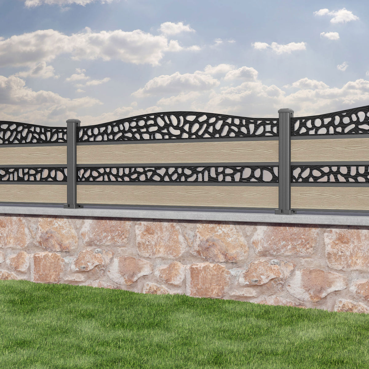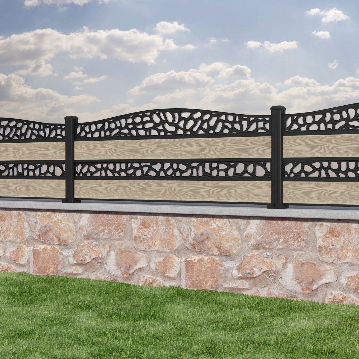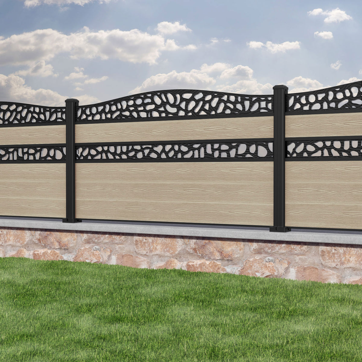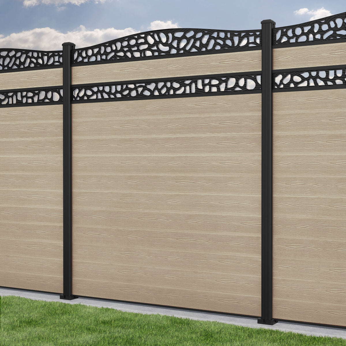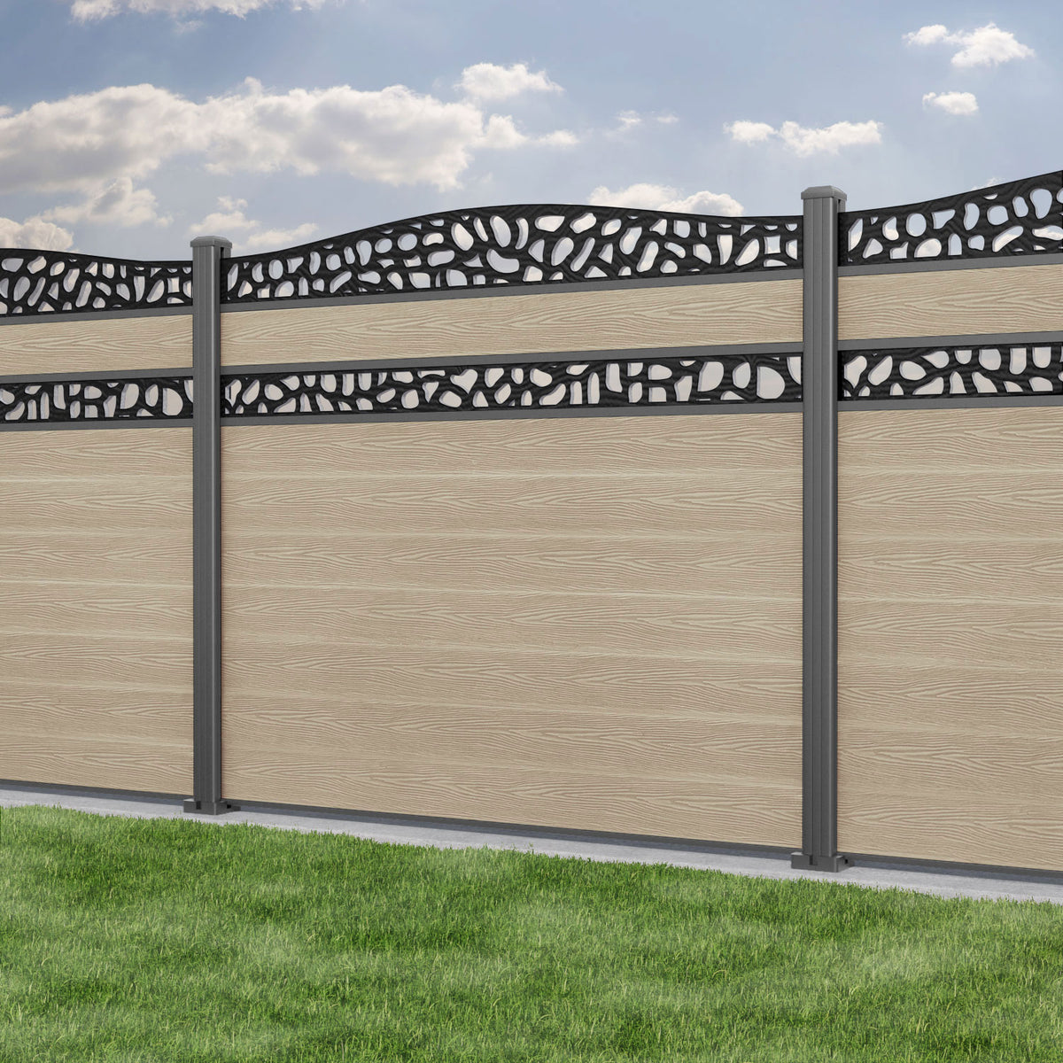Classic Pebble Curved Top Split Screen Fence Panel Light Oak - with our aluminium posts