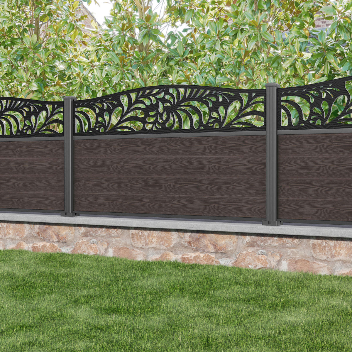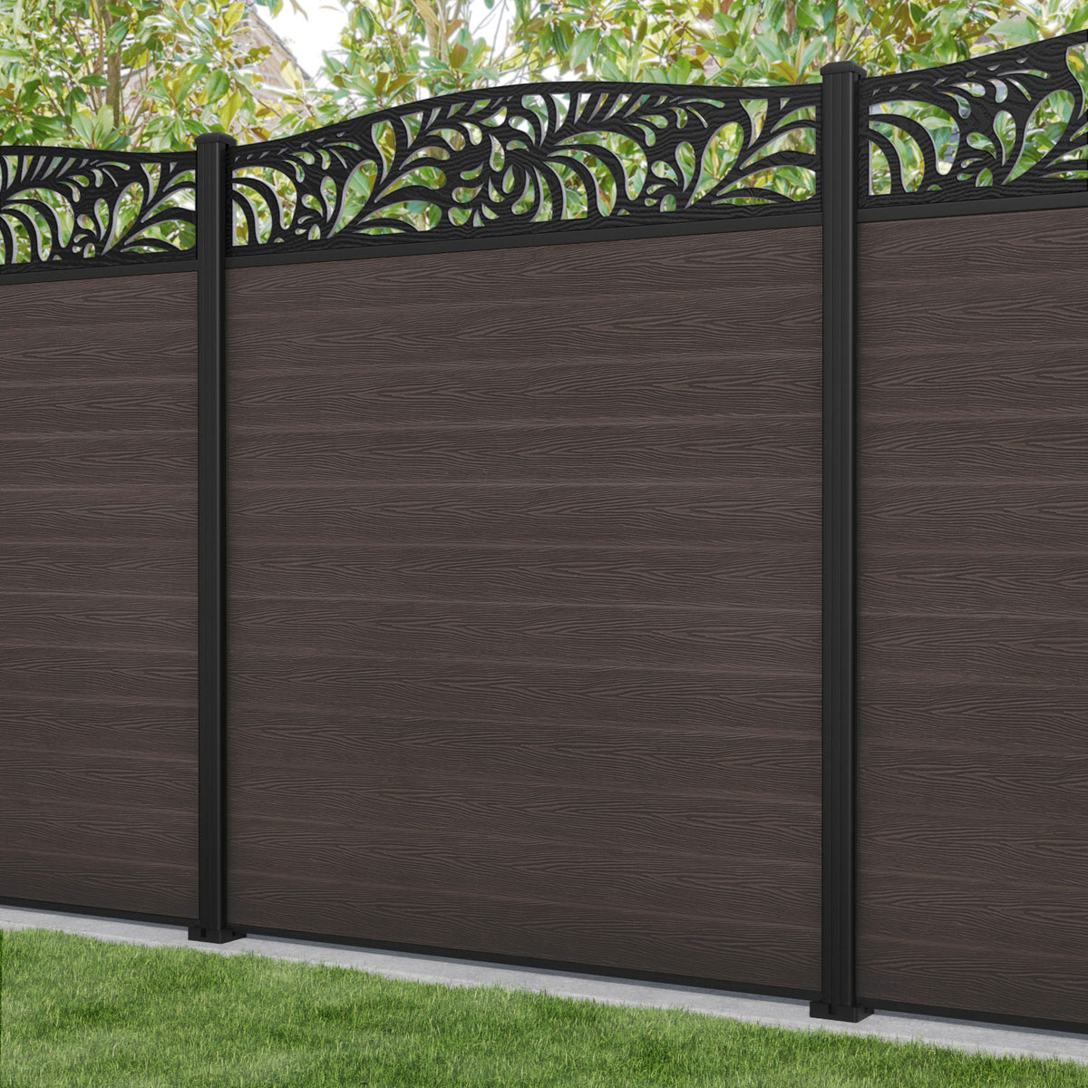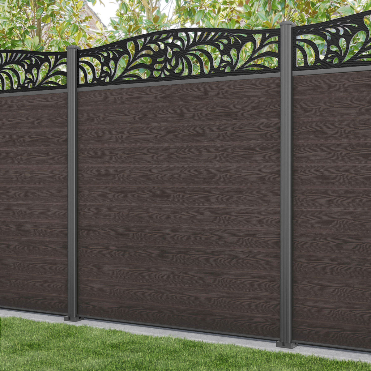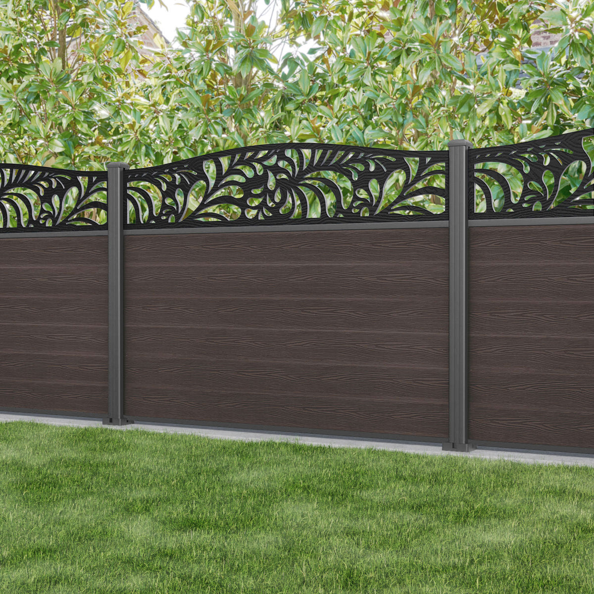 Classic Petal Curved Top Fence Panel Mid Brown - with our aluminium posts