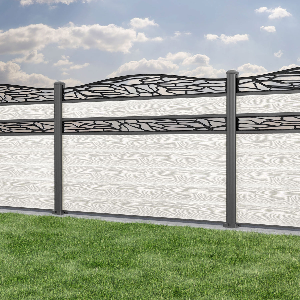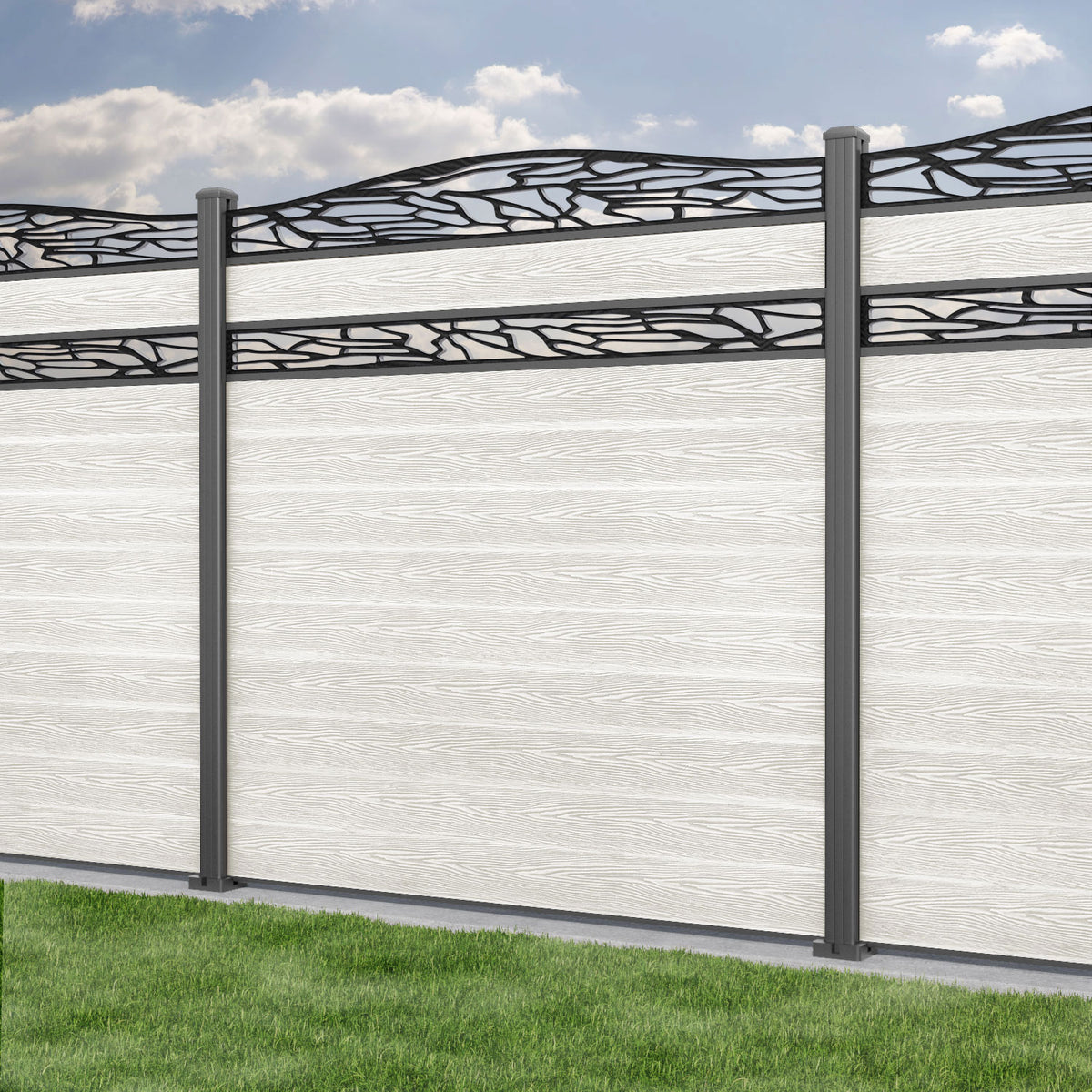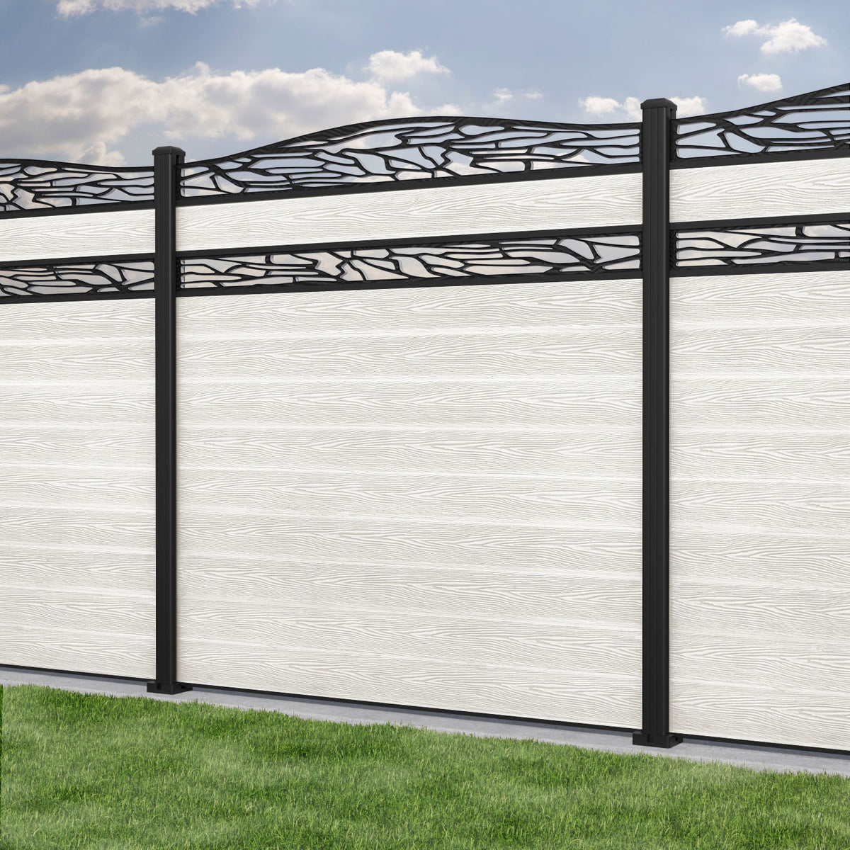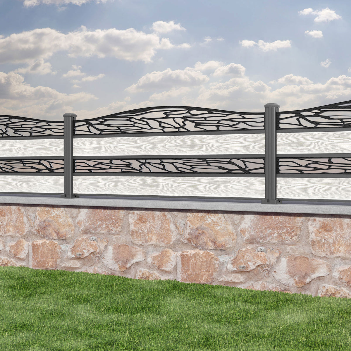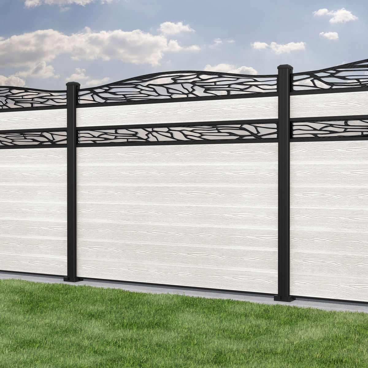 Classic Shatter Curved Top Split Screen Fence Panel Light Stone - with our aluminium posts