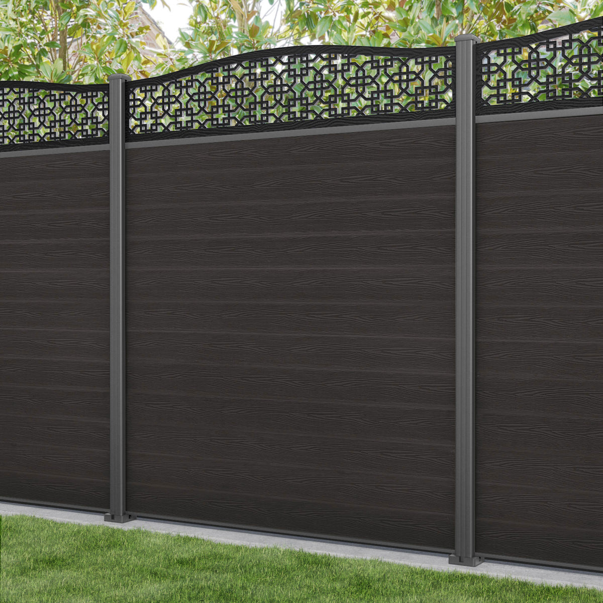 Classic Zaria Curved Top Fence Panel Dark Oak - with our aluminium posts