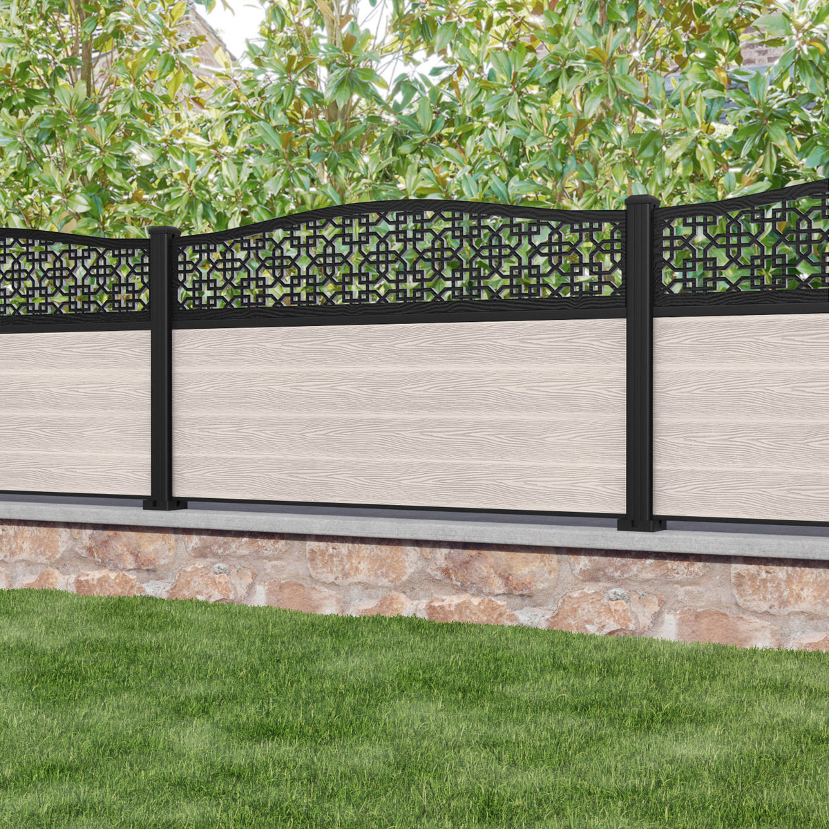 Classic Zaria Curved Top Fence Panel Mid Stone - with our aluminium posts