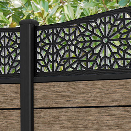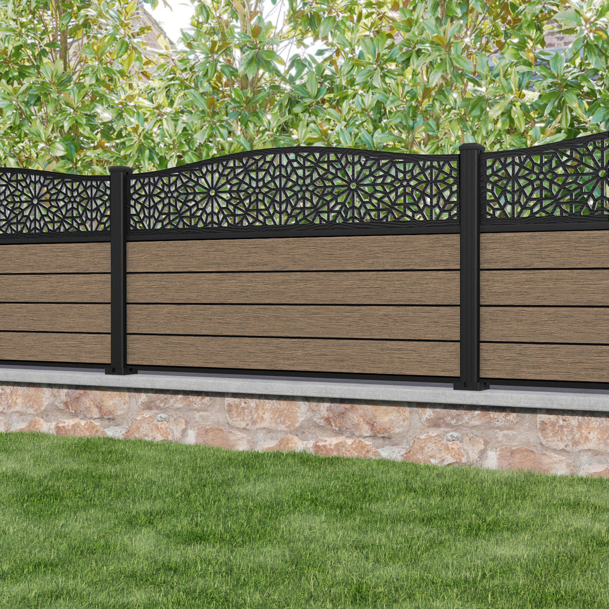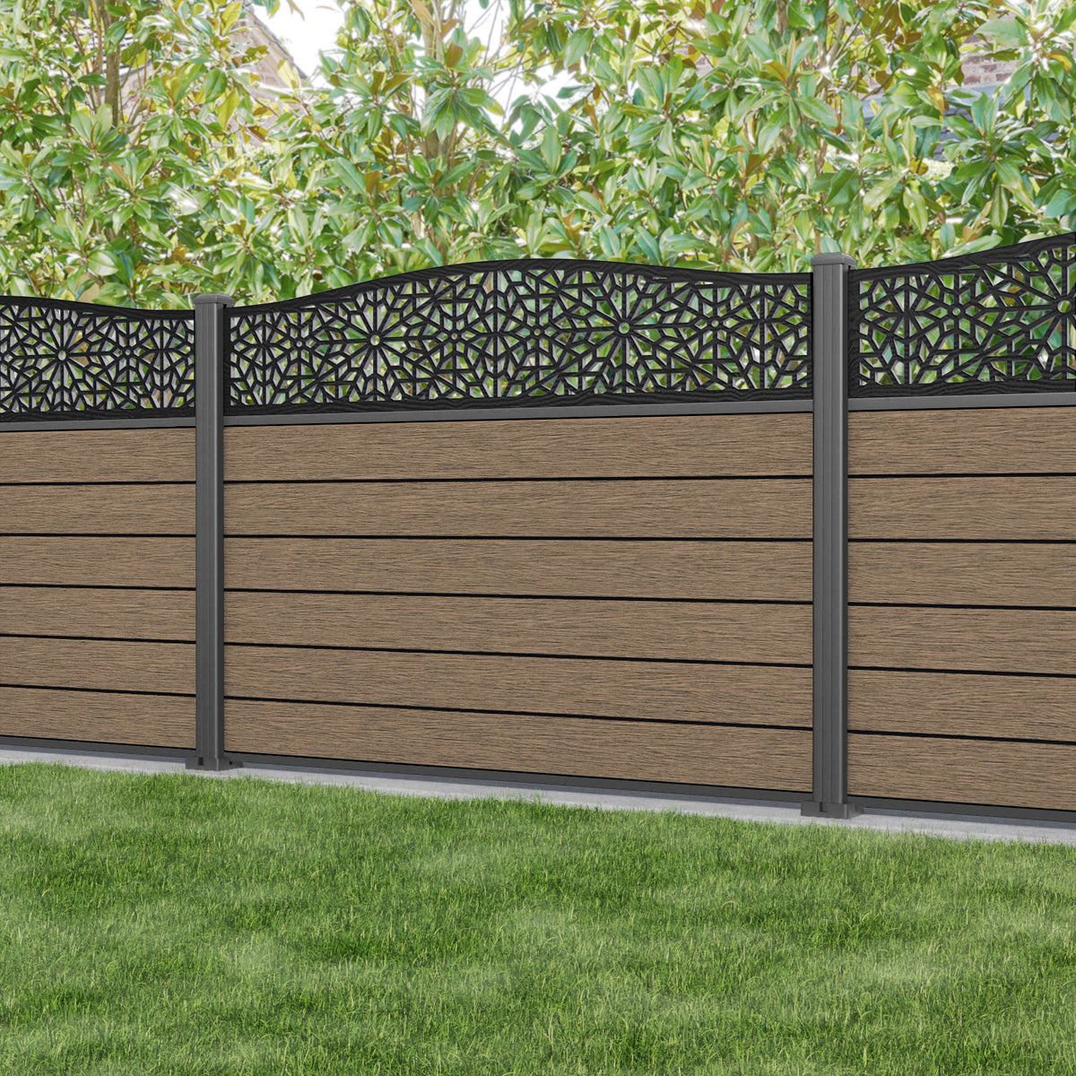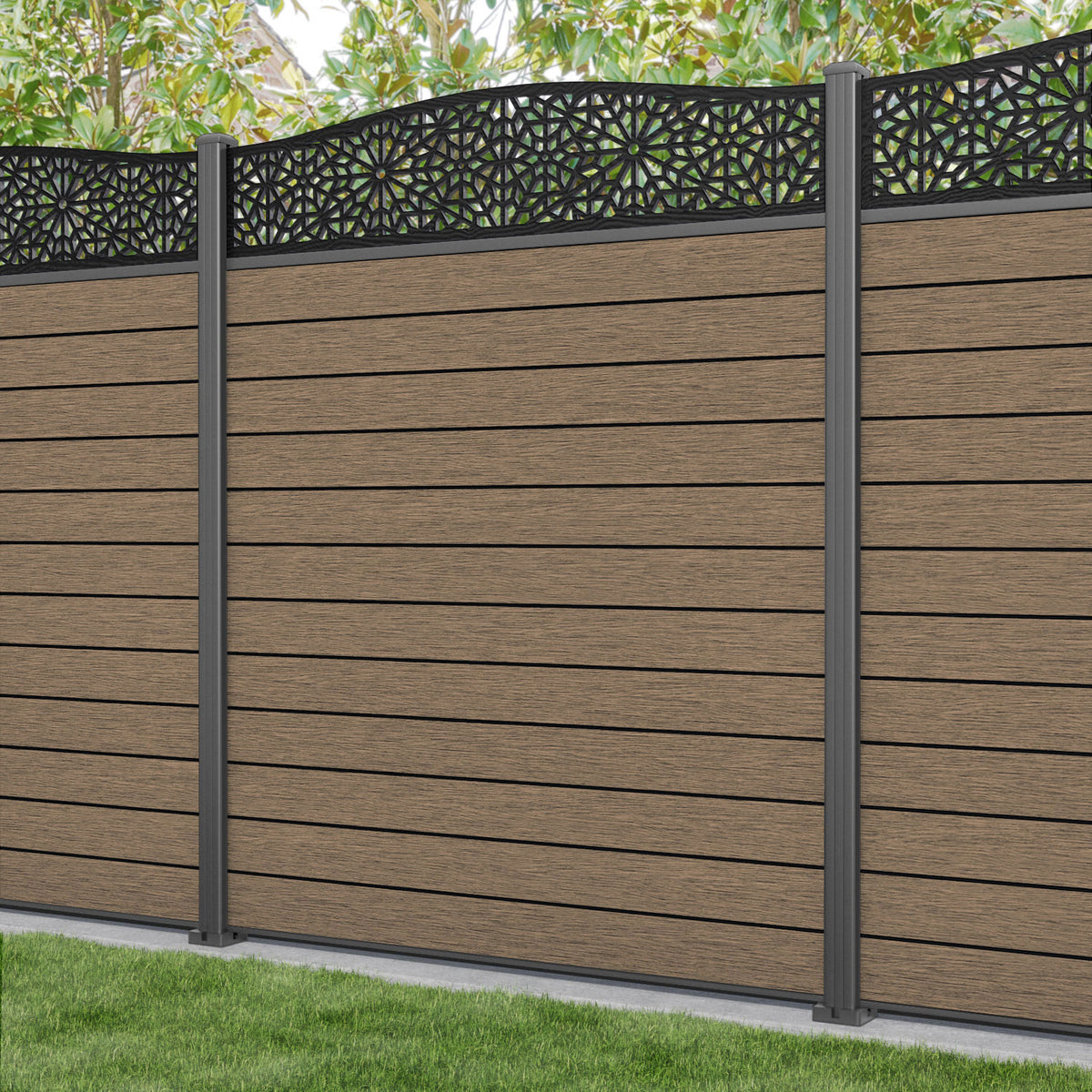 Fusion Alnara Curved Top Fence Panel Teak - with our aluminium posts