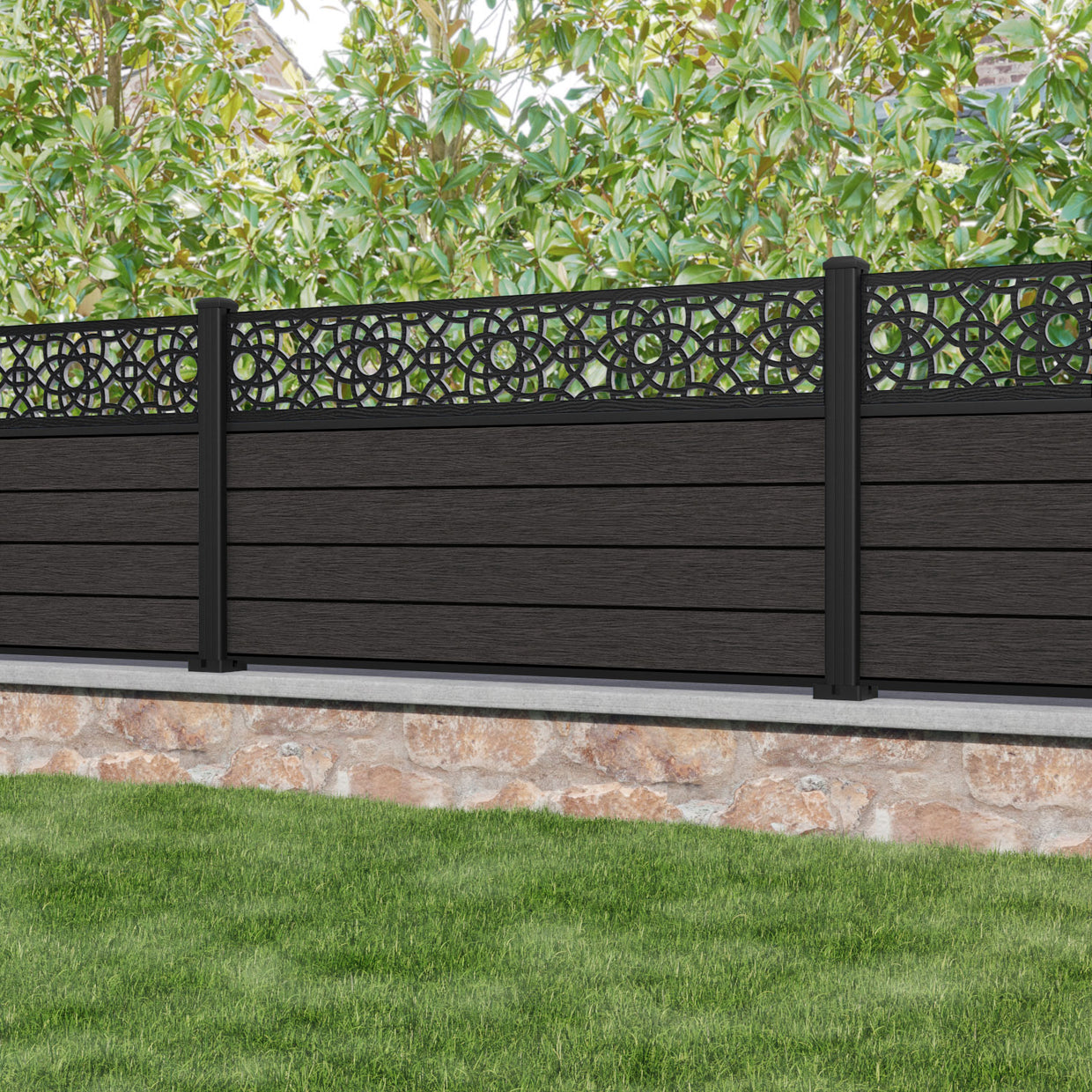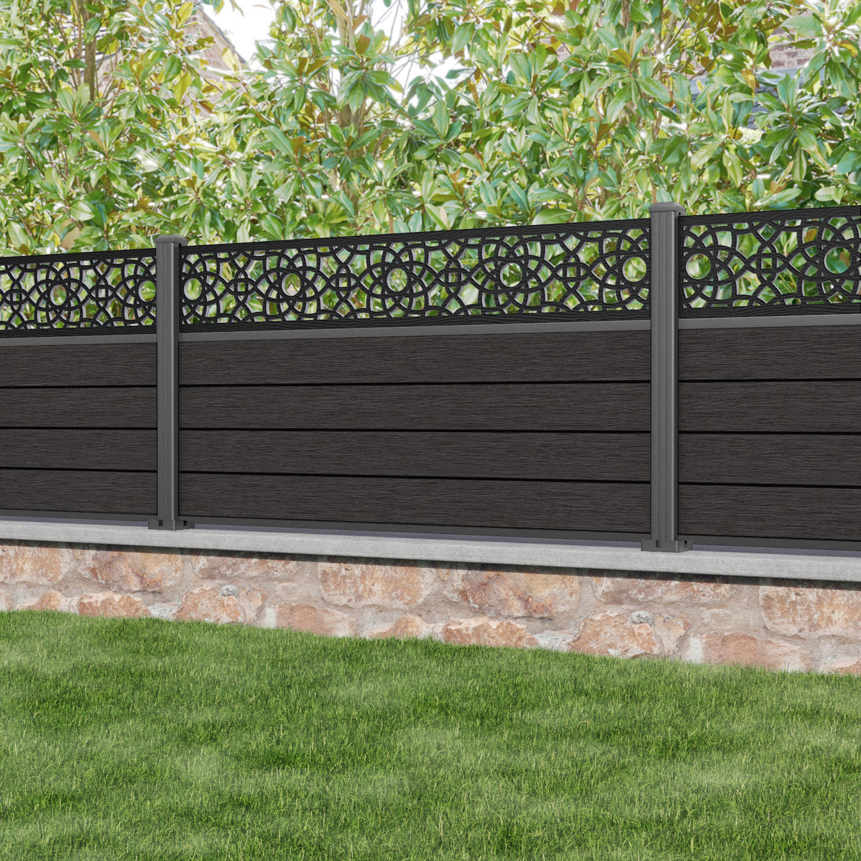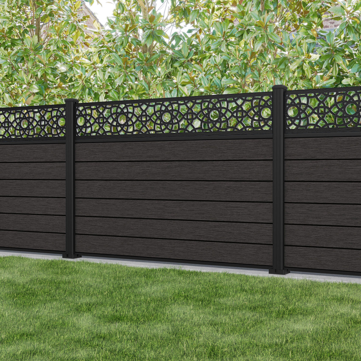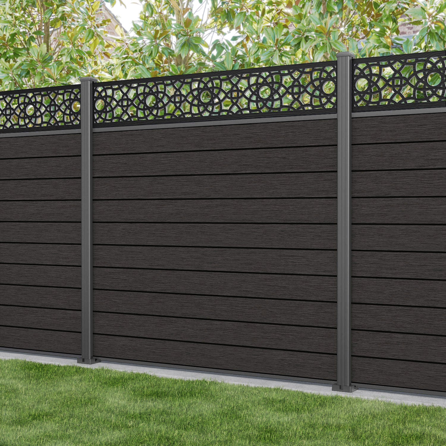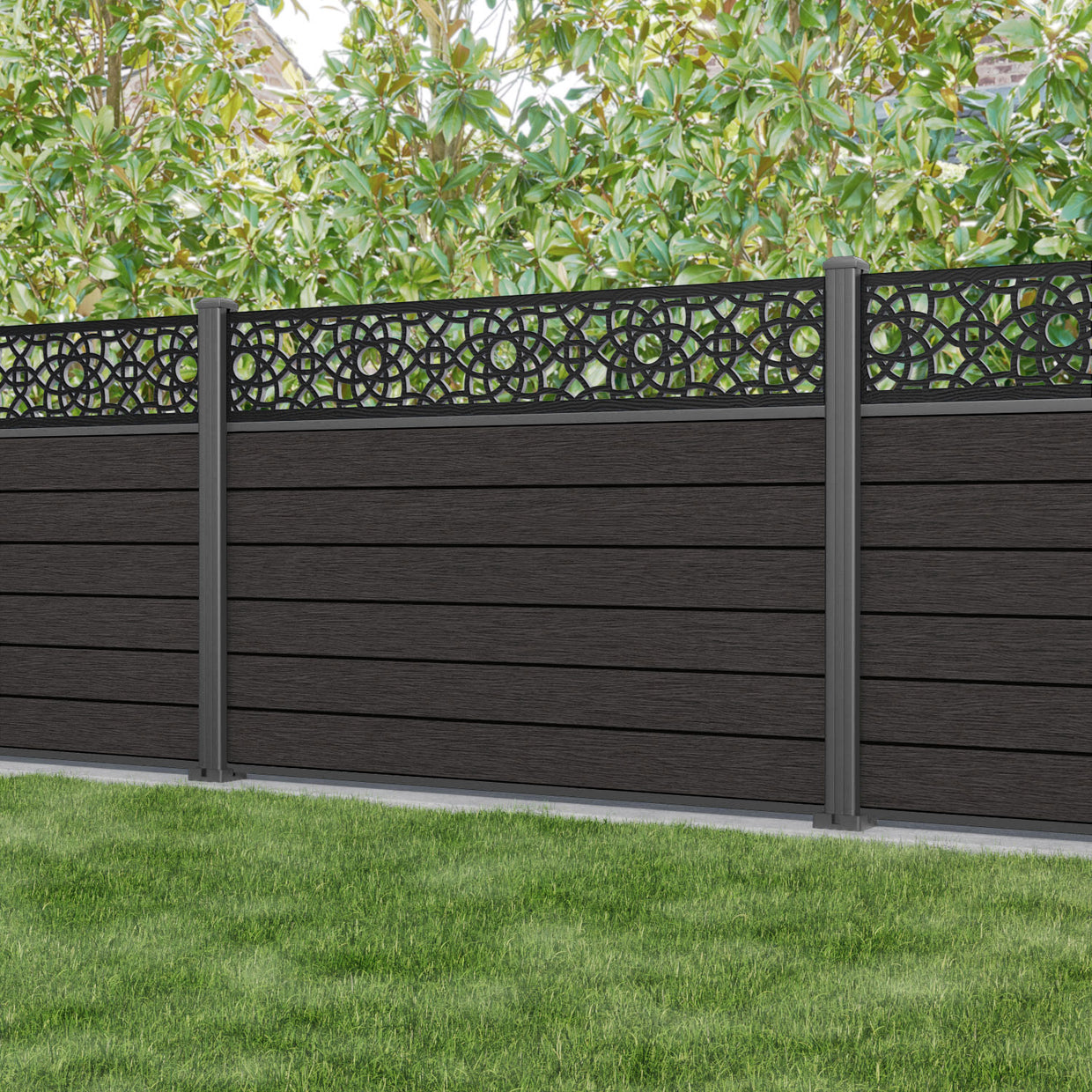 Fusion Ambar Fence Panel Dark Oak - with our aluminium posts