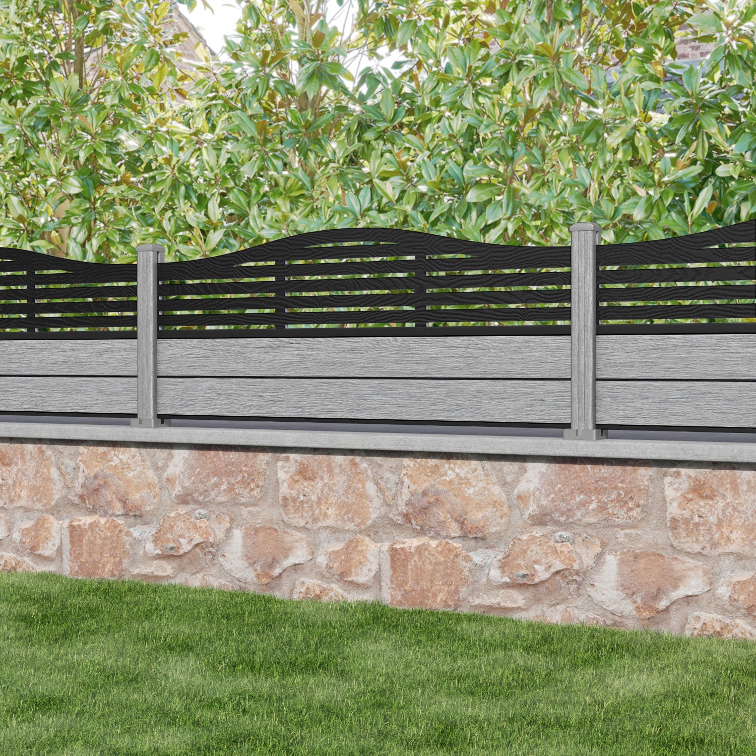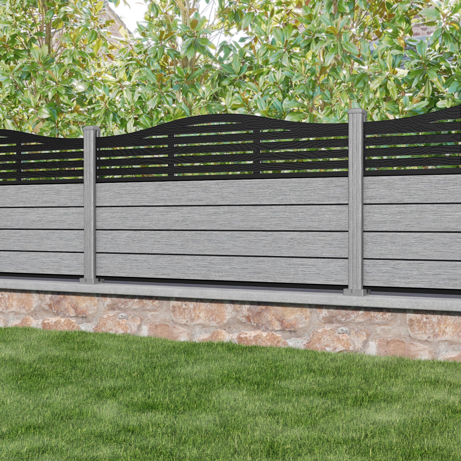 Our 18mm thick light grey premium composite fence slats paired with our composite posts and Aspen screen create an elegant, versatile, and eco-friendly fencing solution. Not only is this fencing responsibly sourced, it is also durable, long-lasting and requires no maintenance or painting.