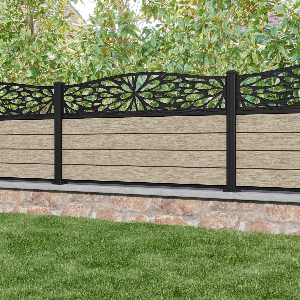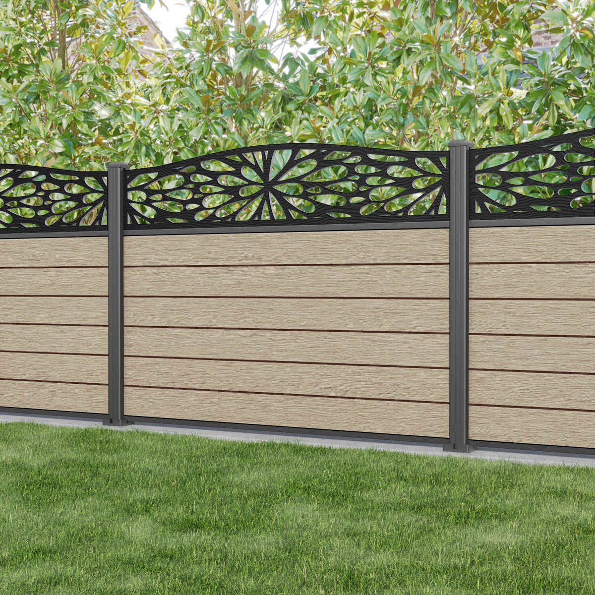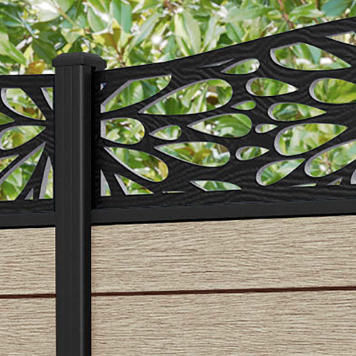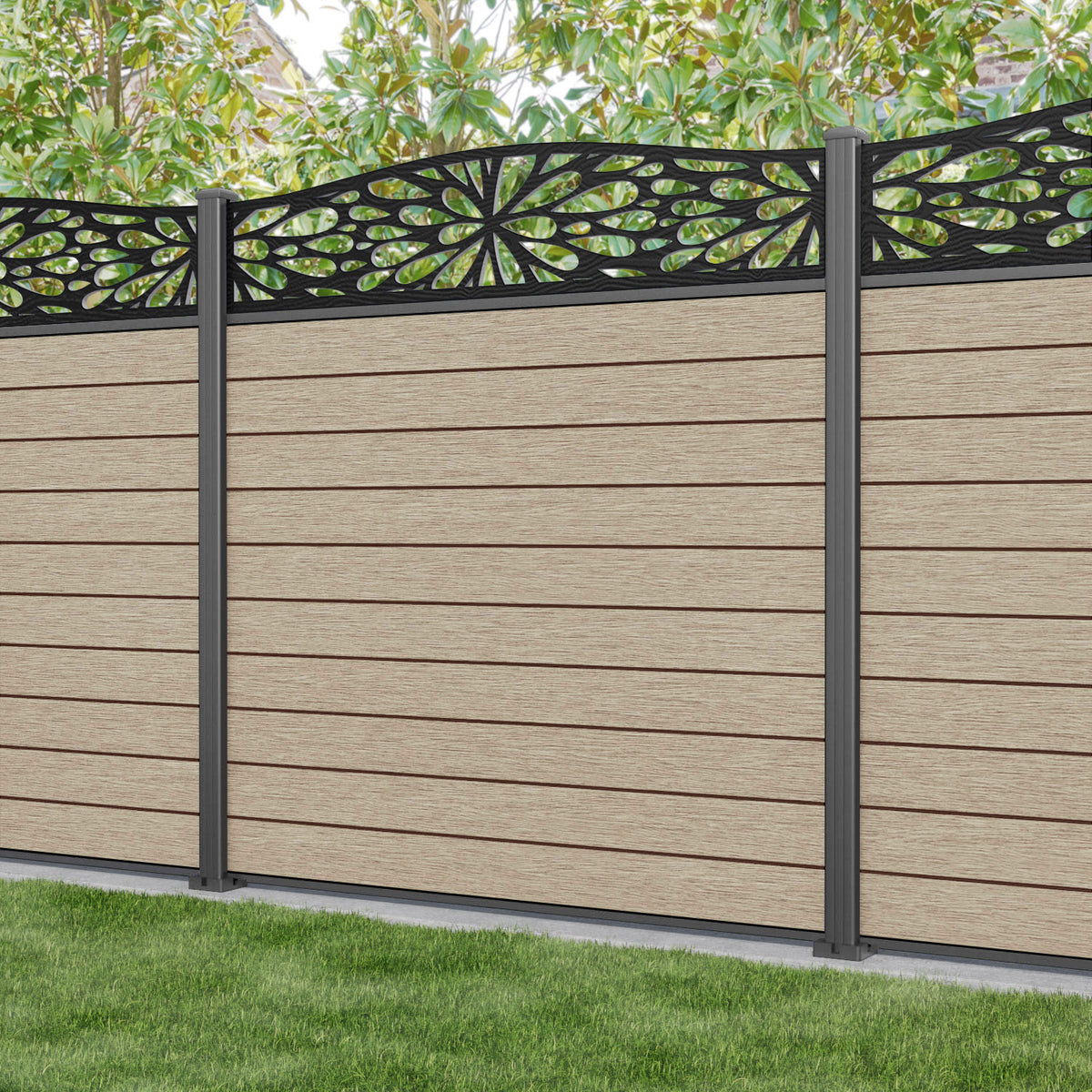 Fusion Blossom Curved Top Fence Panel Light Oak - with our aluminium posts