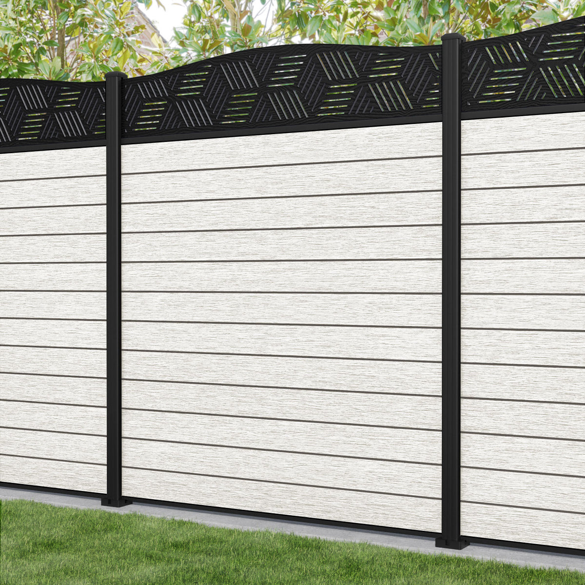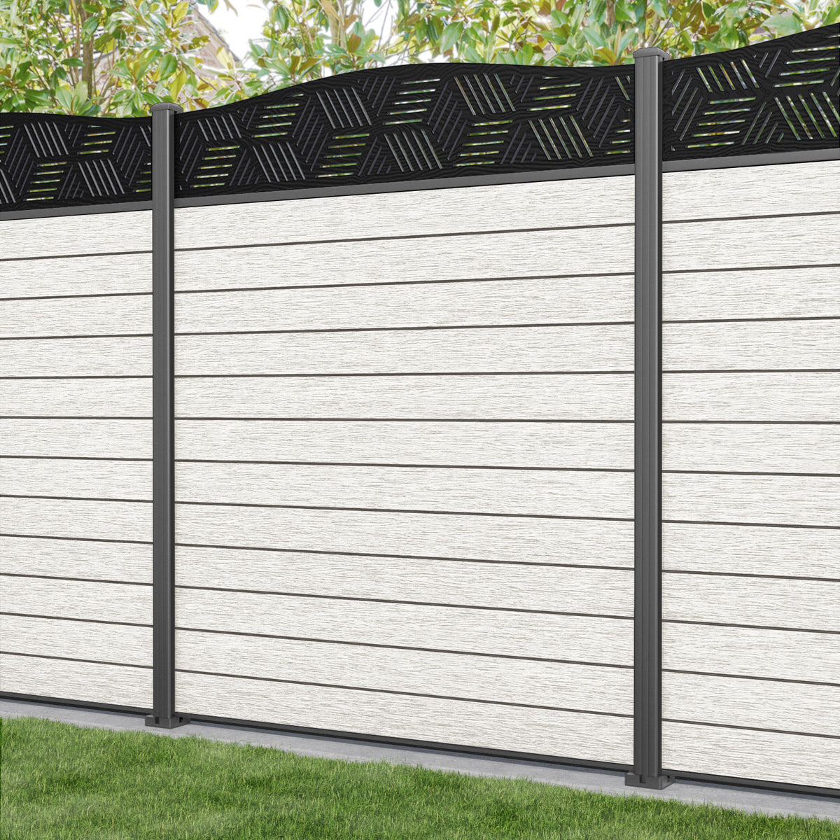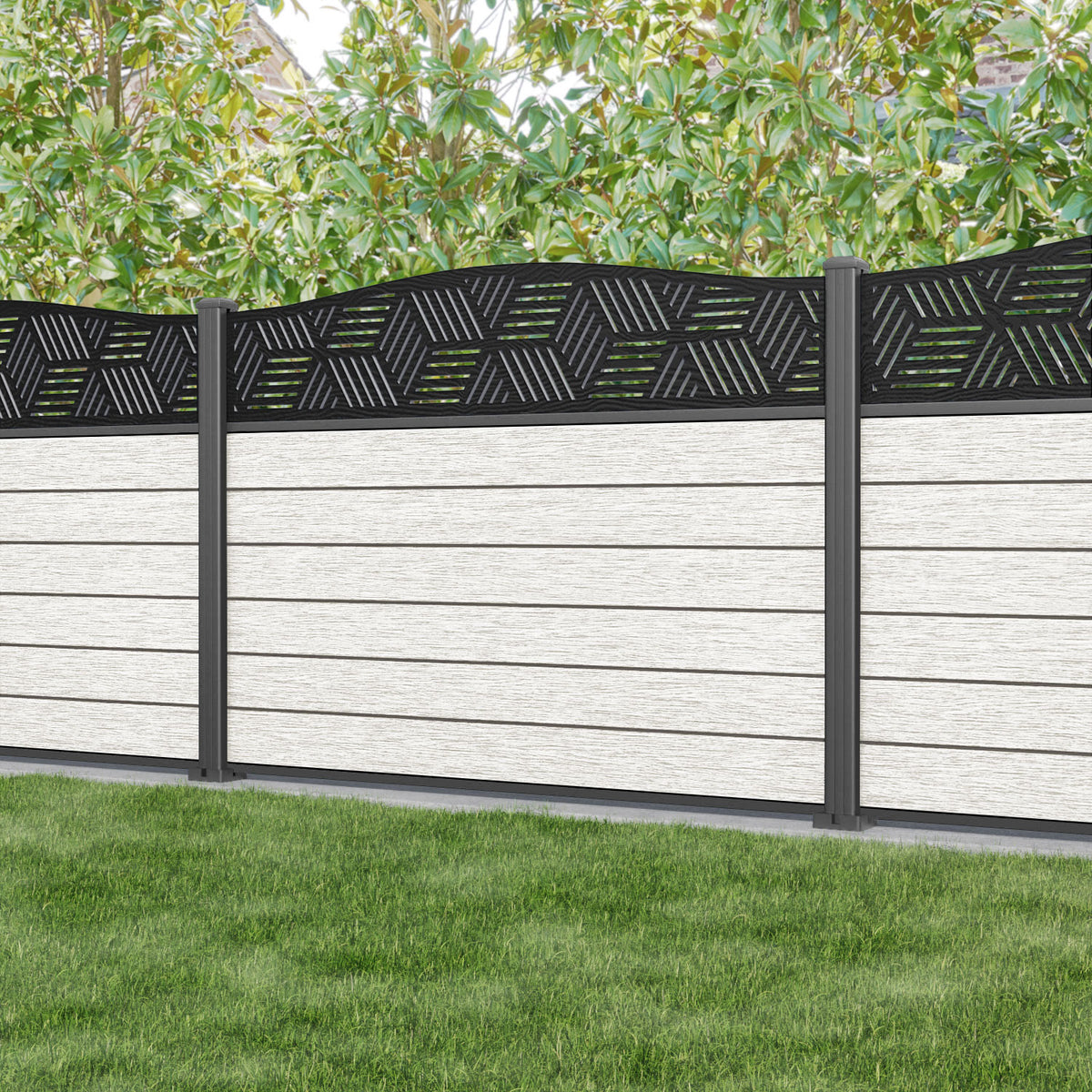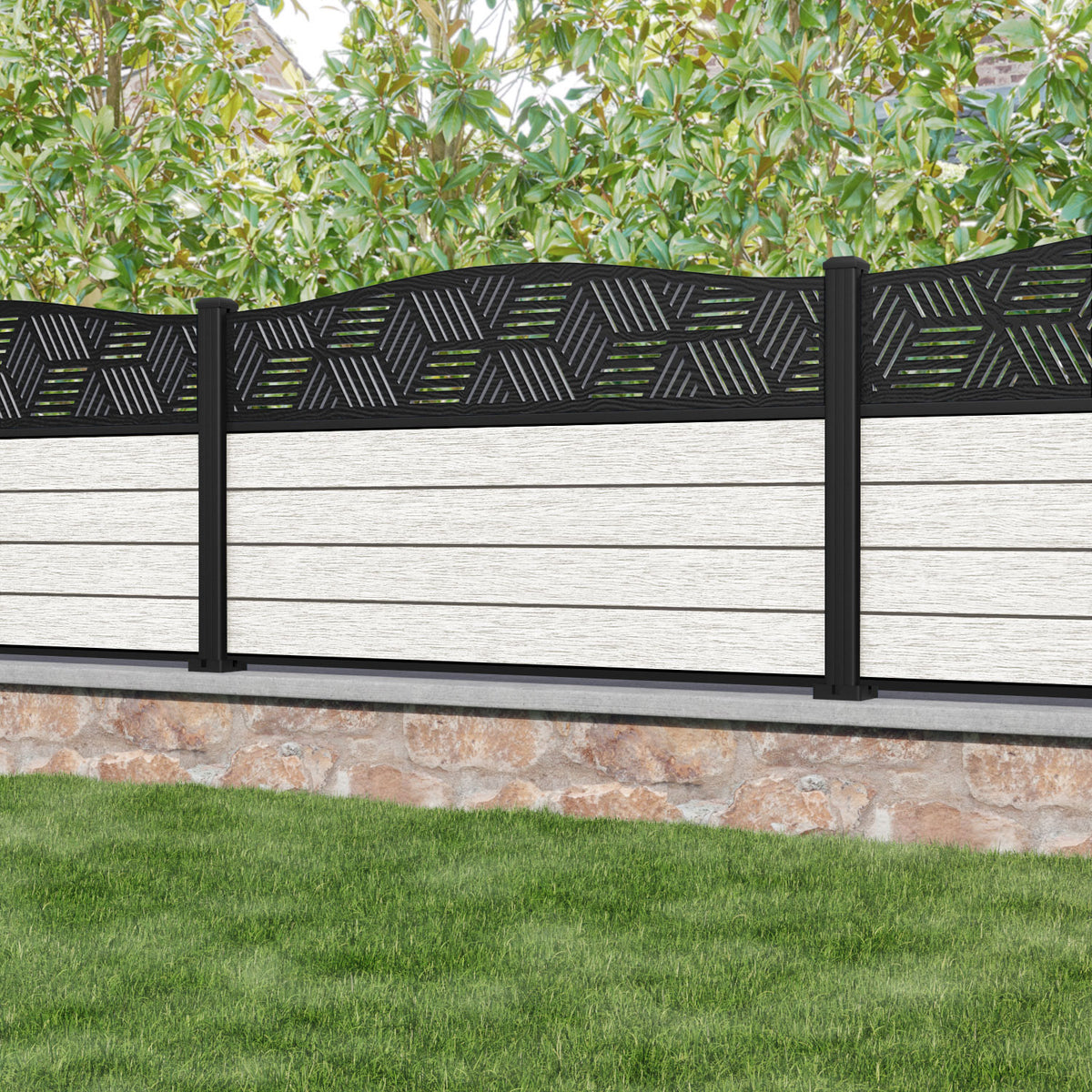 Fusion Cubed Curved Top Fence Panel Light Stone - with our aluminium posts