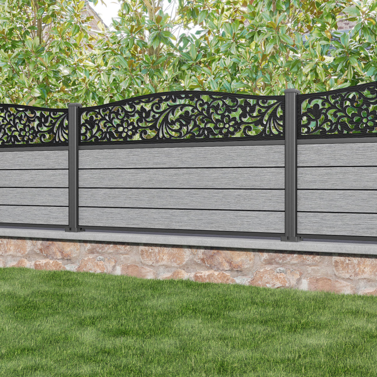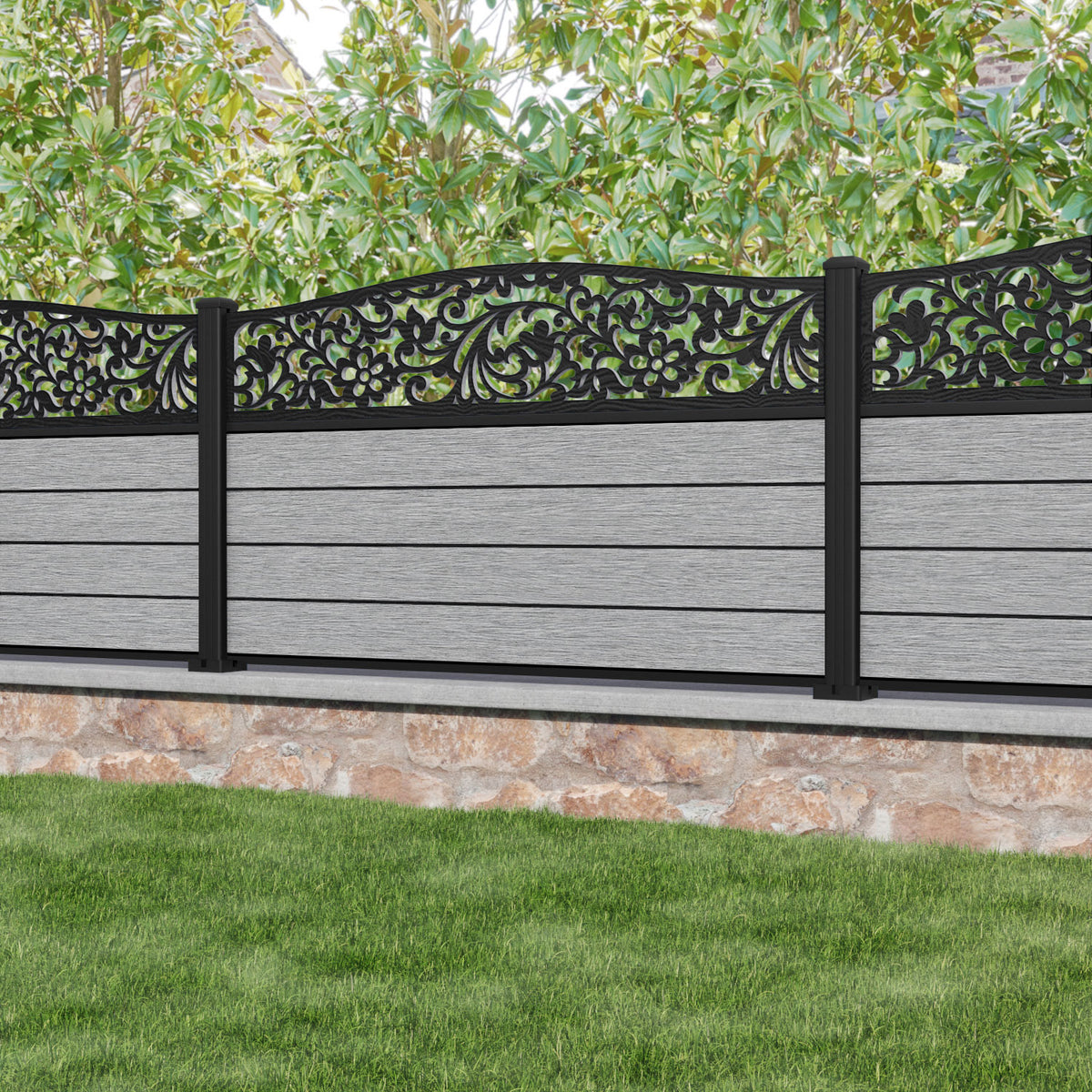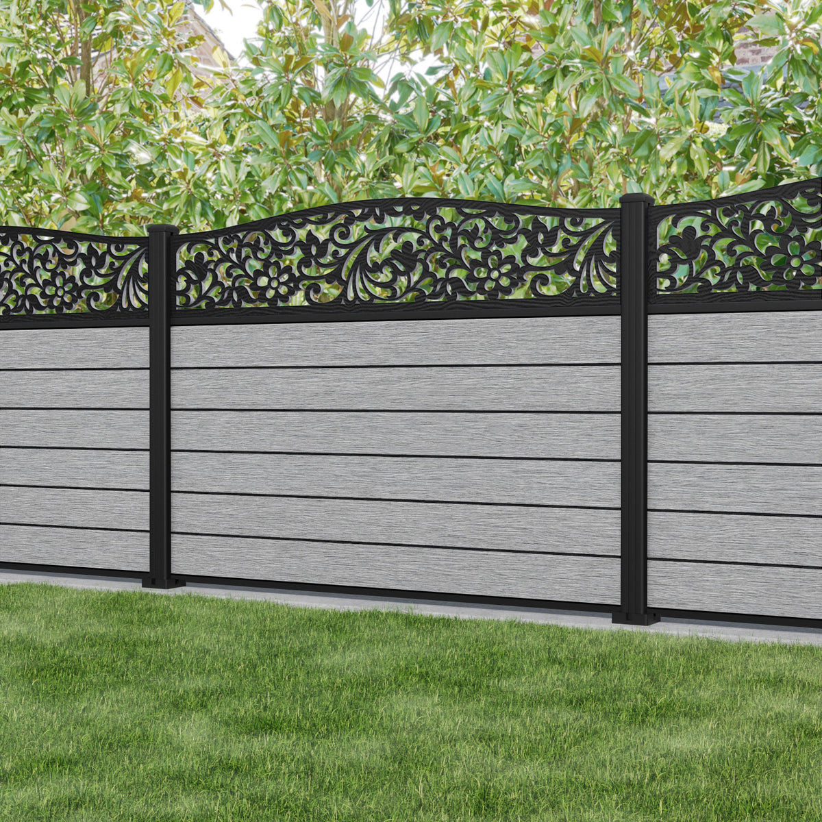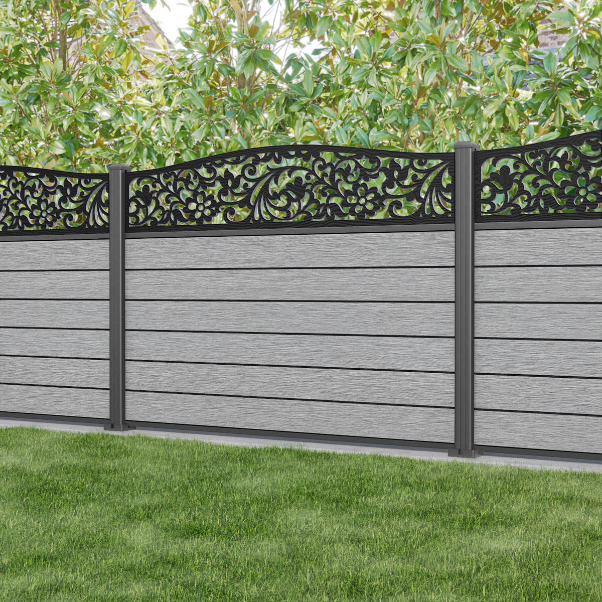 Fusion Eden Curved Top Fence Panel Light Grey - with our aluminium posts