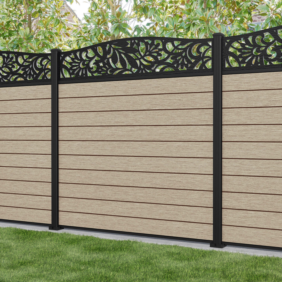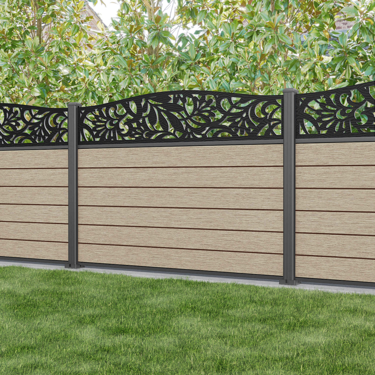 Fusion Heritage Curved Top Fence Panel Light Oak - with our aluminium posts