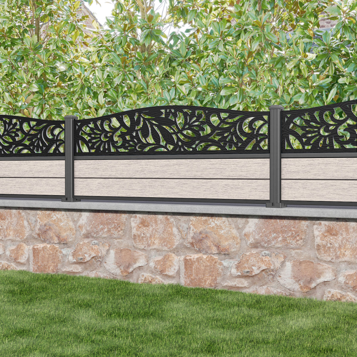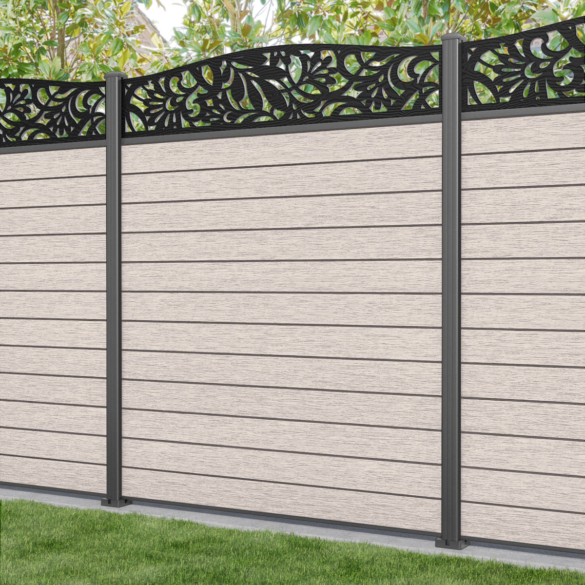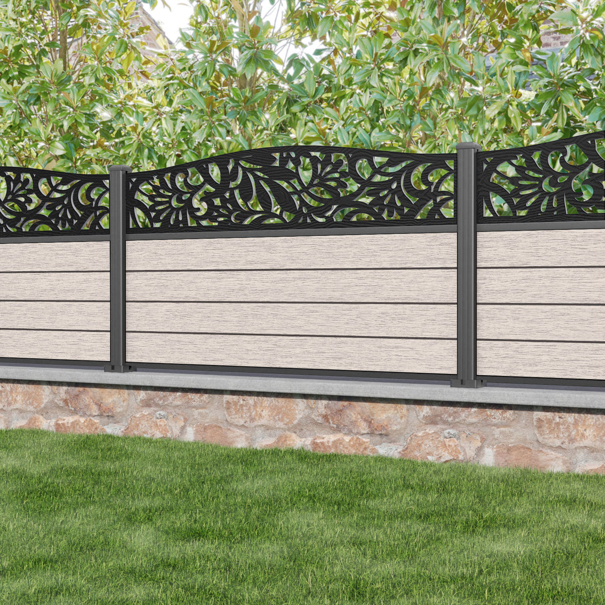 Fusion Heritage Curved Top Fence Panel Mid Stone - with our aluminium posts