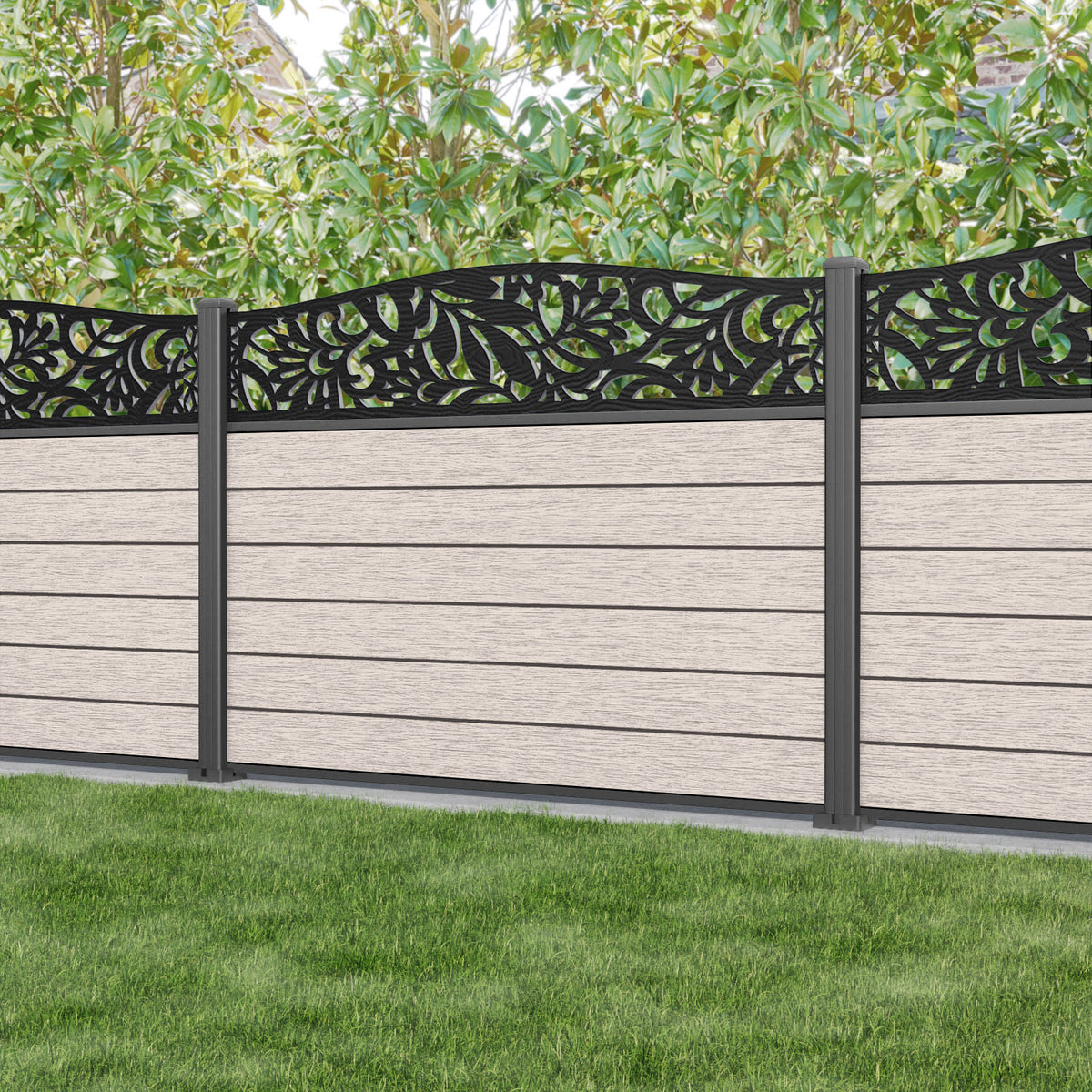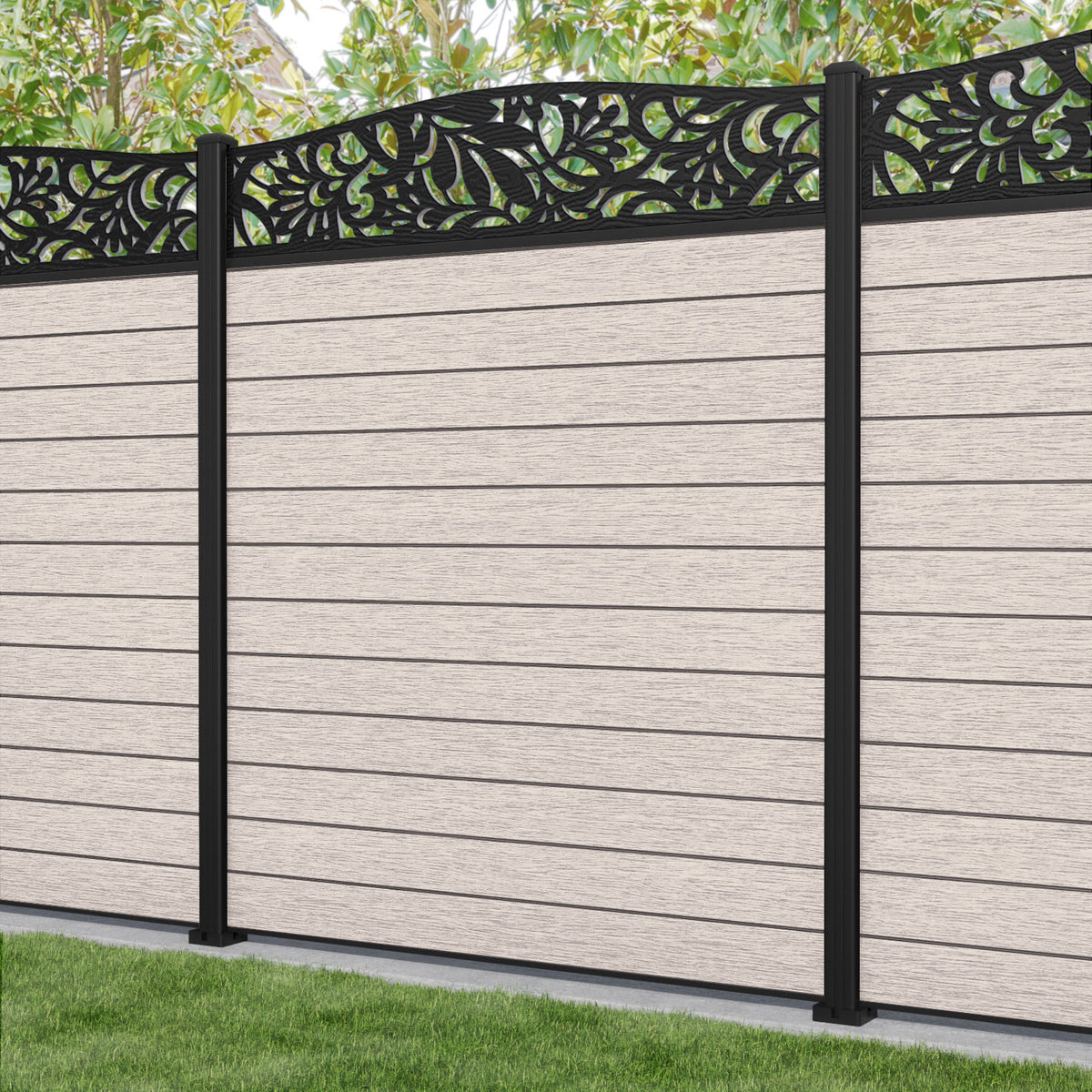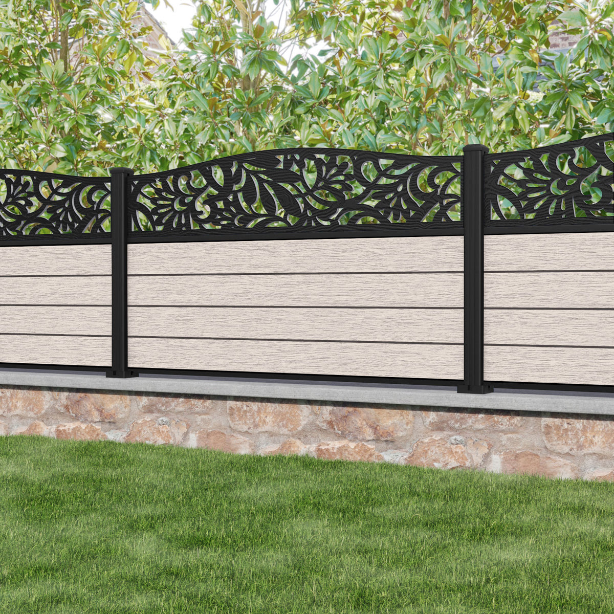 Fusion Heritage Curved Top Fence Panel Mid Stone - with our aluminium posts