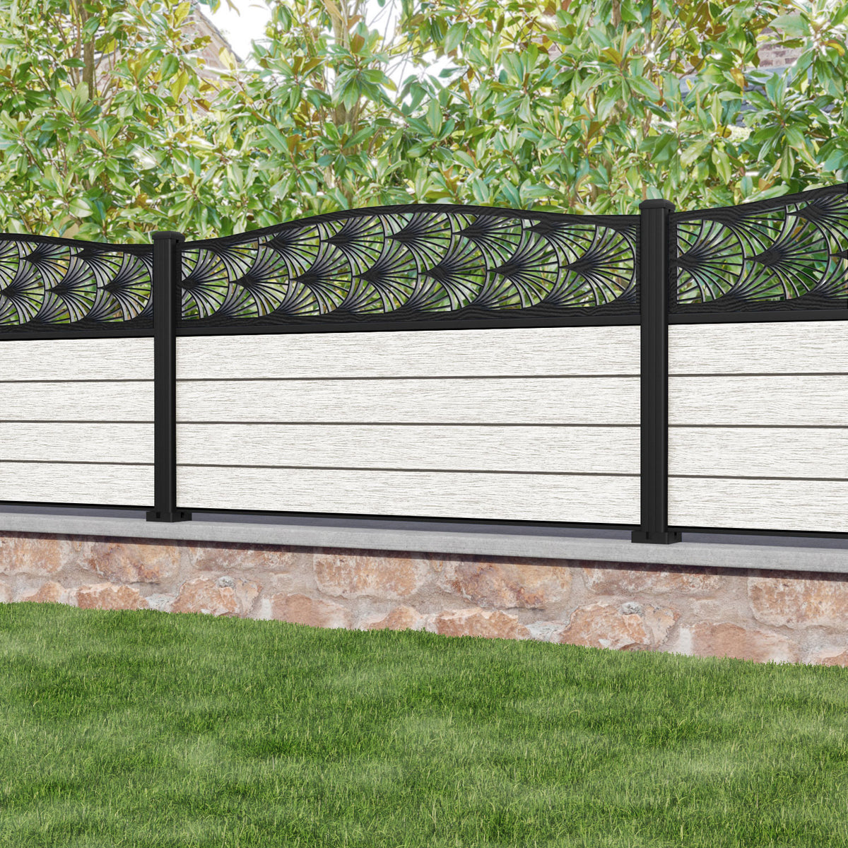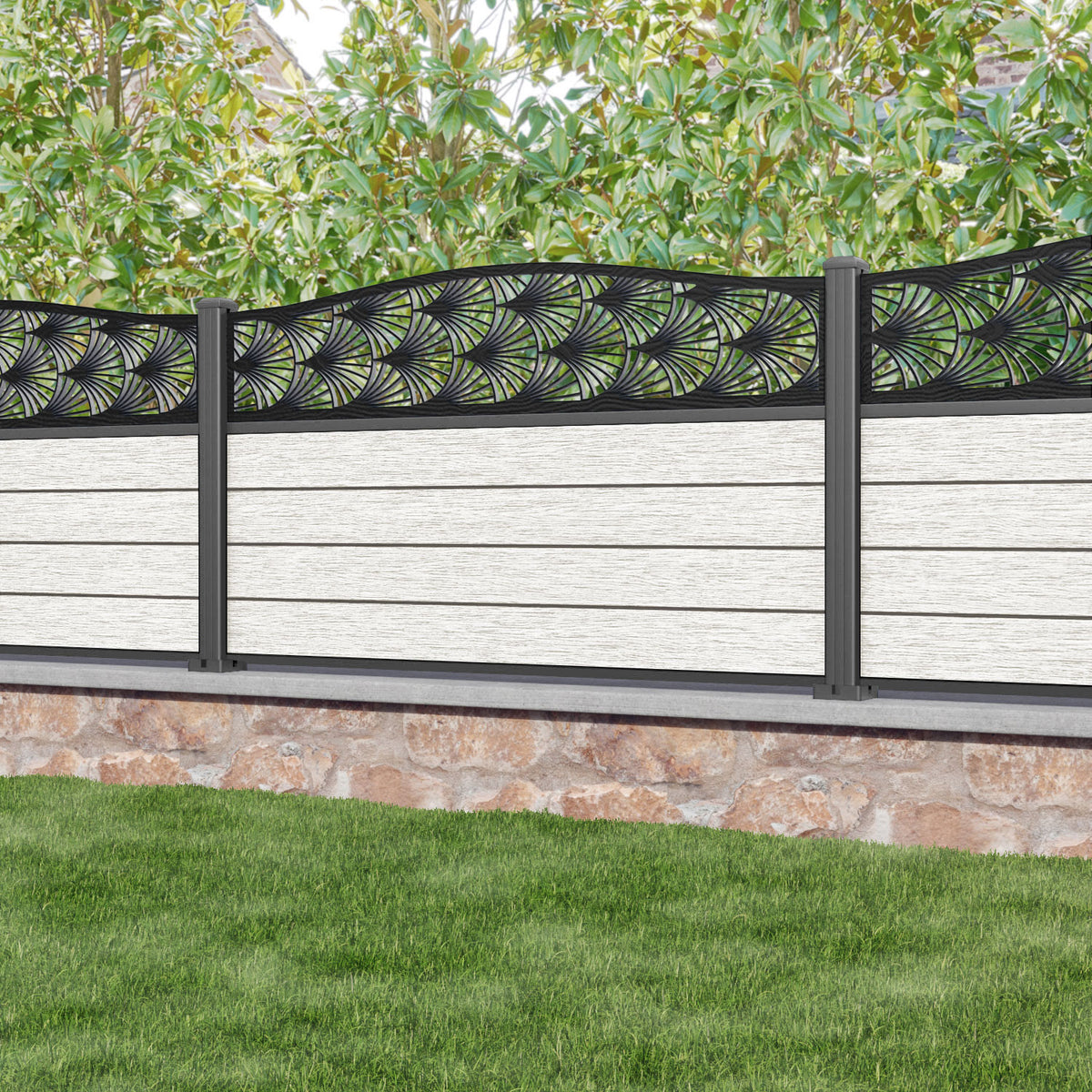 Fusion Laurel Curved Top Fence Panel Light Stone - with our aluminium posts